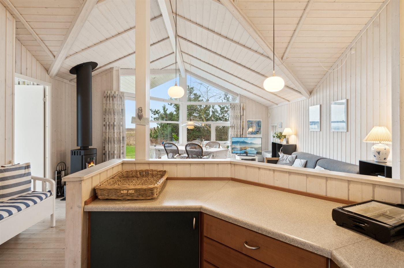 Die schöne Wohnküche in offener Verbindung mit dem Wohnzimmer und mit Zugang zur südlich ausgerichteten Holzterrasse bildet den natürlichen Mittelpunkt für Gemütlichkeit und Entspannung mit Freunden und Familie. Es gibt auch eine schöne Holzterrasse nach Westen.