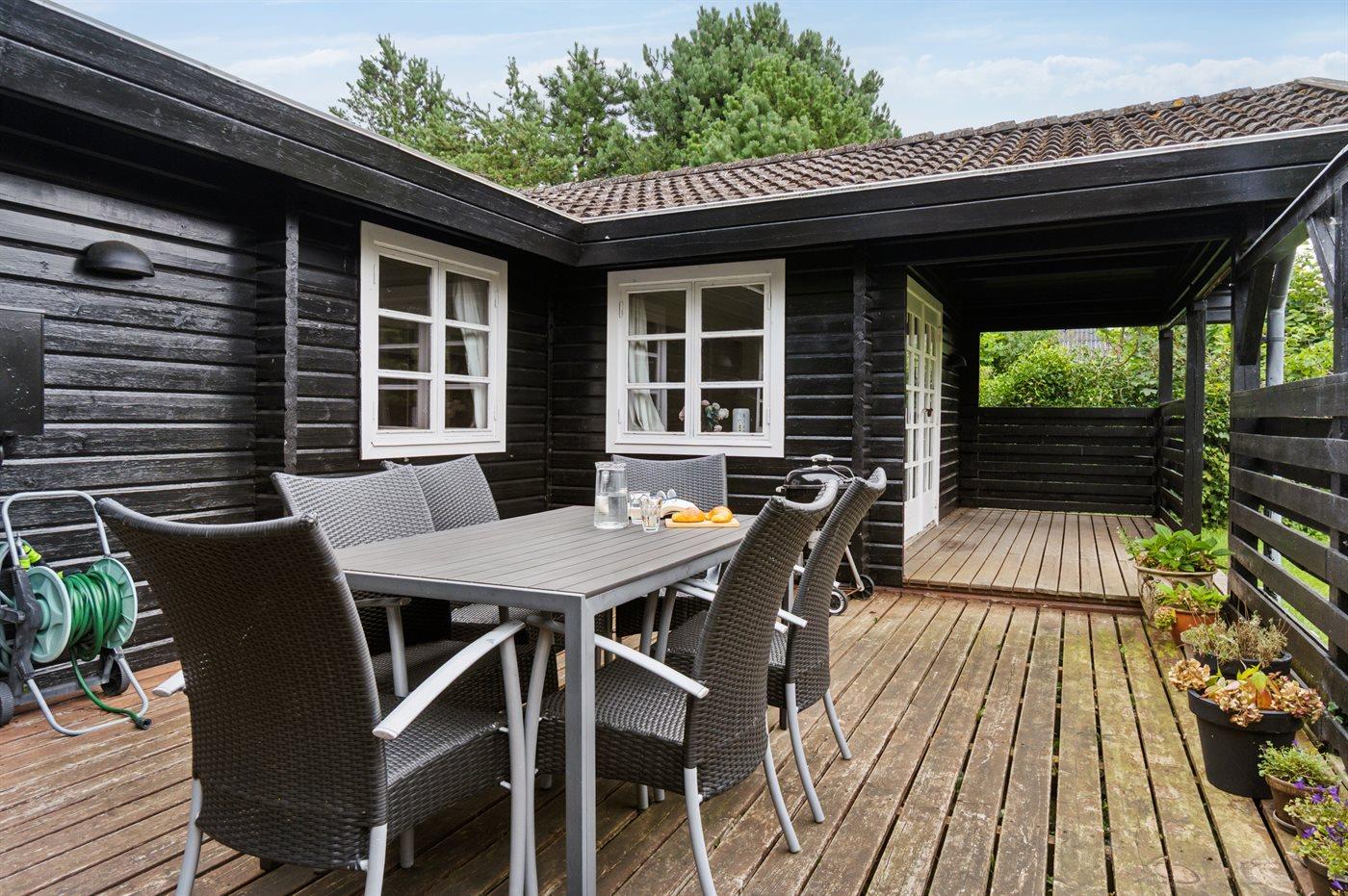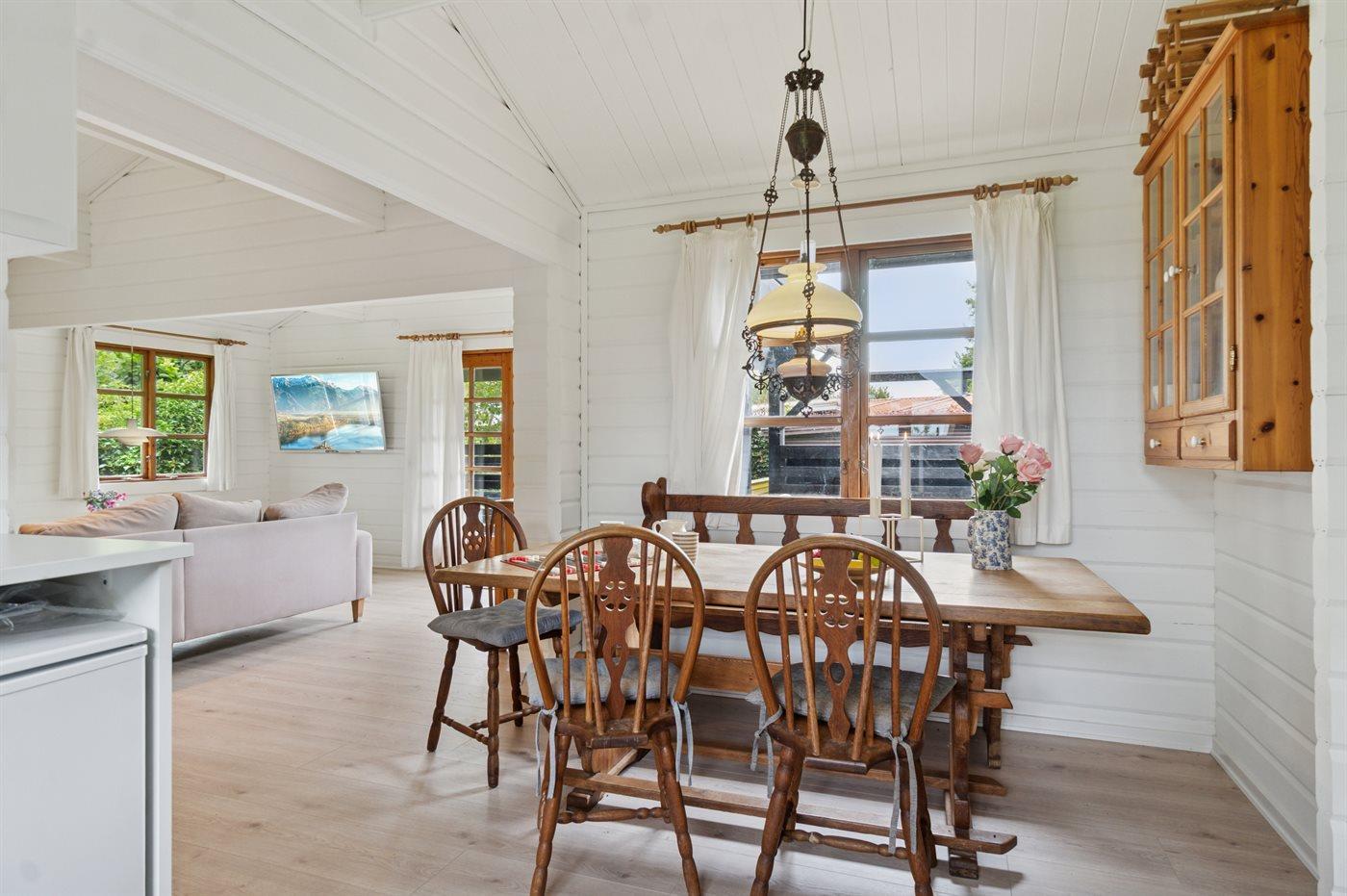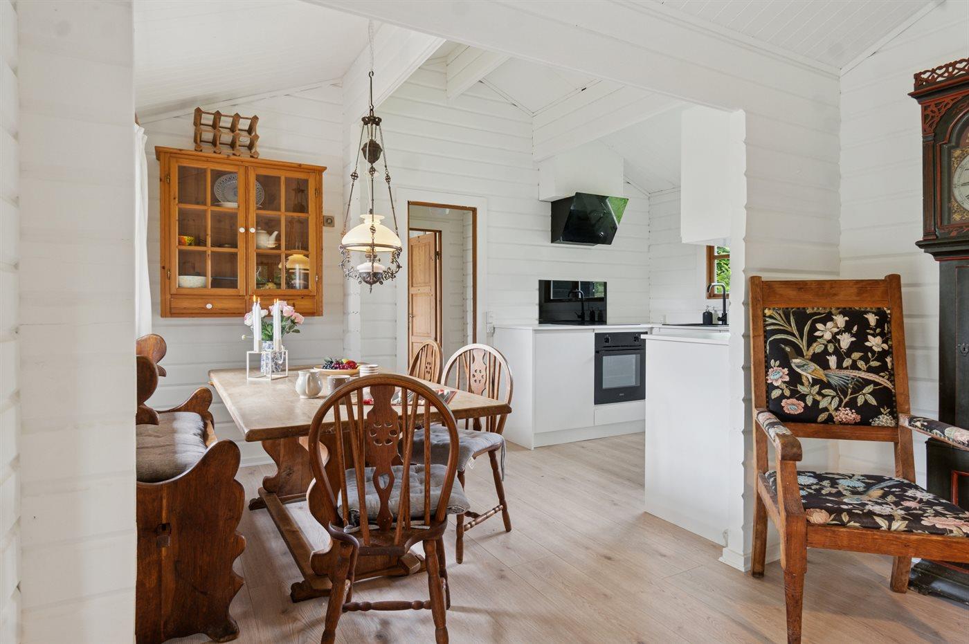 Im Ferienhaus gibt es eine gemütliche Wohnküche mit einer neuen, modernen Küche, und von hier gelangst du auf die südlich ausgerichtete Terrasse, die teilweise überdacht ist.