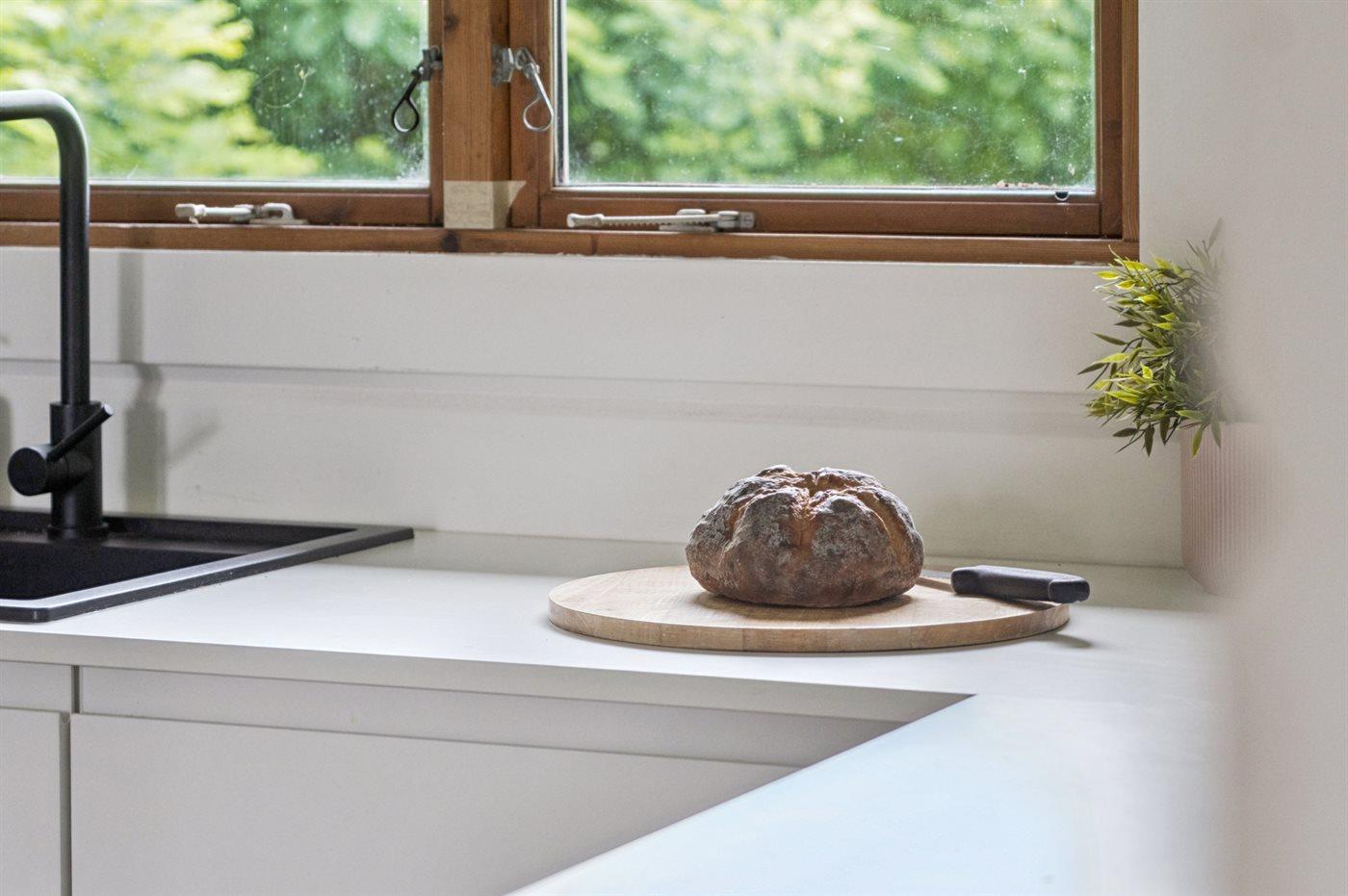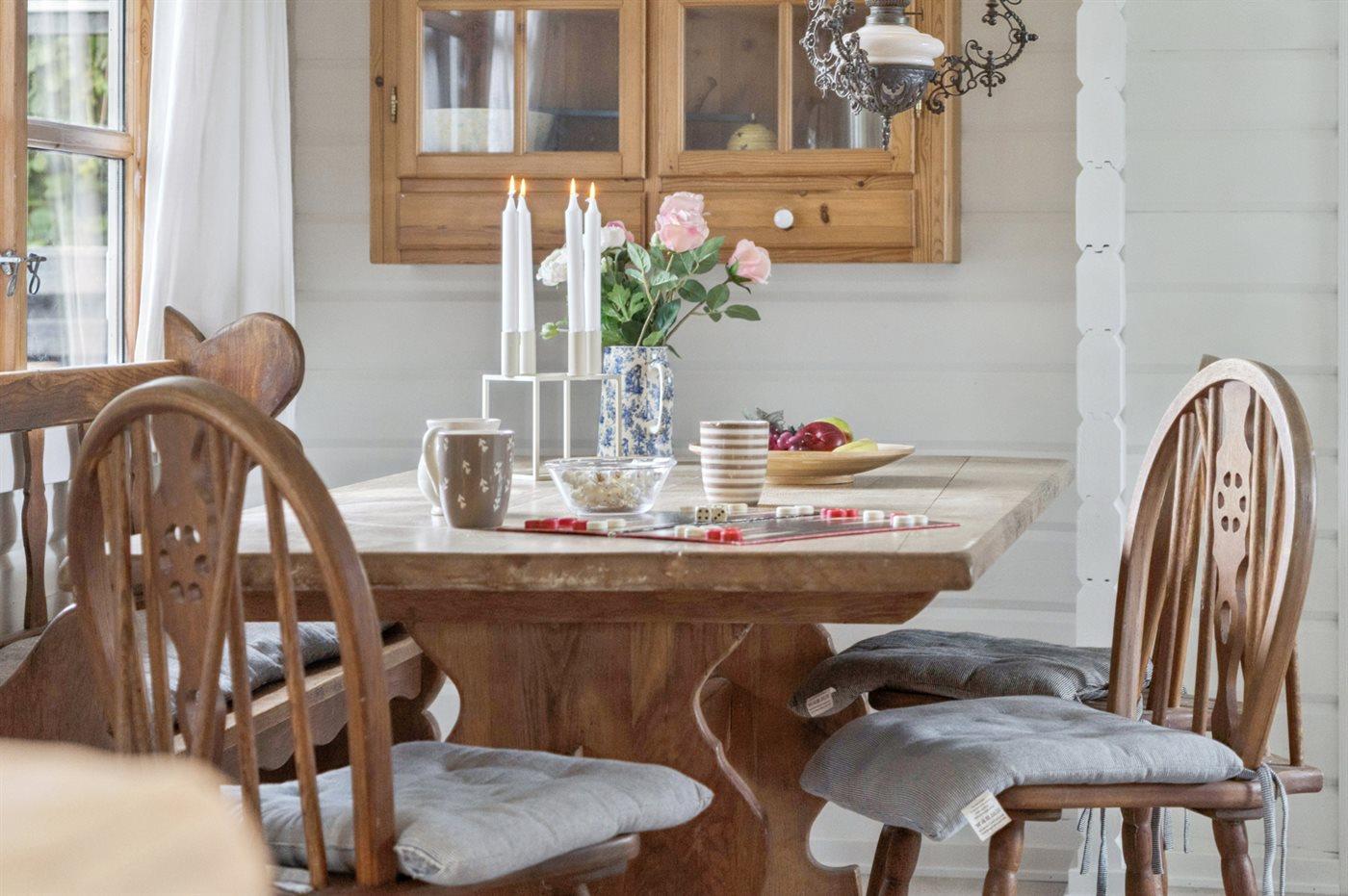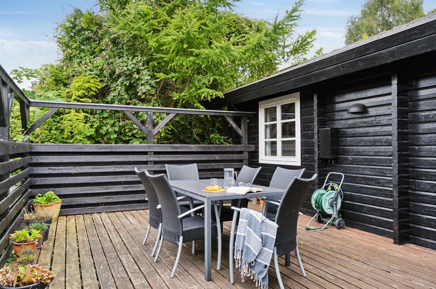 Im Ferienhaus gibt es eine gemütliche Wohnküche mit einer neuen, modernen Küche, und von hier gelangst du auf die südlich ausgerichtete Terrasse, die teilweise überdacht ist.