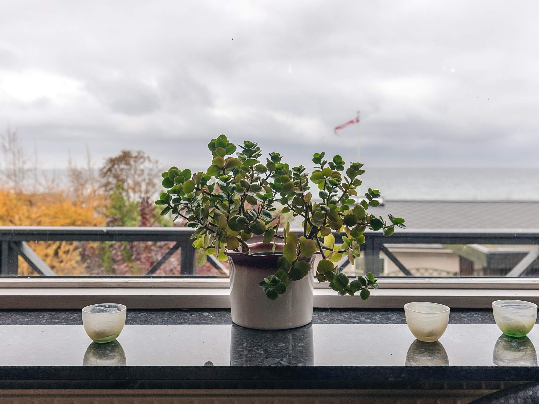 Hochgelegenes, authentisches Ferienhaus in zweiter Reihe mit herrlichem Blick auf das Wasser und die Große-Belt-Brücke.