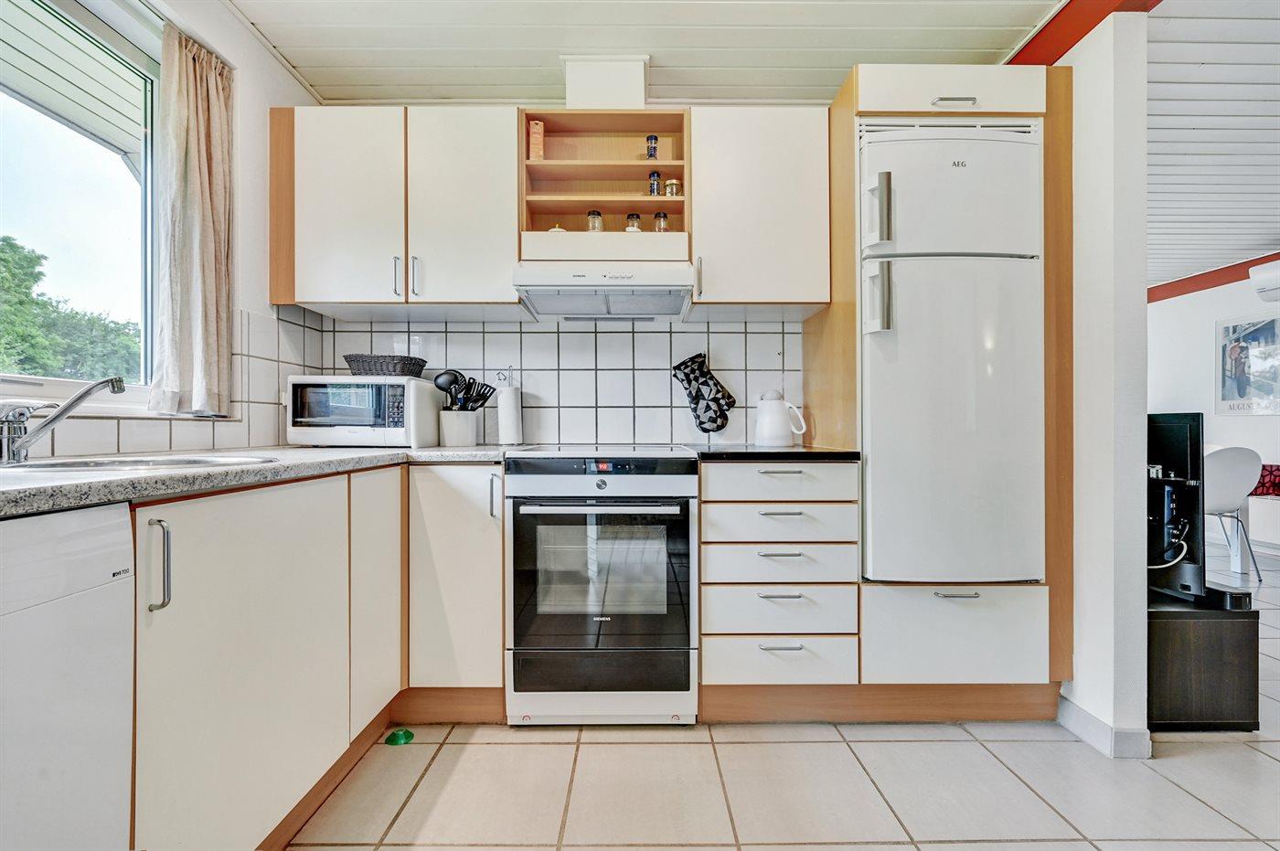 Die Küche ist mit Kühlschrank ausgestattet. Außerdem gibt es 4 Induktions-Kochzonen, Umluftofen, Mikrowelle sowie Geschirrspüler.