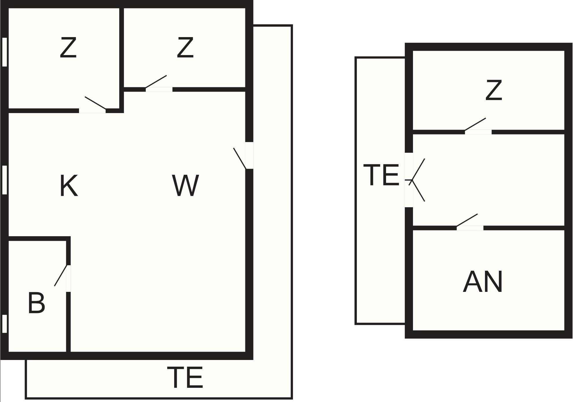 Im Haupthaus gibt es einen Aufenthaltsraum mit offen integrierter, gut ausgestatteter Küche. TV nur zum Streamen eigener Anbieter per Chromecast (keine Senderauswahl). Alle Schlafzimmer sind mit bequemen Betten ausgestattet. Der Annex nebenan kann z.B. von älteren Kindern oder mitreisenden Freunden und Großeltern genutzt werden. Zum Ferienhaus gehört auch eine große Holzterrasse für Sonnentage und Grillabende. Zudem Rasenfläche für Aktivitäten im Freien vorhanden. Das Grundstück grenzt zur einen Seite an ein Waldstück. Kein Gas bzw. keine Grillkohle vorhanden.\