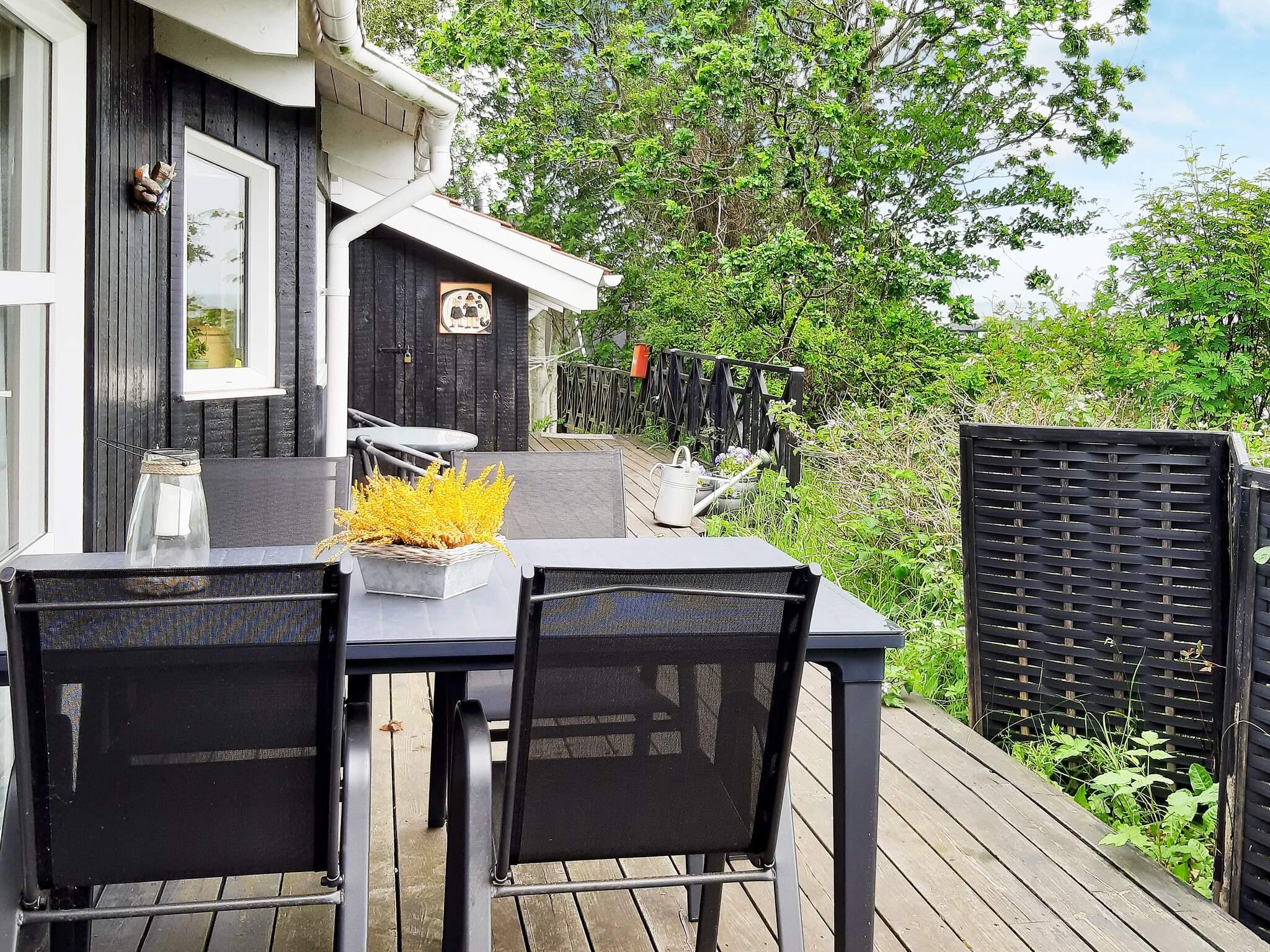 Das Ferienhaus steht etwas erhöht, auf einem leicht hügeligen Naturgrundtück mit Ausblick über die Dächer der umliegenden Häuser und bis zum Meer. Die teilweise überdachte Terrassenfläche ist zugleich schön abgeschirmt und quasi einblickfrei. Vom Parkplatz unterhalb führt eine Treppe die Schräge hinauf zum Hauseingang.