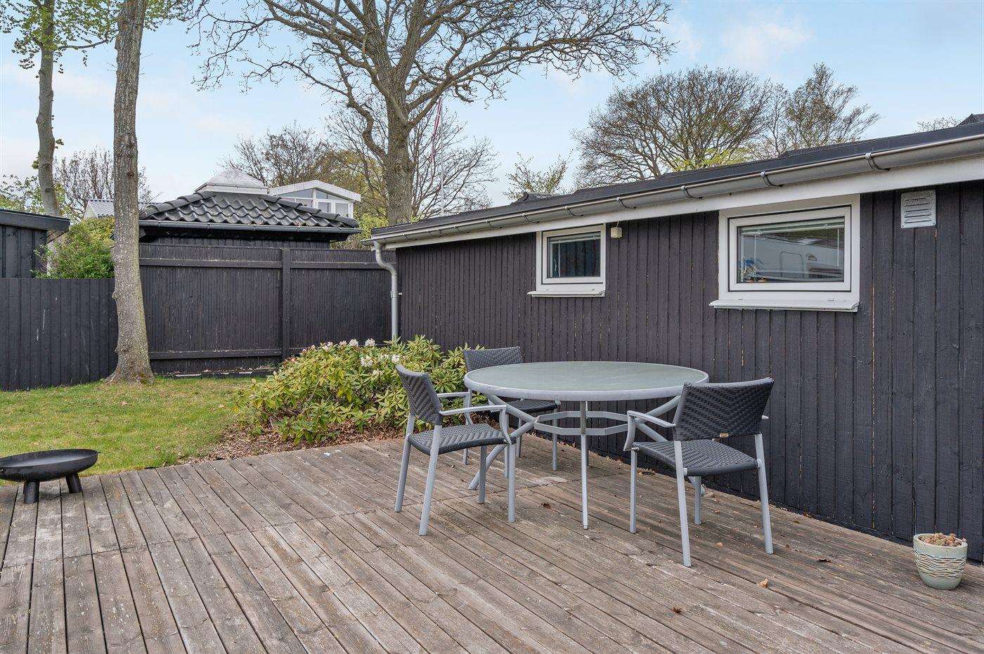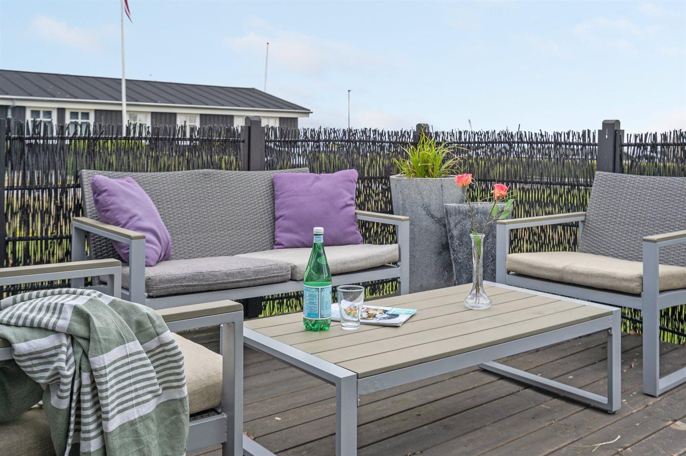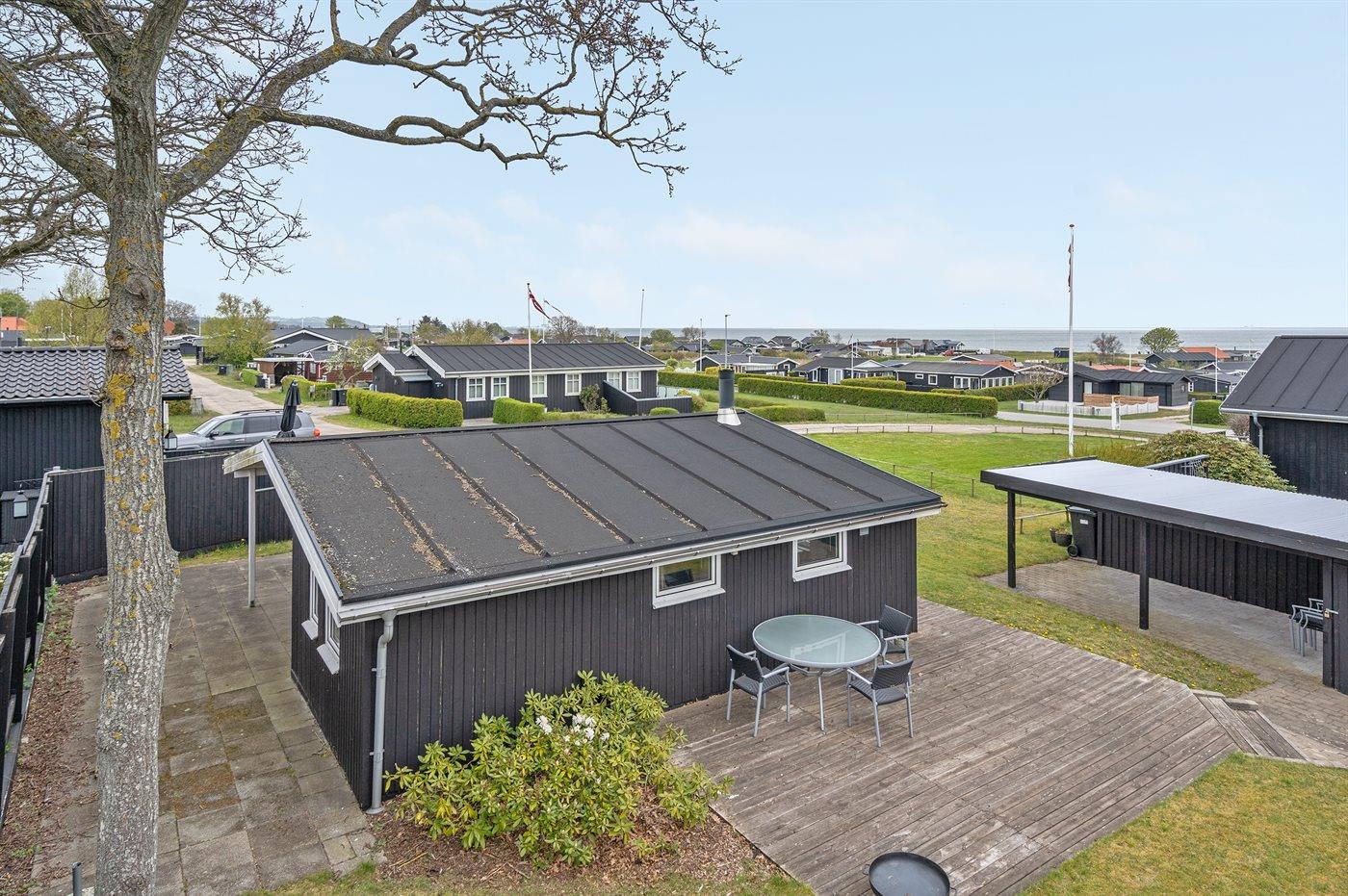 Charmantes Ferienhaus mit Meerblick, Terrasse und Nähe zum Hafen in Sæby, ideal für entspannte Sommerferien.