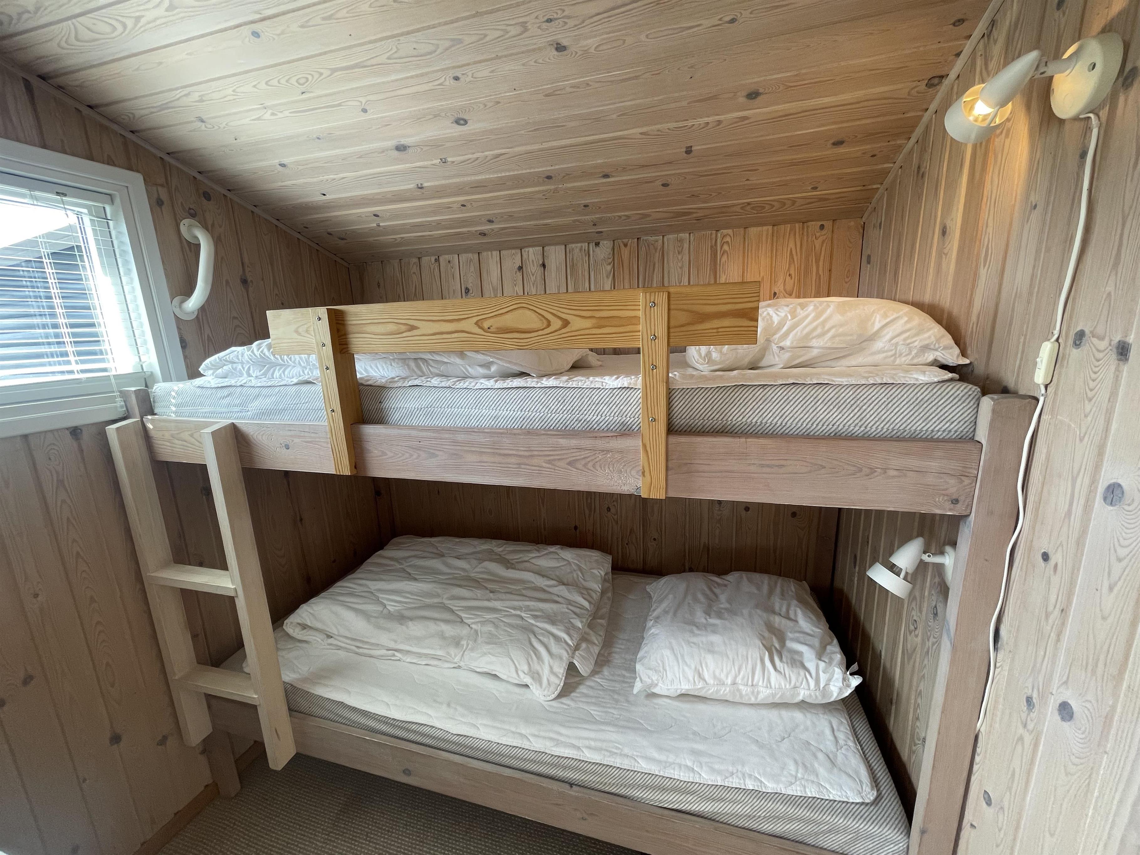 Das Haus verfügt über 3 Schlafzimmer. Eines mit einem Doppelbett, eines mit einem Etagenbett und eines mit einem Einzelbett. Die Etagenbetten und das Einzelbett sind nur 180 cm lang und eignen sich daher am besten für Kinder.