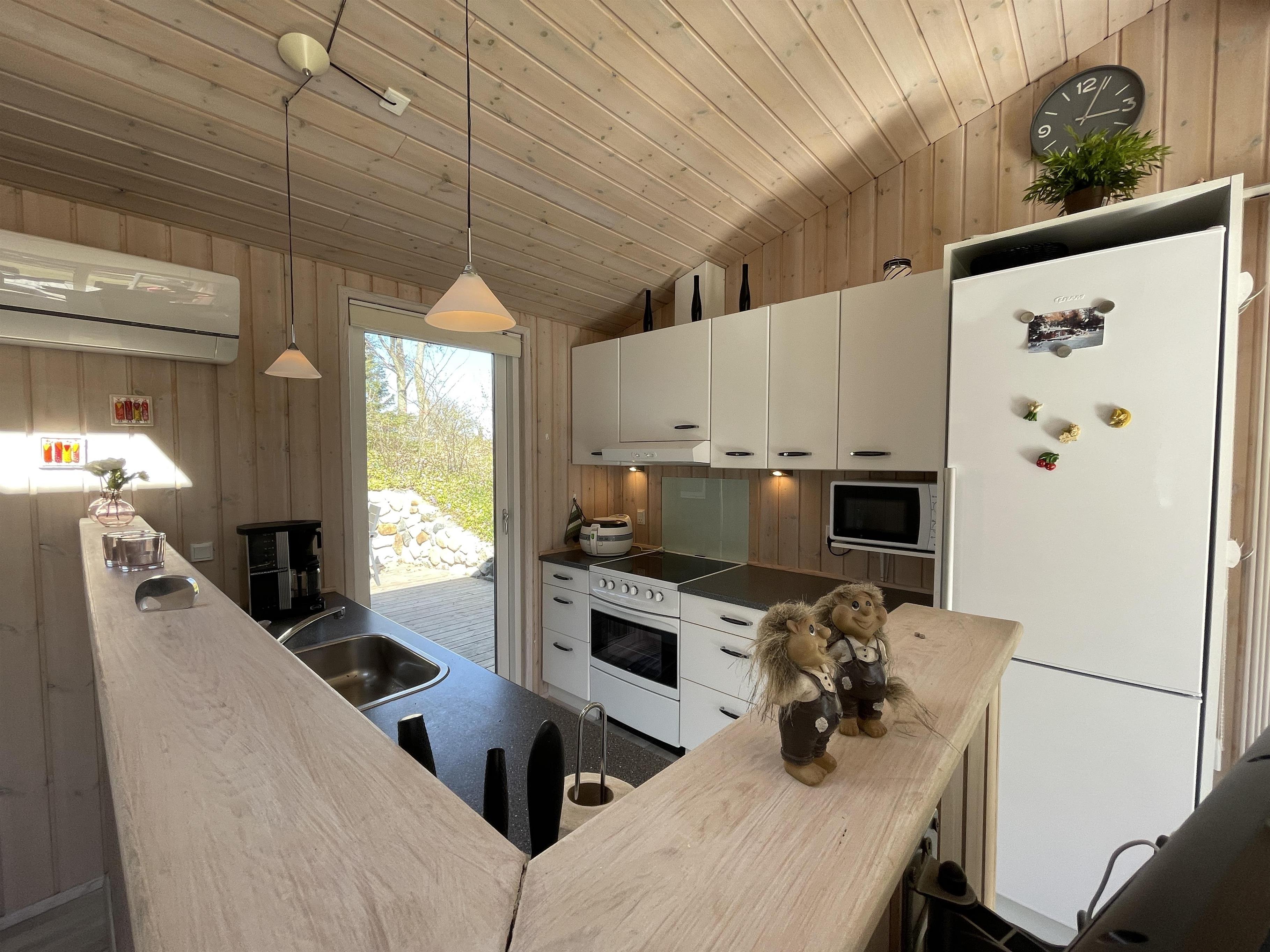 Dieses gemütliche kleine Ferienhaus ist modern eingerichtet mit einer großen Wohnküche, einem Essbereich und einer Sofaecke mit Kamin.