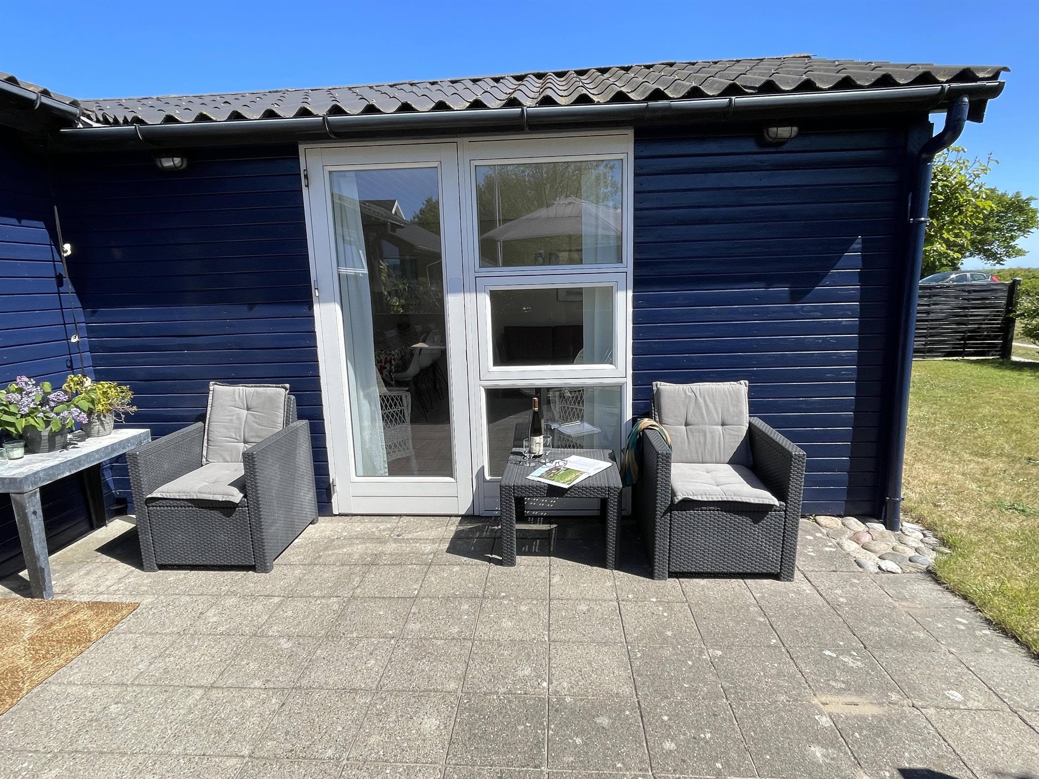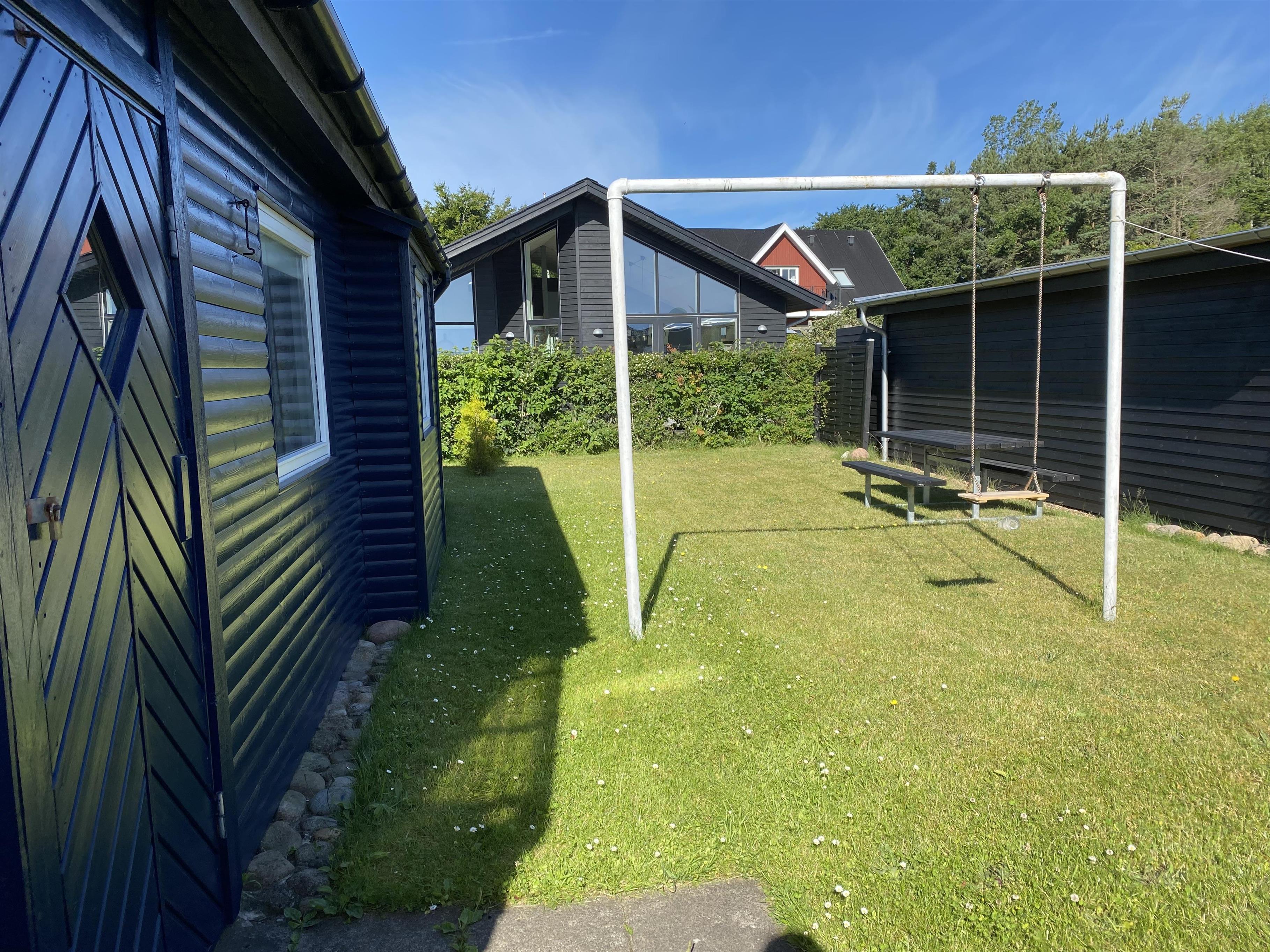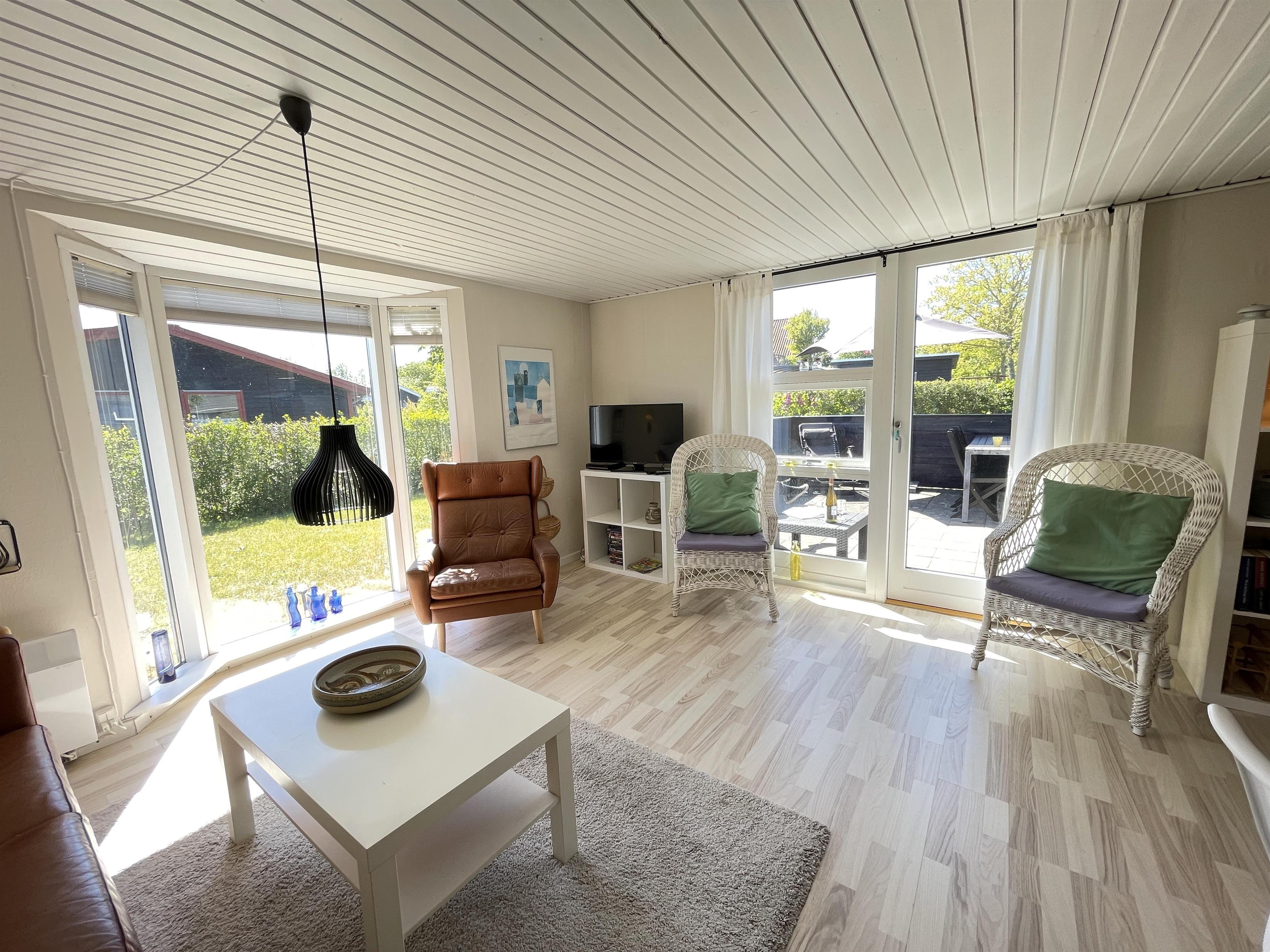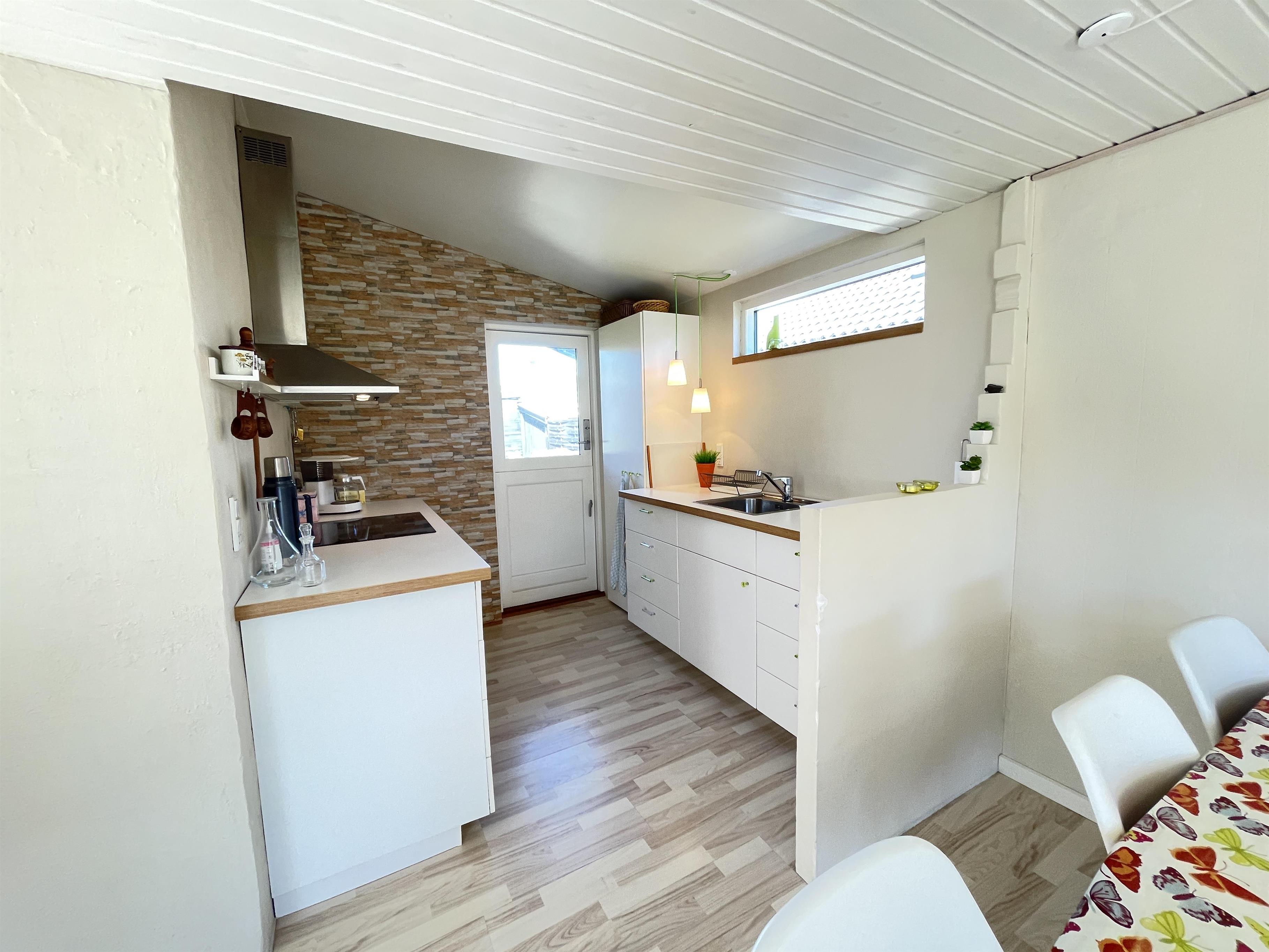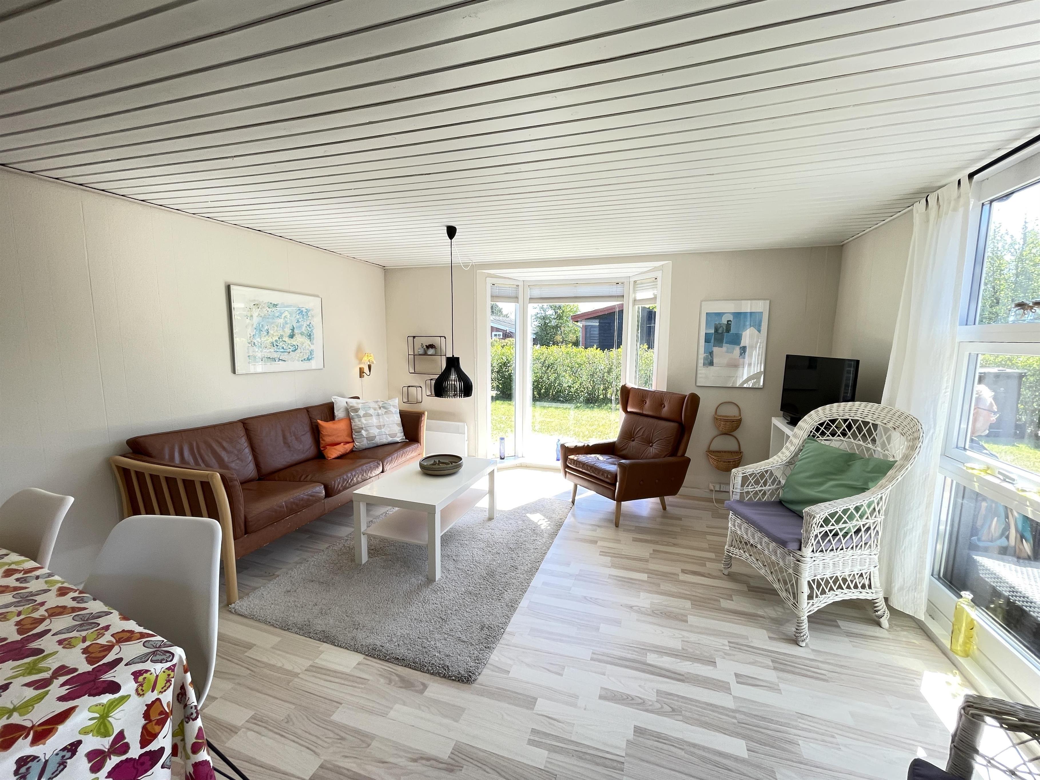 Das Haus ist klein, aber sehr funktional, mit drei Schlafzimmern und einer Küche/Wohnbereich mit Terrassentür und kleinem Erker, der einen Blick in den Garten bietet. Das Haus hat ein schön modernisiertes Badezimmer und eine generell schöne Einrichtung mit feinen Details. Es gibt eine Fußbodenheizung im Badezimmer, im Flur und im Küchenbereich. Eine kleine gemütliche abgeschirmte Terrasse, auf der man die Sonne oder Mahlzeiten während des Urlaubs genießen kann. Es gibt auch Schaukeln und einen Sandkasten für viele Stunden Spielspaß für die Kinder.