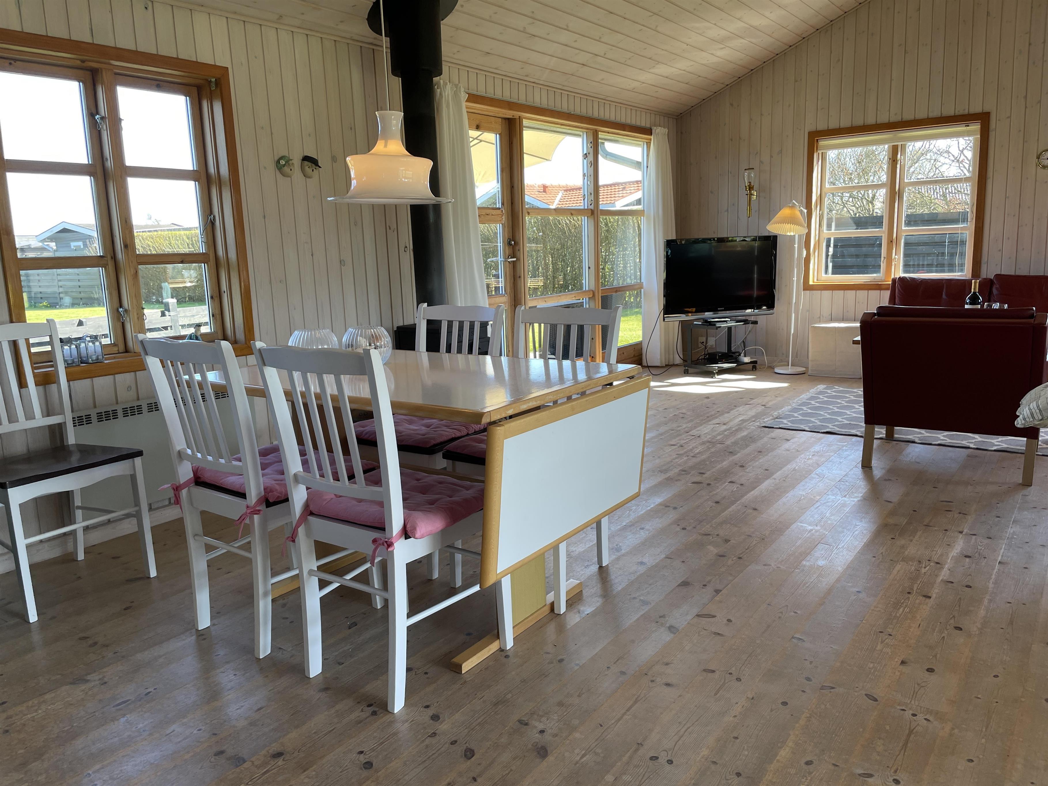 Im Haus finden 6 Personen Platz, verteilt auf drei gemütliche Schlafzimmer sowie ein Etagenbett am Eingang. Wenn Sie eintreten, werden Sie von einem geräumigen Wohn- und Essbereich begrüßt, dessen Decke hoch aufragt. Hier können Sie köstliche Mahlzeiten für Ihre Lieben zubereiten, während der Kamin nach einem frischen Spaziergang am Strand an einem kühlen Herbsttag Wärme und Gemütlichkeit verbreitet. Eine große Sitzecke mit einer charmanten 3-Sitzer-Couch, zwei bequemen Sesseln und einem Fernseher lädt zum Entspannen und Genießen ein.