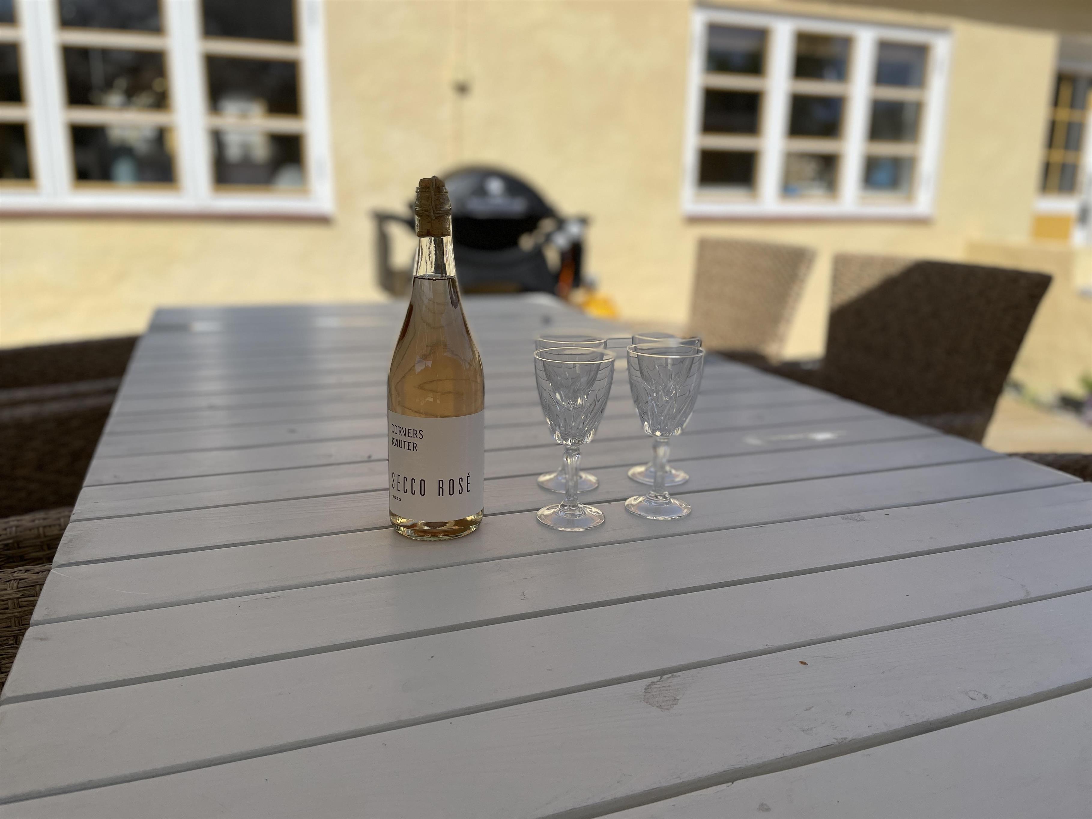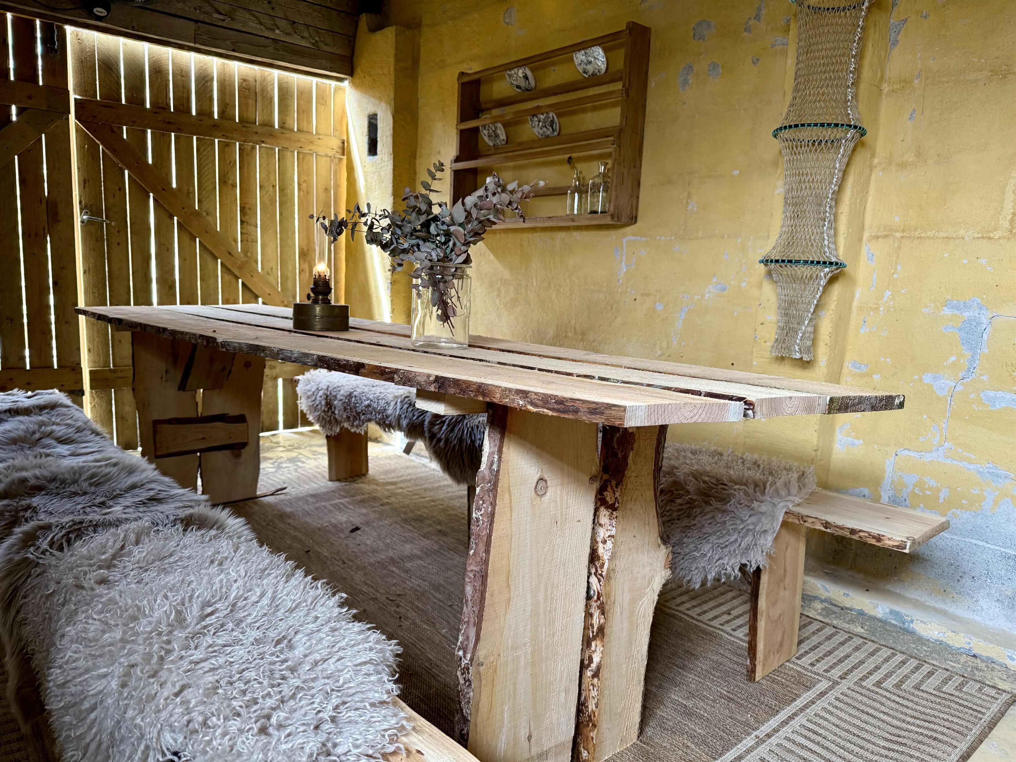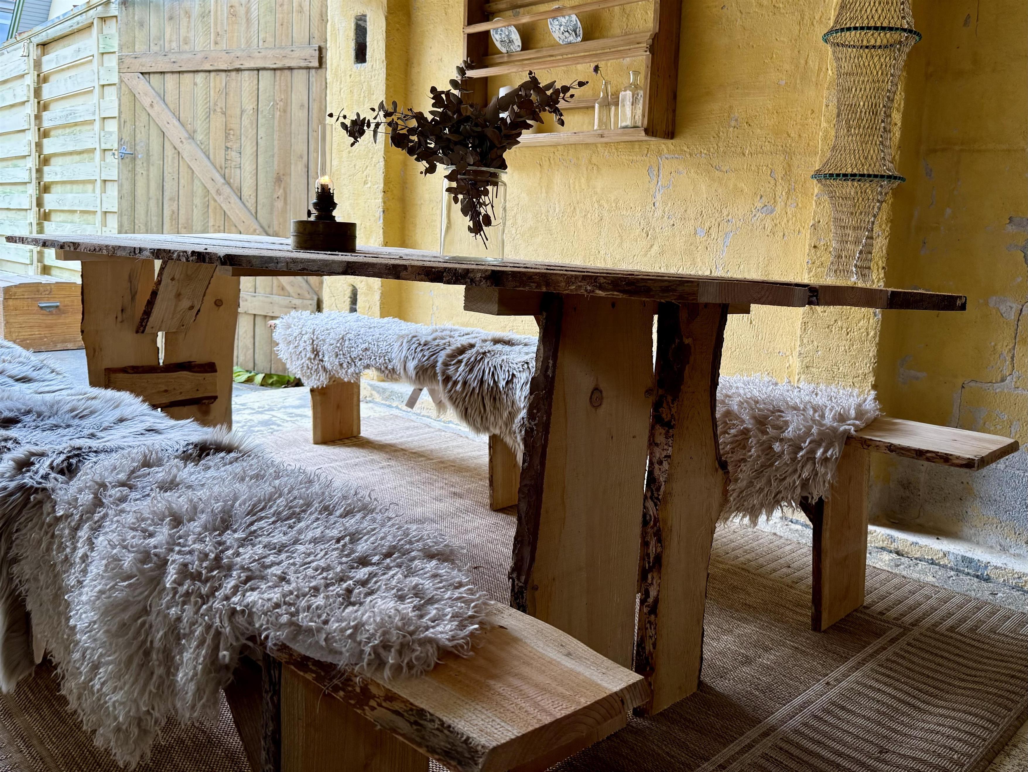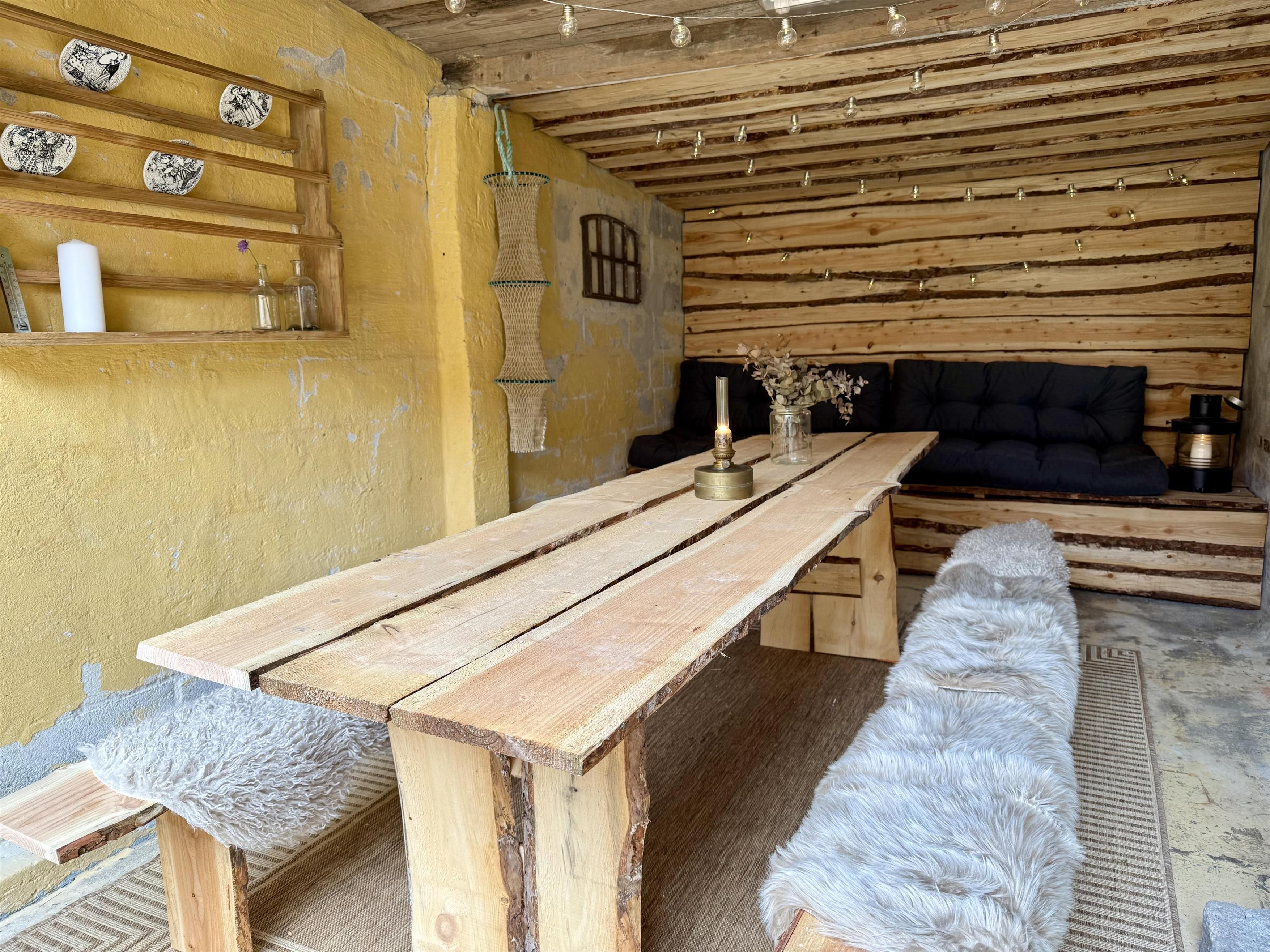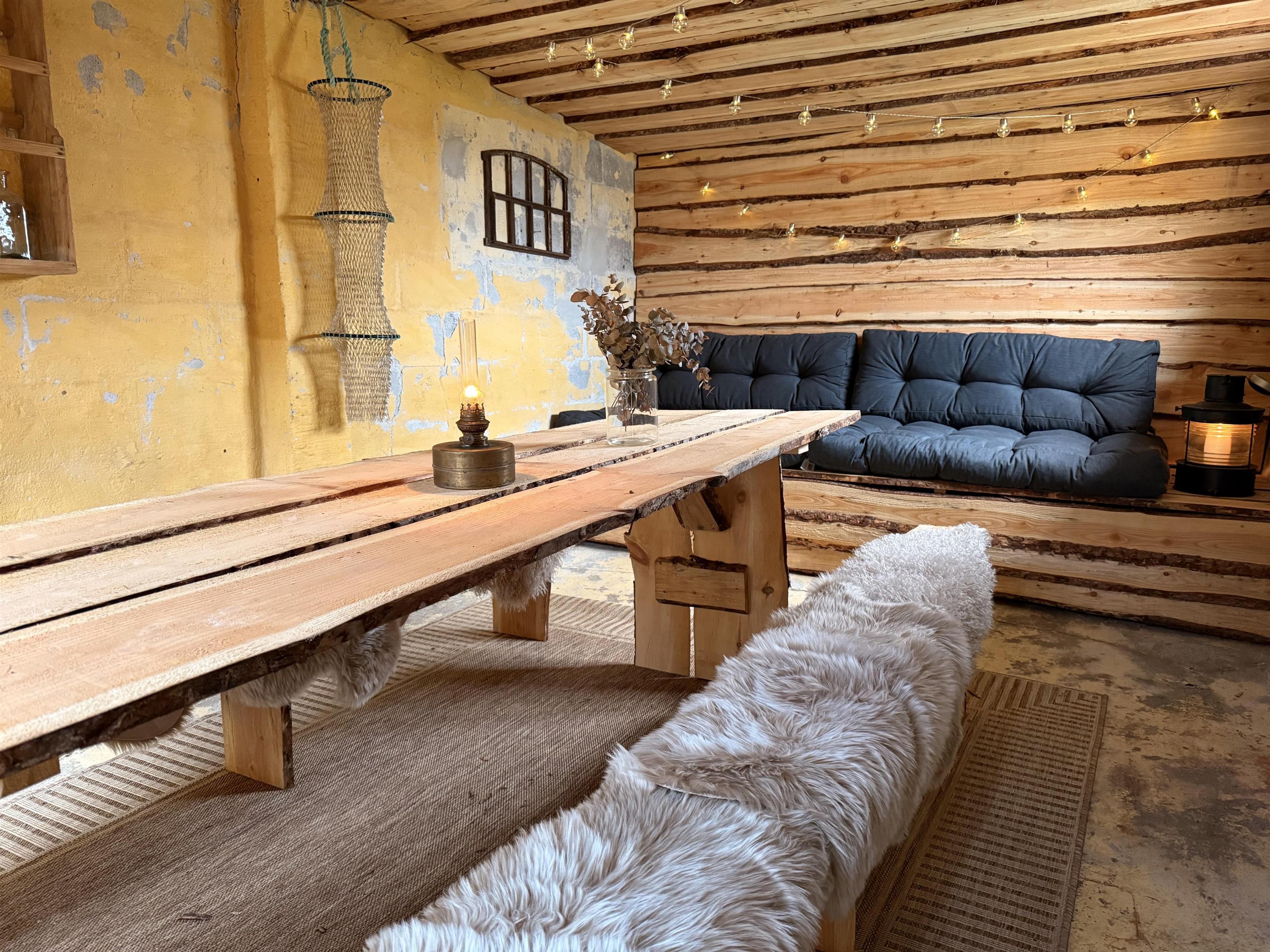Im Zusammenhang mit der Terrasse wurde im Nebengebäude eine rustikale, stimmungsvolle Oase geschaffen. Hier gibt es lange Holztische und -bänke aus schönem, unbehandeltem Holz mit Lammfellen, gemütliche Lichterketten, Loungemöbel und Heizung. Perfekt für gesellige Abendessen und Entspannung – bei jedem Wetter, auch an kühlen Abenden.