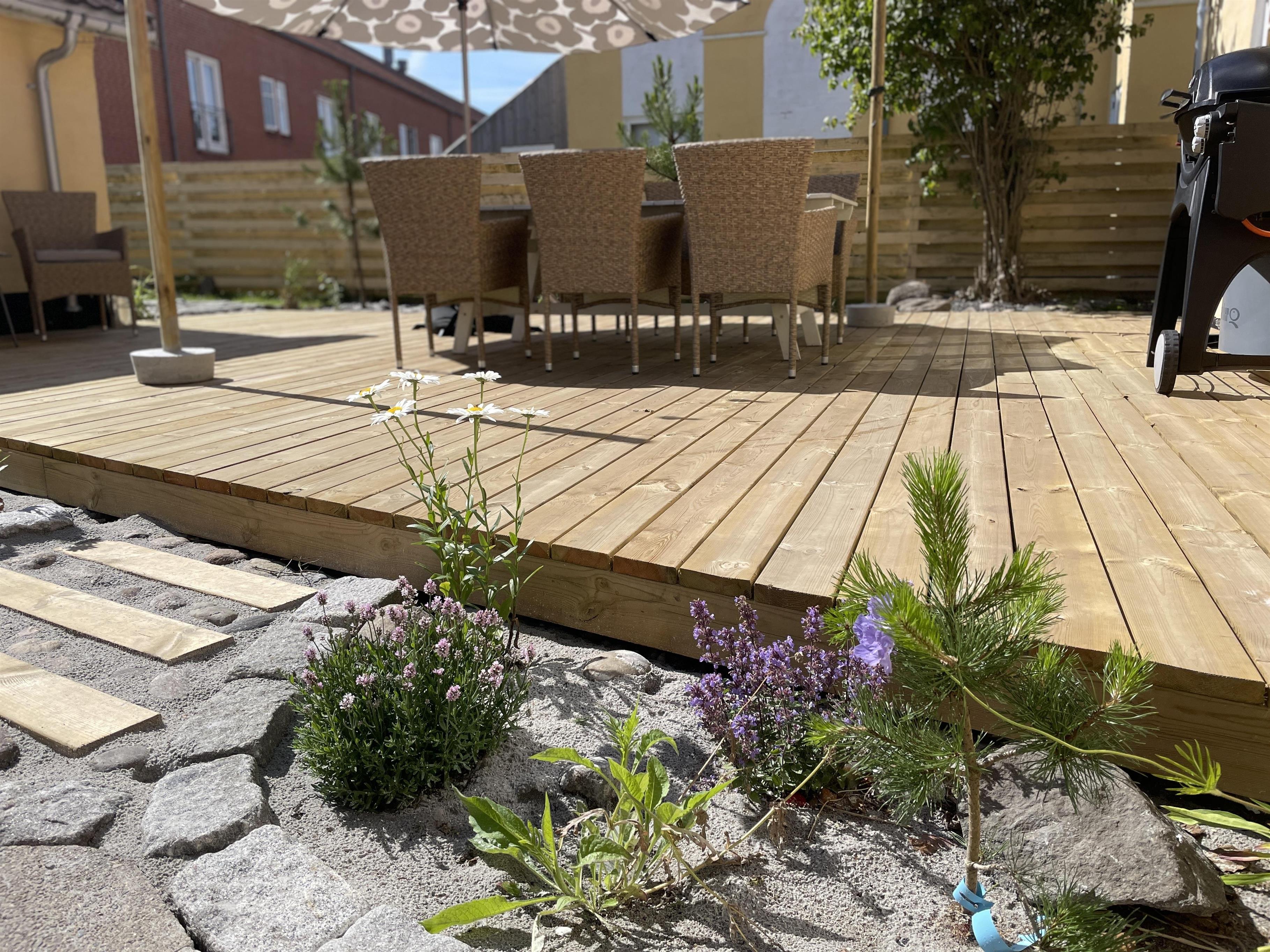 Draußen gibt es einen wunderschönen Innenhof mit einer großen neuen Holzterrasse, schönen Gartenmöbeln und einem guten Grill sowie einer gemütlichen geschlossenen Hofumgebung mit grünen Büschen und Pflanzen. Es ist eine kleine Oase, in der Sie das Leben in der Sonne und geschützt vor den Launen des Wetters genießen können.