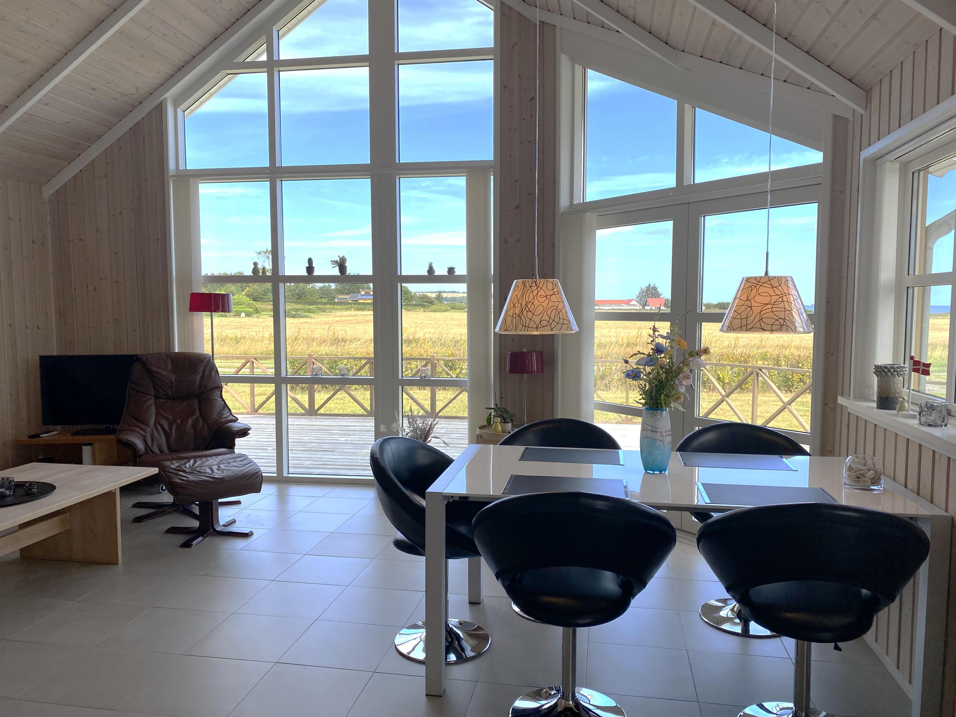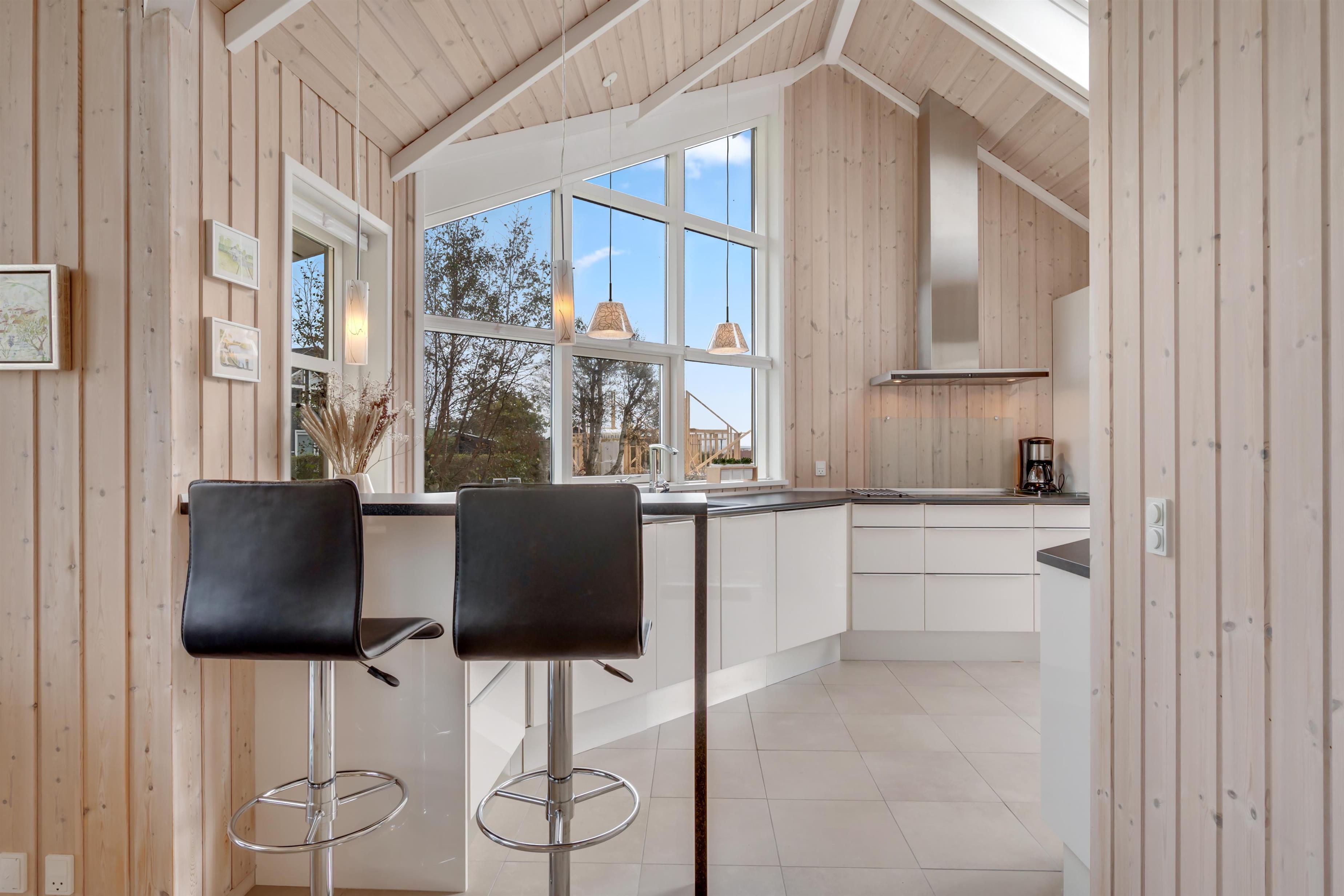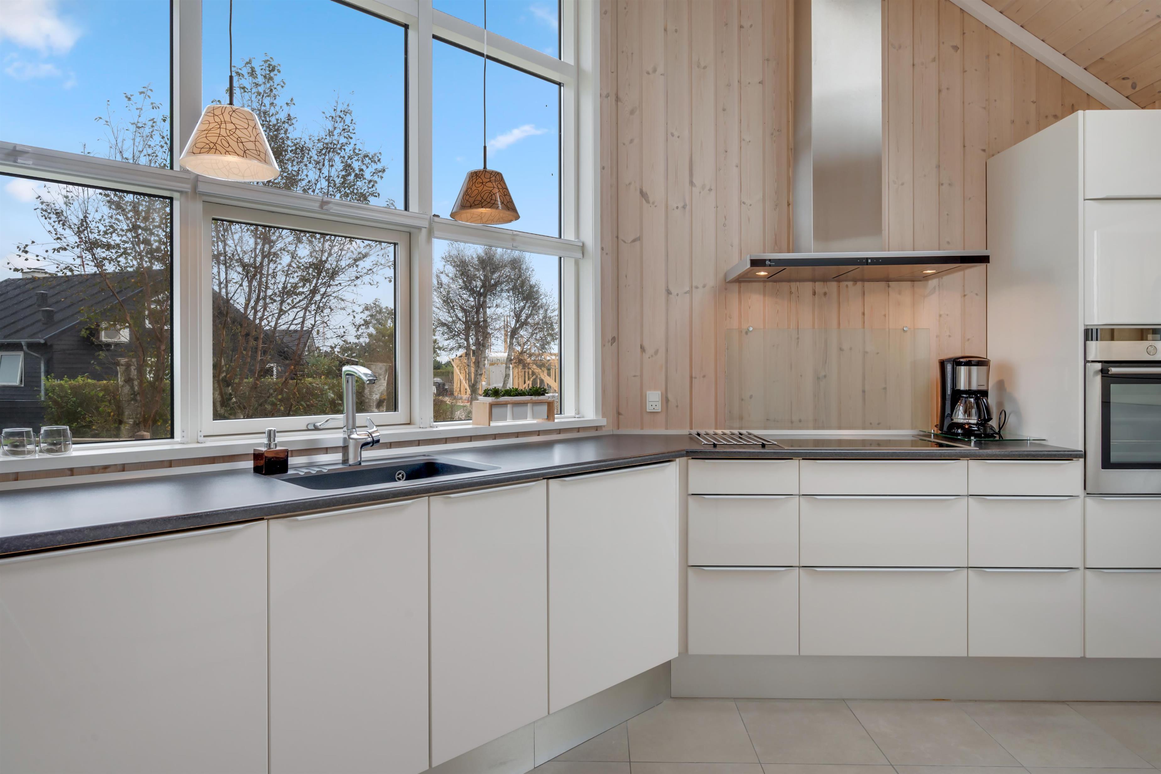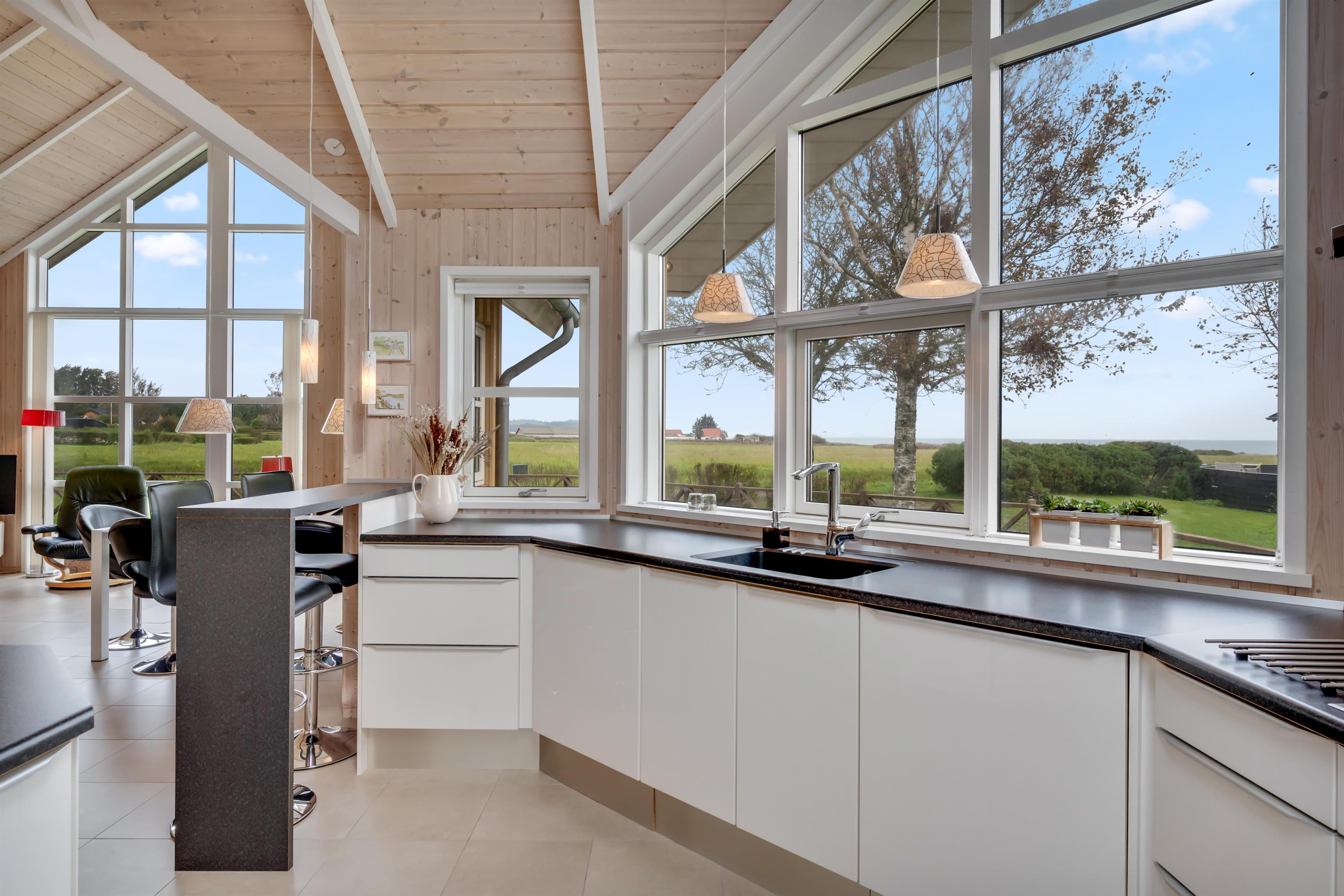 Der Wohn-Essbereich ist geräumig und hell eingerichtet, mit einer Sofagruppe und einem Esstisch in Richtung der großen Fenster, die einen schönen Blick auf das Meer und die Natur bieten – und gleichzeitig in direkter Verbindung zur Küche stehen. In der Küche finden Sie alles, was Sie zum Kochen benötigen – sei es auf dem Induktionskochfeld oder dem Grill auf der Terrasse. Außerdem gibt es hier einen Einbaubackofen, einen Kühlschrank, einen Gefrierschrank sowie eine Waschmaschine mit Trocknerfunktion.