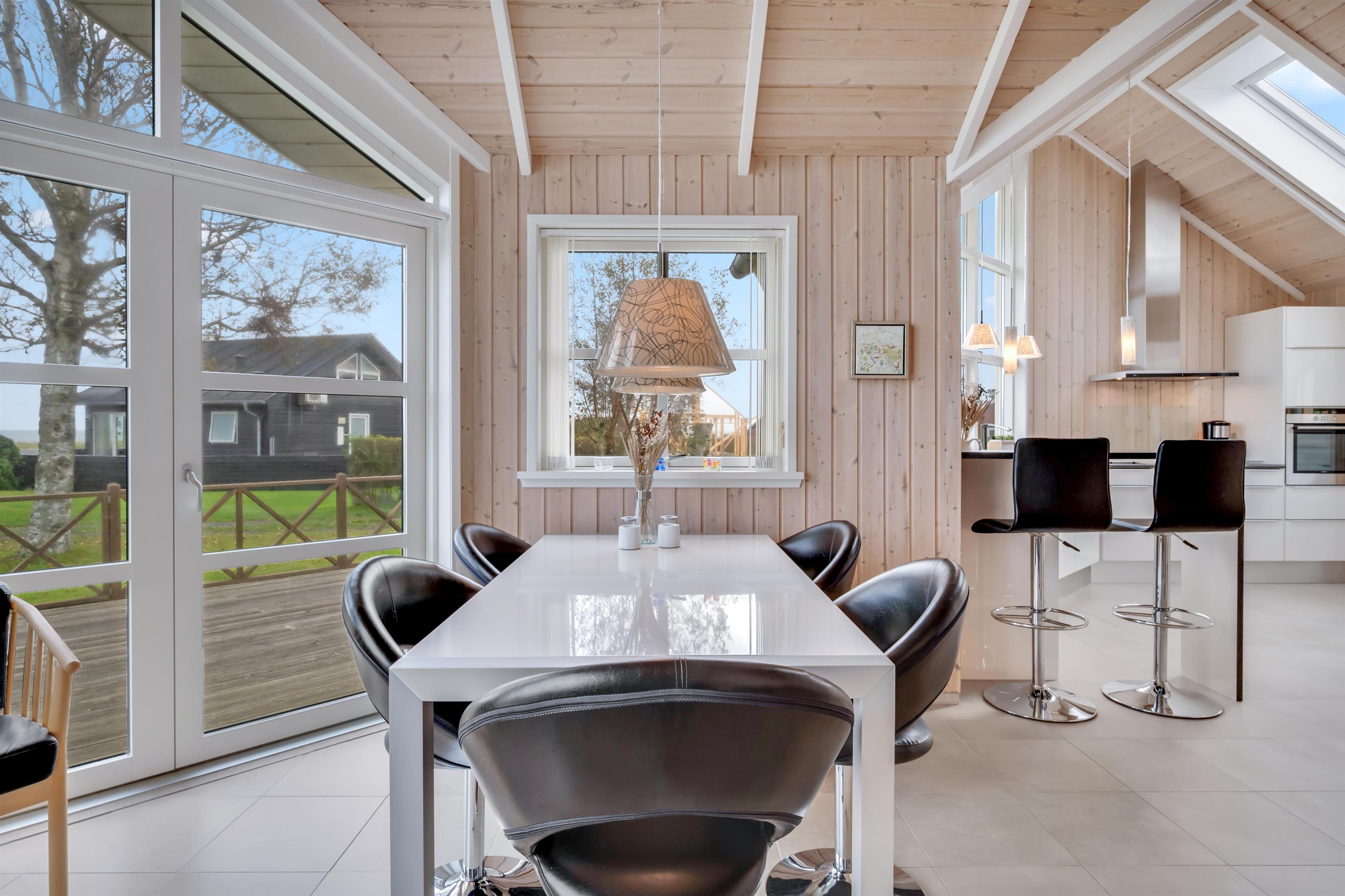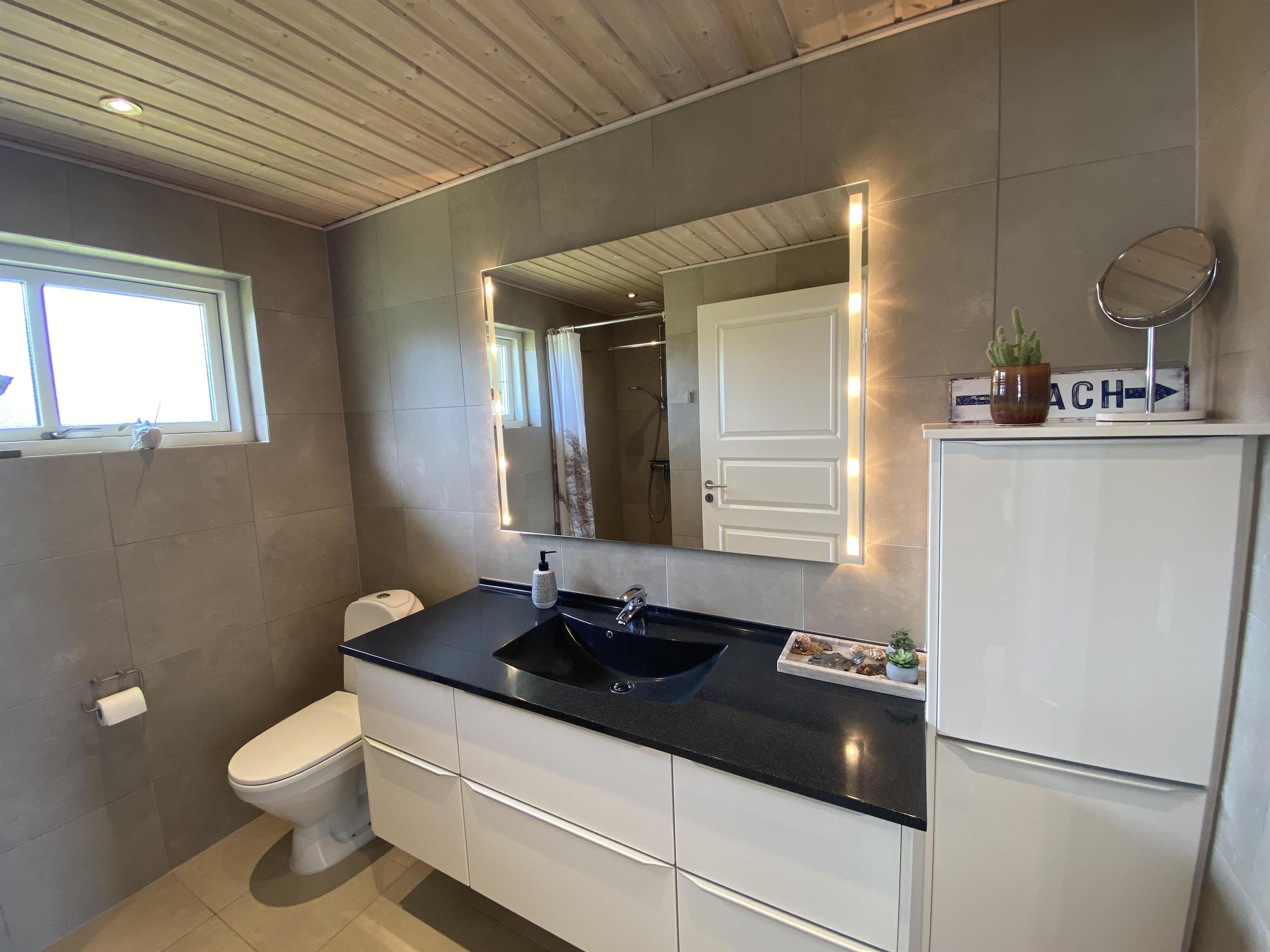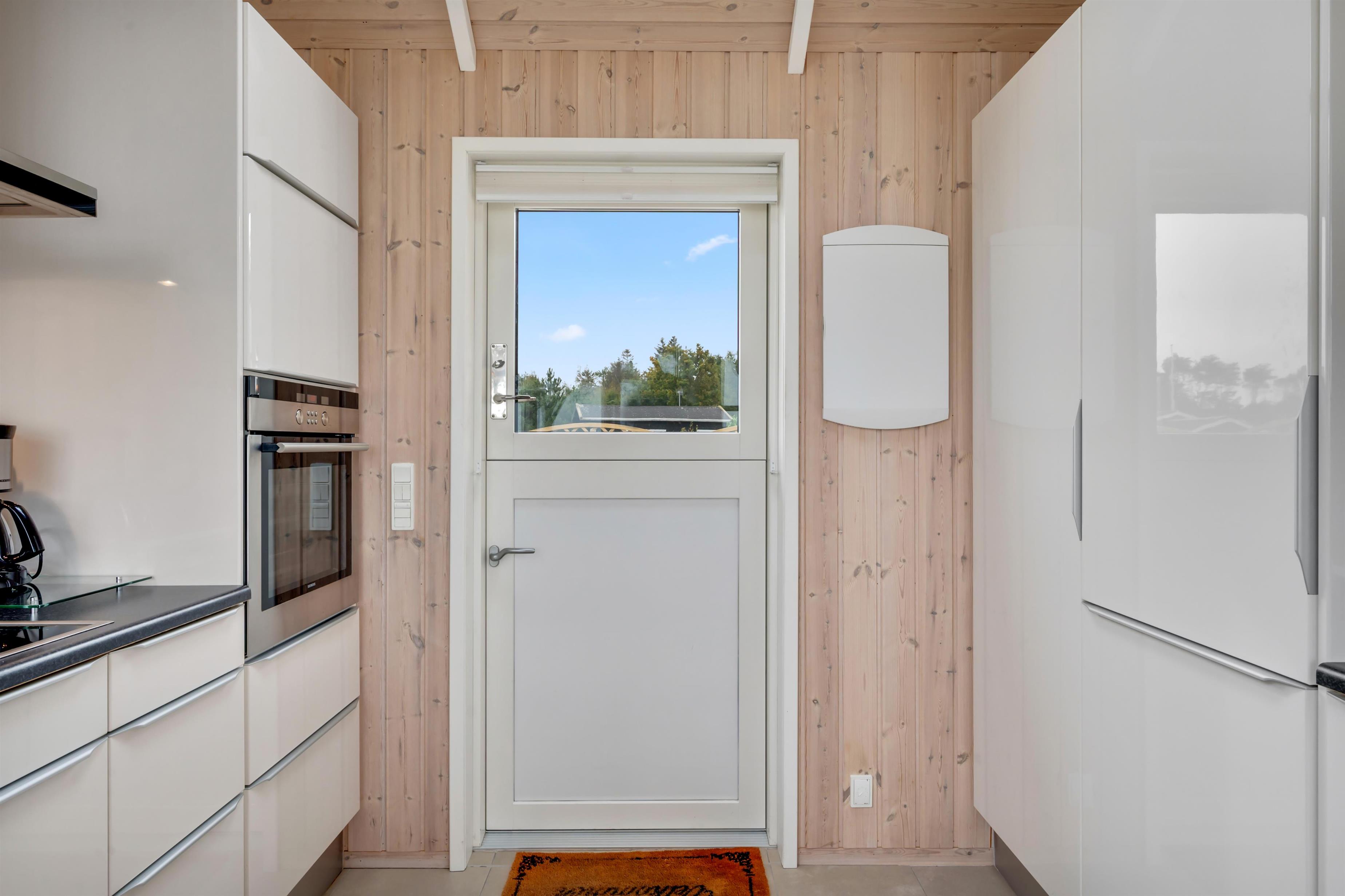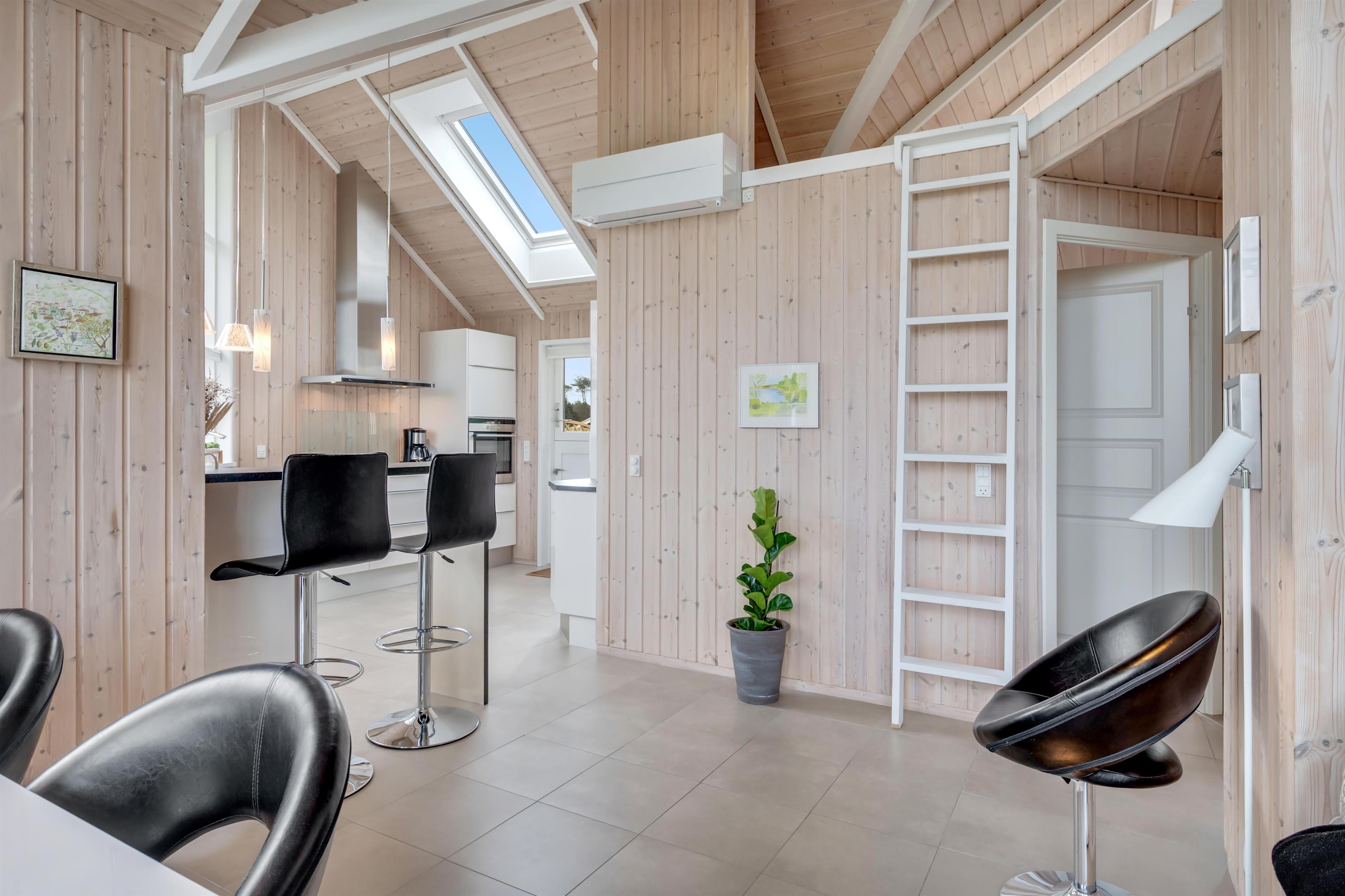 Der Wohn-Essbereich ist geräumig und hell eingerichtet, mit einer Sofagruppe und einem Esstisch in Richtung der großen Fenster, die einen schönen Blick auf das Meer und die Natur bieten – und gleichzeitig in direkter Verbindung zur Küche stehen. In der Küche finden Sie alles, was Sie zum Kochen benötigen – sei es auf dem Induktionskochfeld oder dem Grill auf der Terrasse. Außerdem gibt es hier einen Einbaubackofen, einen Kühlschrank, einen Gefrierschrank sowie eine Waschmaschine mit Trocknerfunktion.