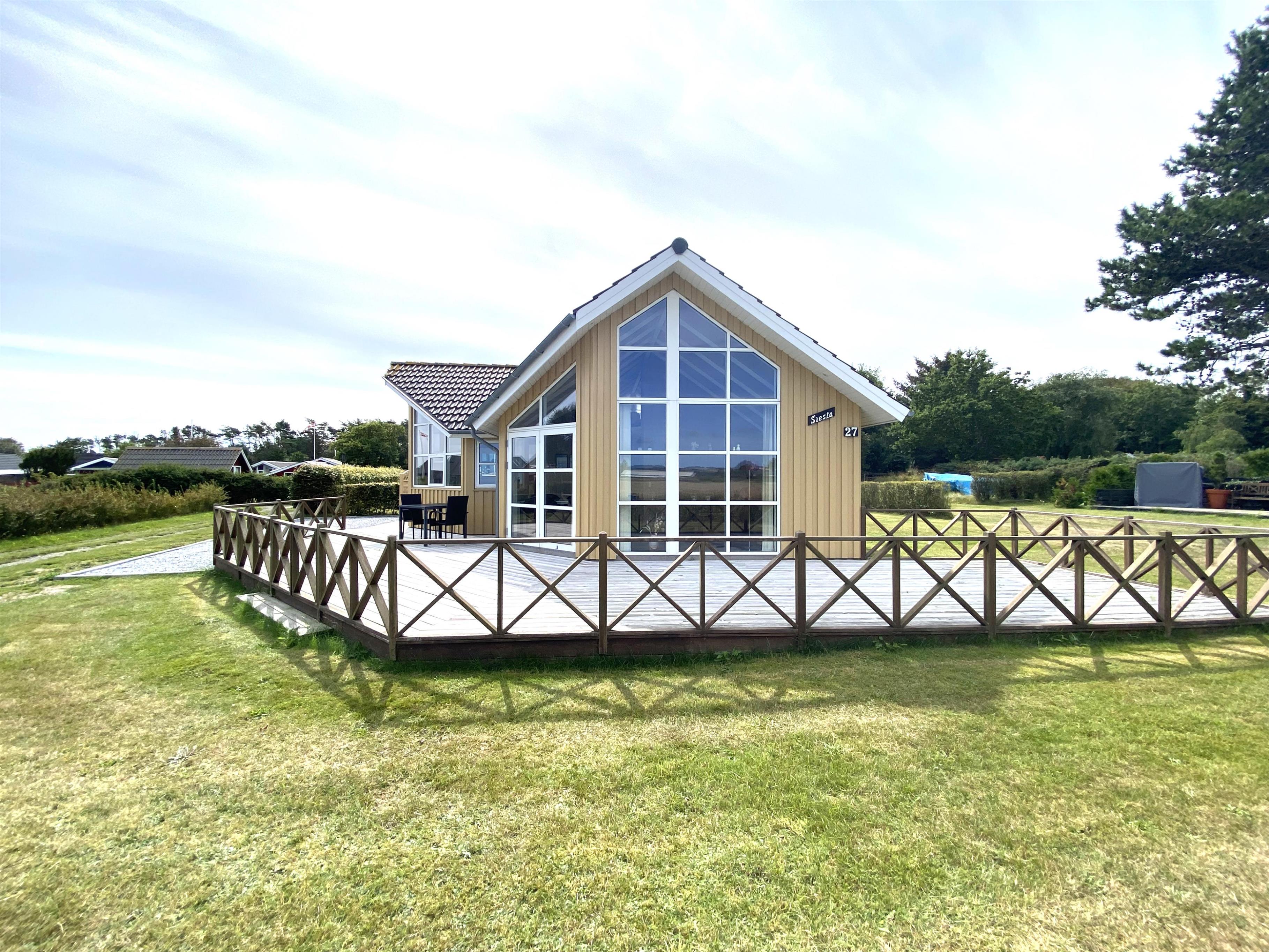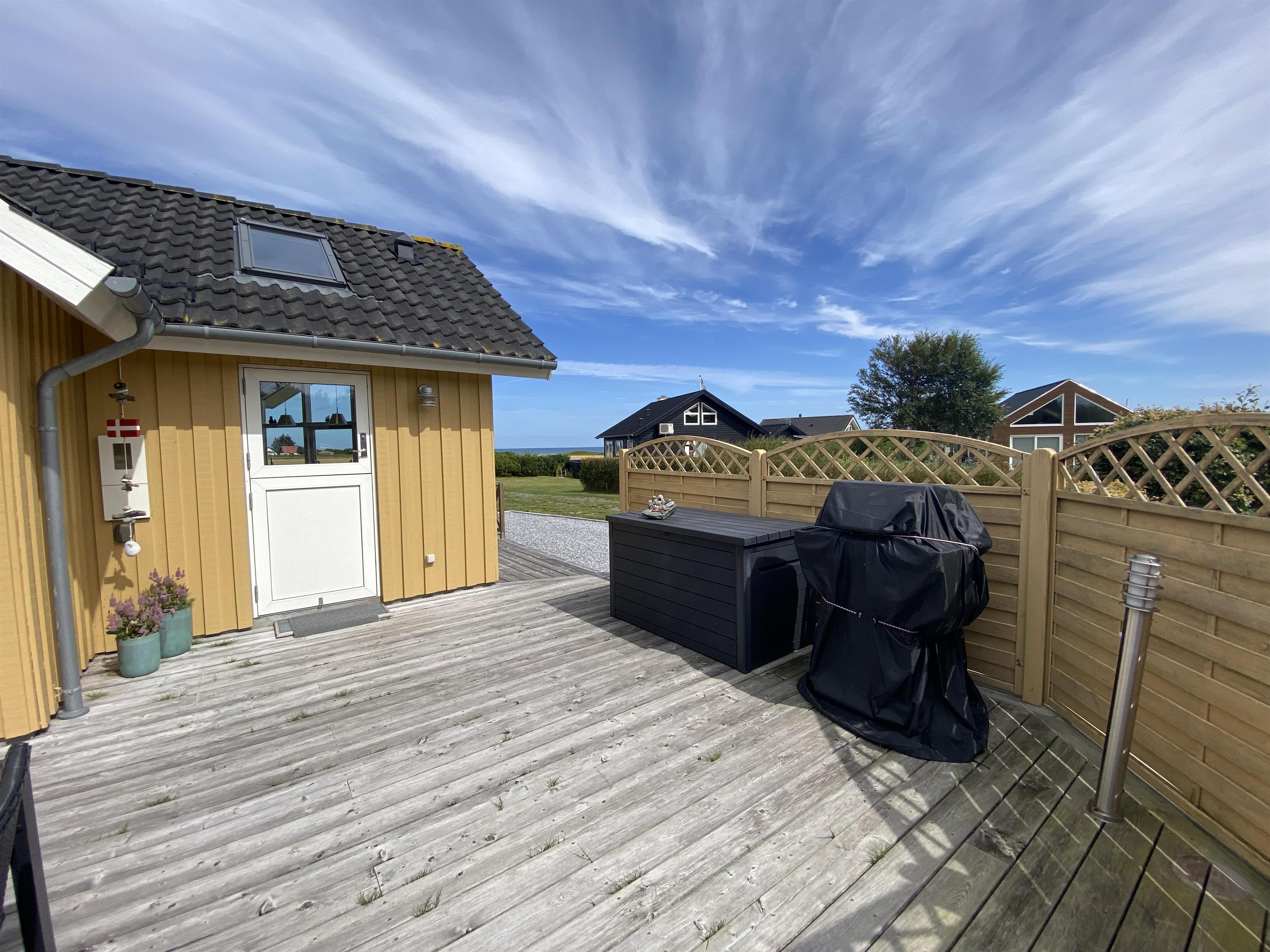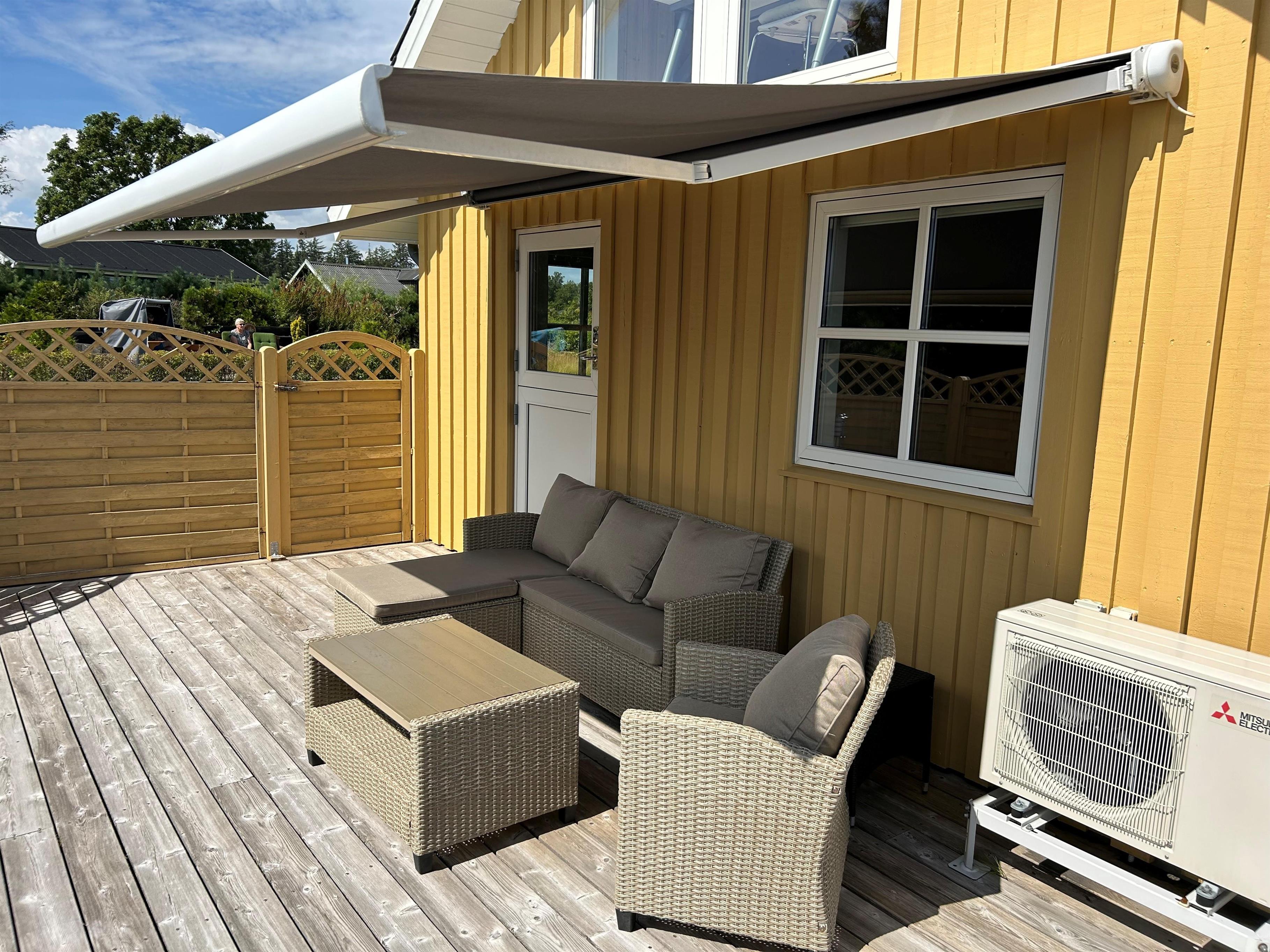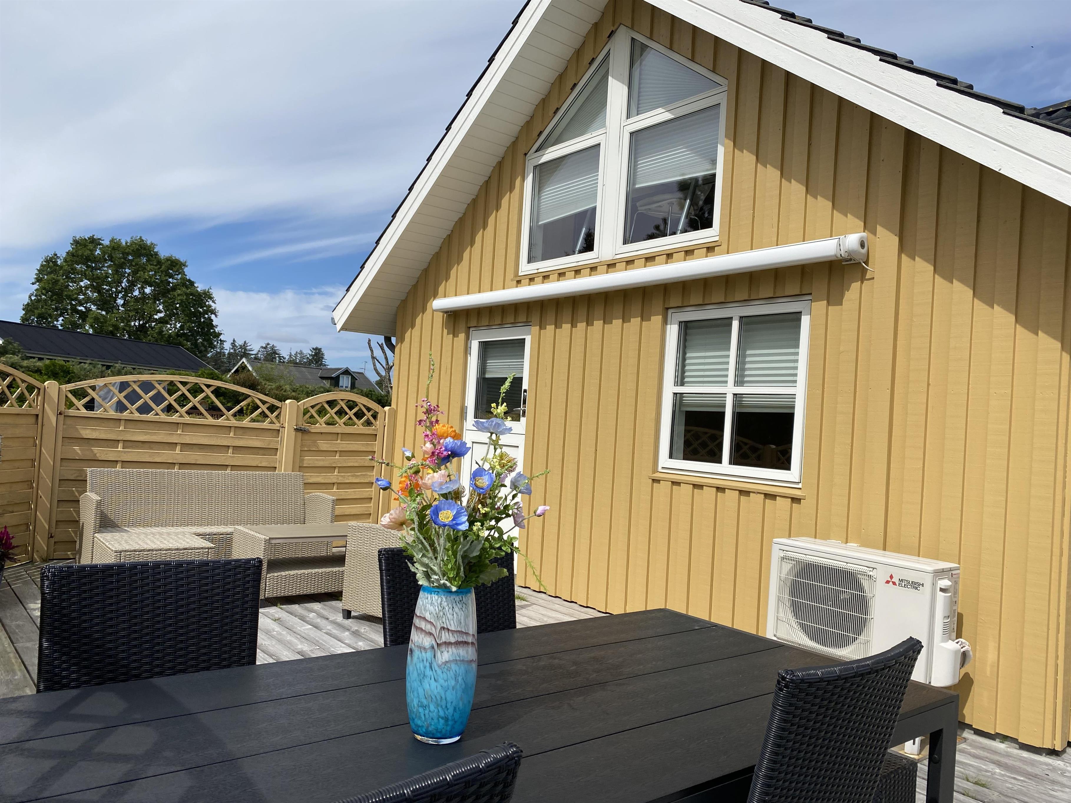 Dieses gemütliche Holzferienhaus lädt sowohl drinnen als auch draußen zum Beisammensein ein – mit einer großen Rasenfläche, großzügigen Terrassen und einem offenen Wohn-Essbereich mit Küche. Die große Holzterrasse, die fast das ganze Haus umgibt, ist nach Süden hin mit einem leichten Zaun abgegrenzt. Dadurch kann man hier ungestört am Terrassentisch oder in der Sofagruppe sitzen. Dieser Teil der Terrasse verfügt zudem über eine große, elektrisch betriebene Markise, die an warmen Tagen angenehmen Schatten spendet. Vom Haus führt ein kleiner Weg direkt zum Wasser, das nur 175 Meter entfernt liegt.