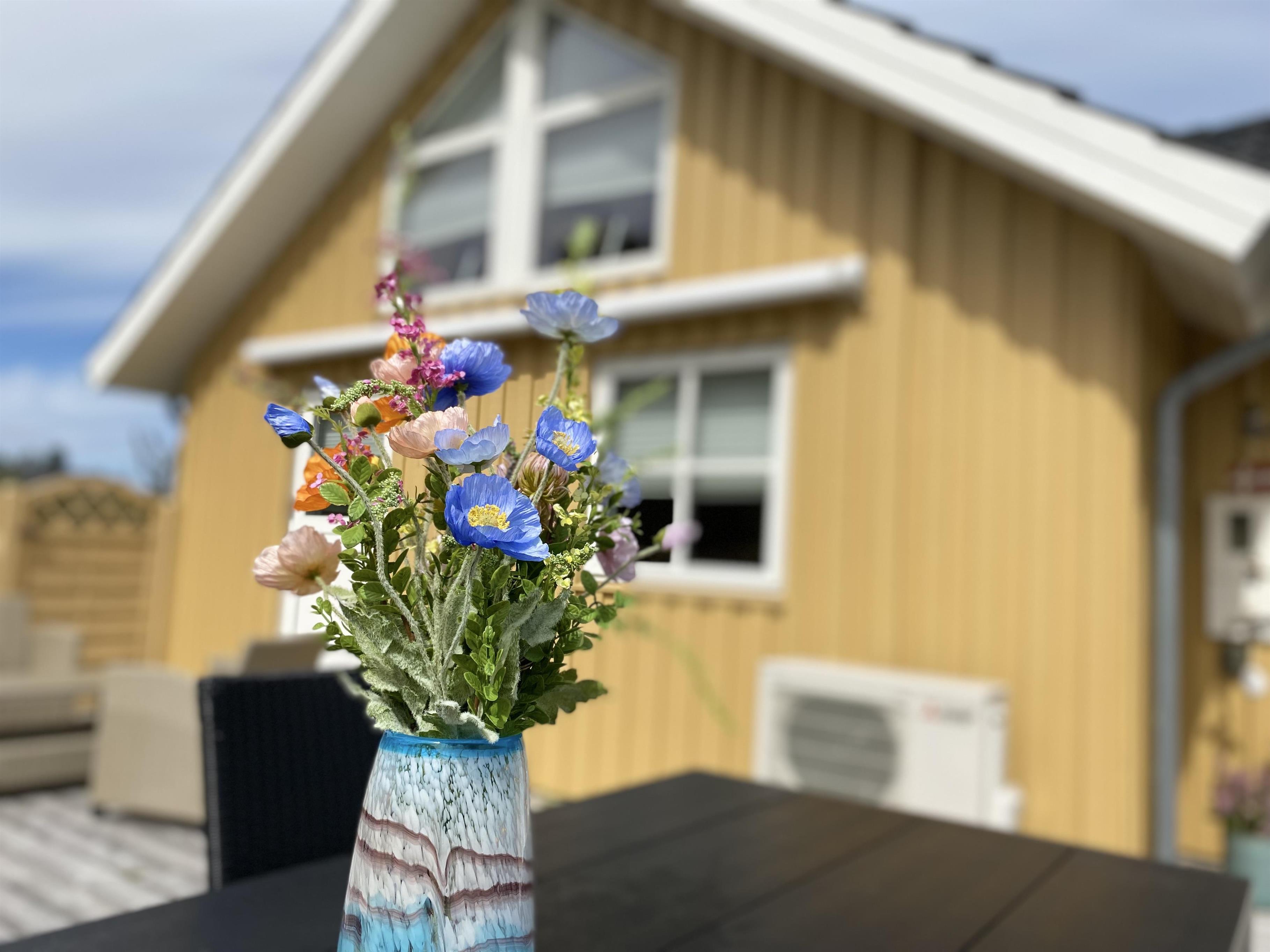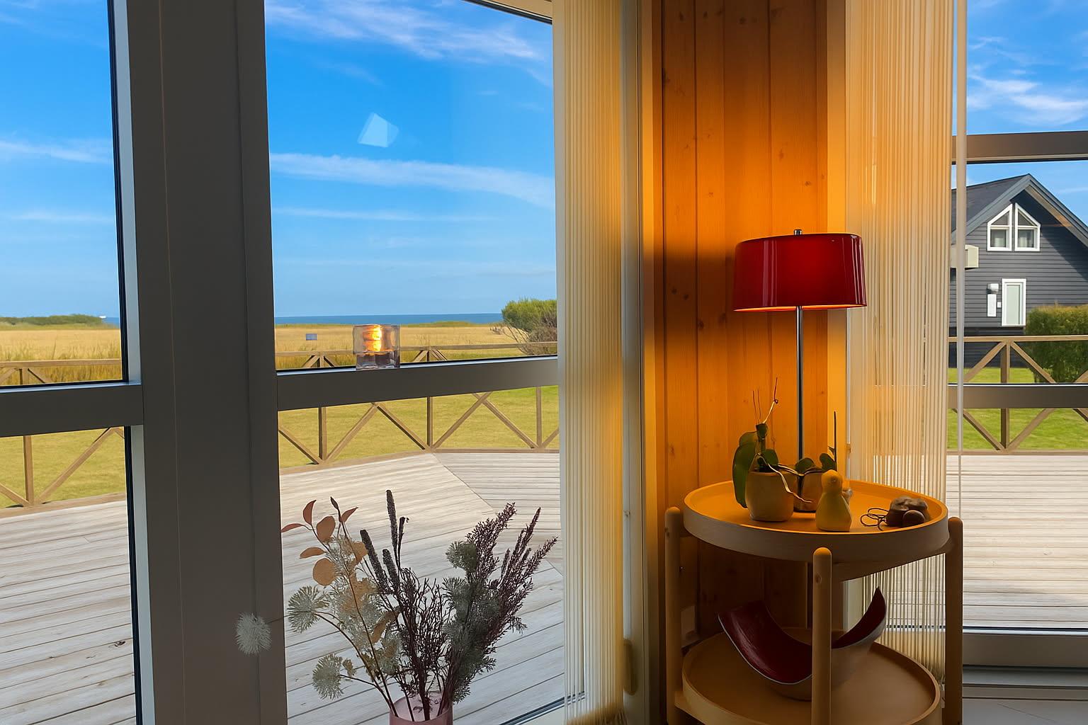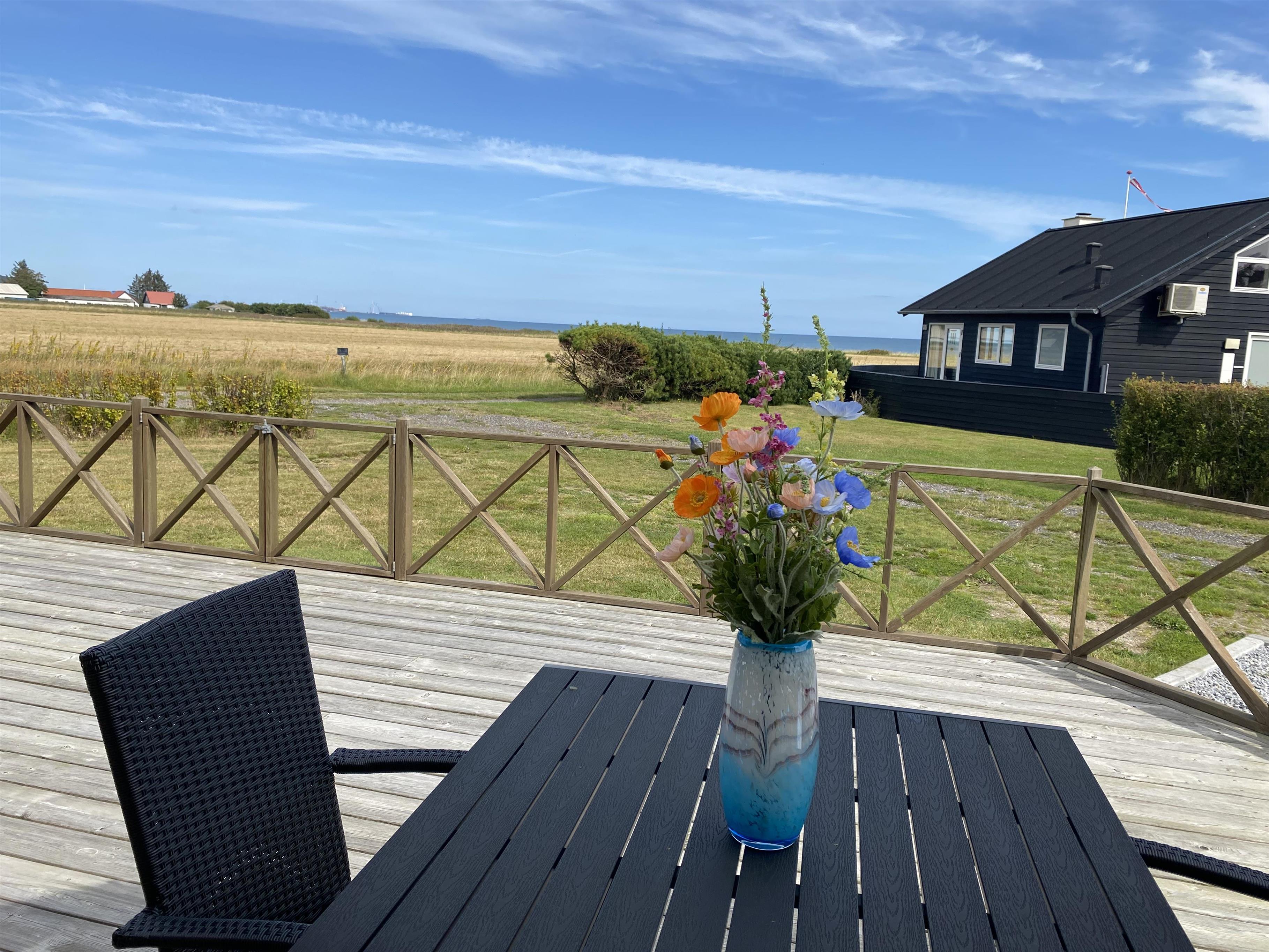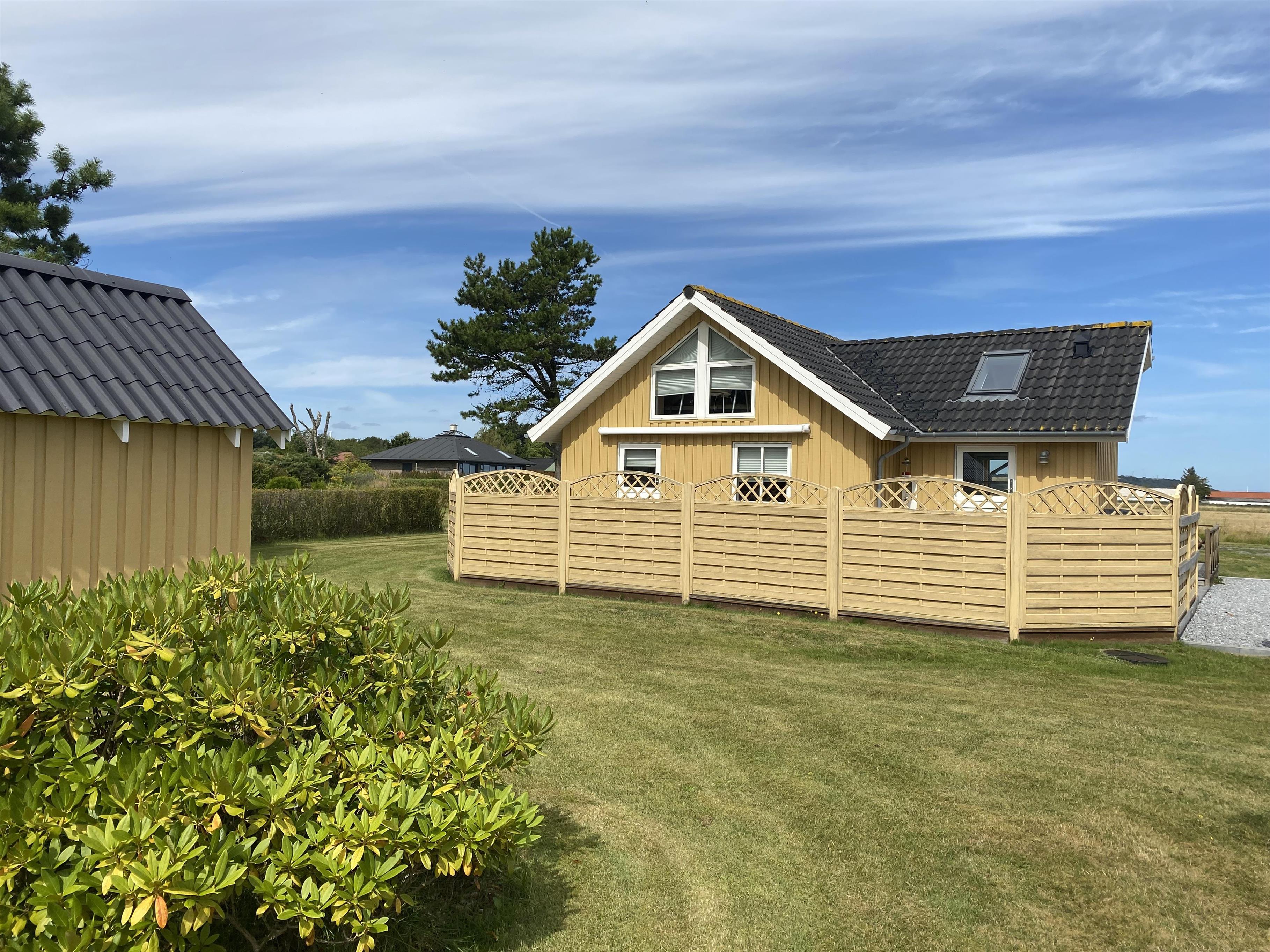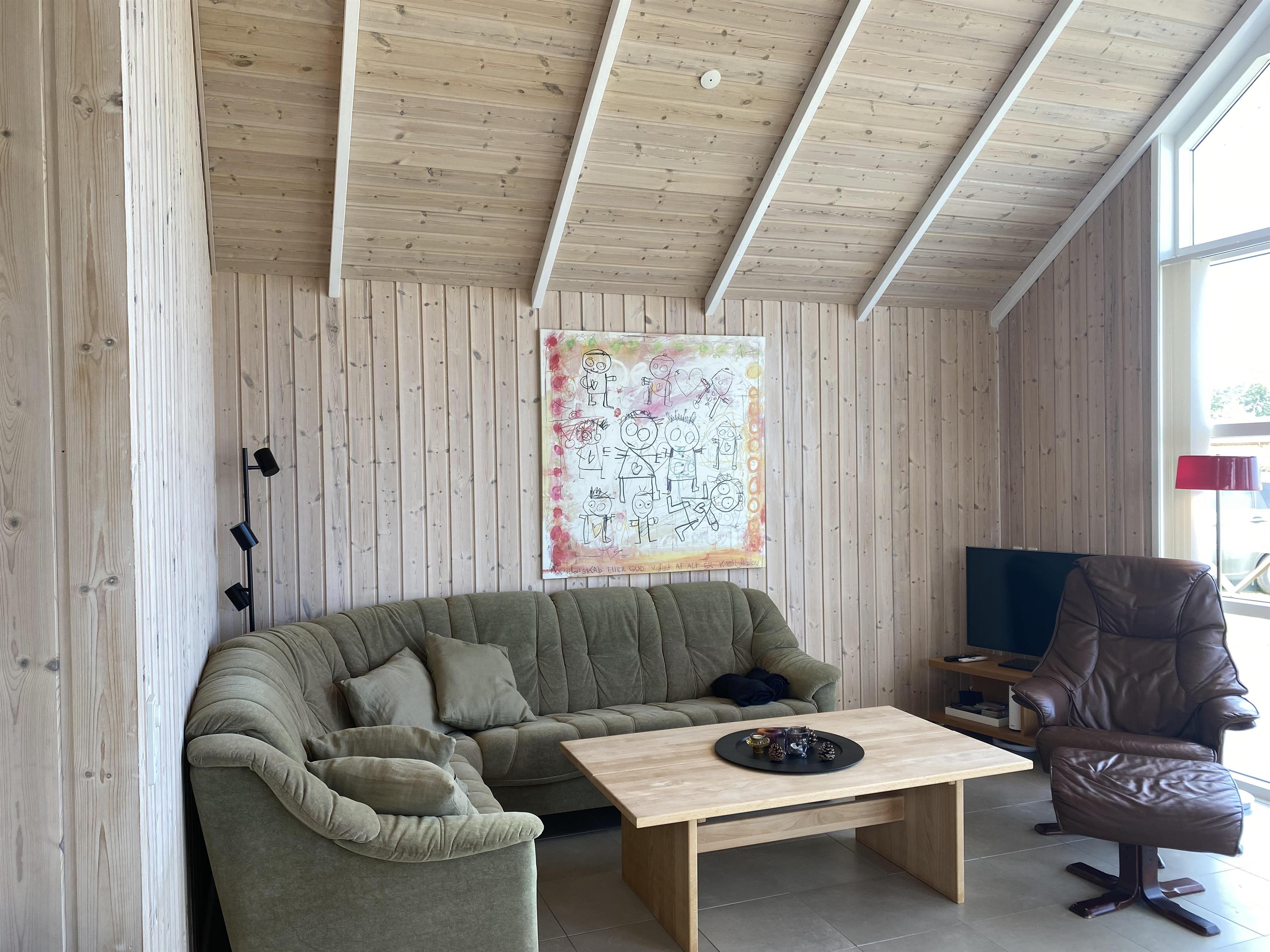 Dieses gemütliche Holzferienhaus lädt sowohl drinnen als auch draußen zum Beisammensein ein – mit einer großen Rasenfläche, großzügigen Terrassen und einem offenen Wohn-Essbereich mit Küche. Die große Holzterrasse, die fast das ganze Haus umgibt, ist nach Süden hin mit einem leichten Zaun abgegrenzt. Dadurch kann man hier ungestört am Terrassentisch oder in der Sofagruppe sitzen. Dieser Teil der Terrasse verfügt zudem über eine große, elektrisch betriebene Markise, die an warmen Tagen angenehmen Schatten spendet. Vom Haus führt ein kleiner Weg direkt zum Wasser, das nur 175 Meter entfernt liegt.
