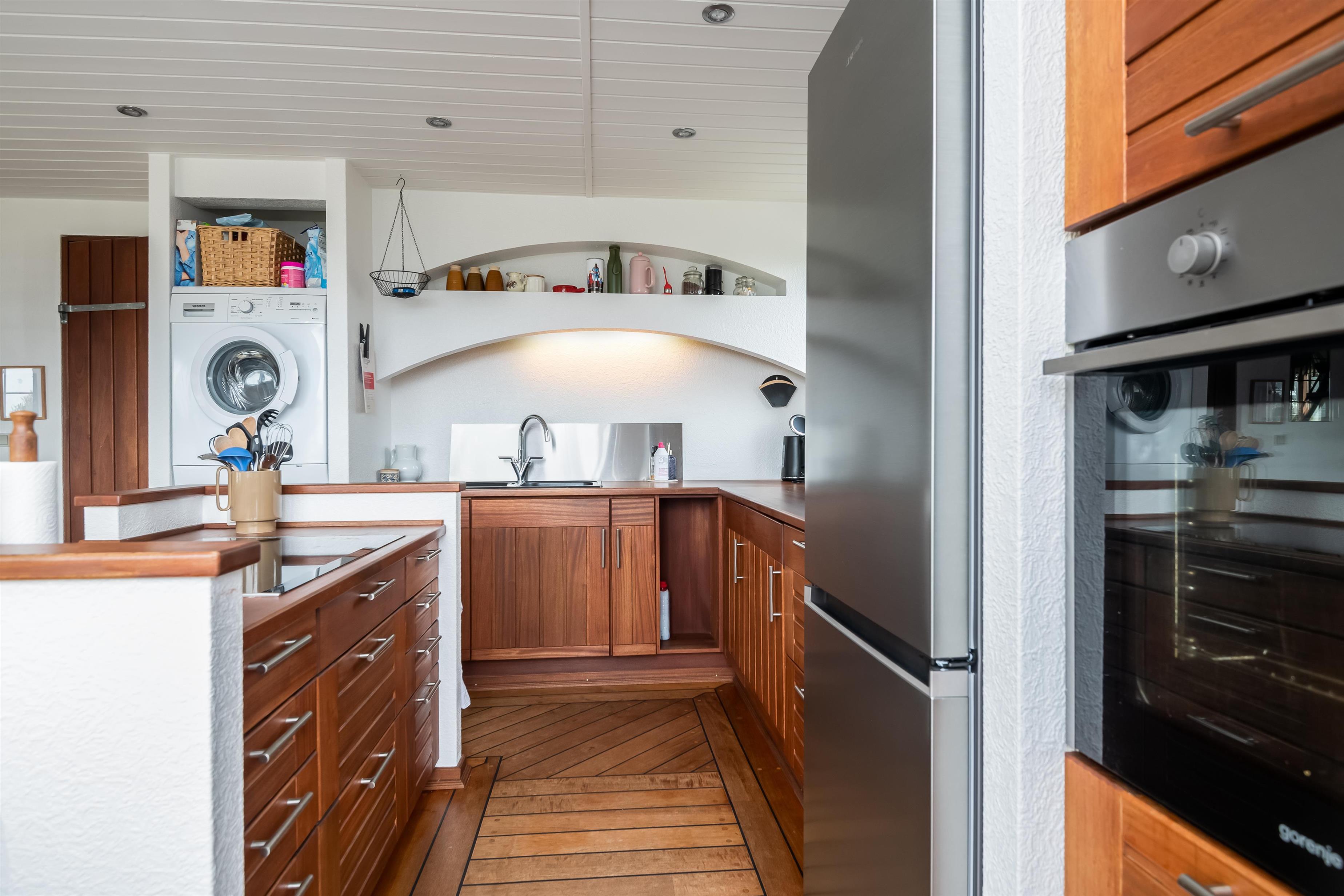 Das Haus wurde 2002 umfassend renoviert und seither sehr gut gepflegt – was sich auch deutlich sehen und spüren lässt. Die Küche ist mit Geschirrspüler, Kühl-/Gefrierkombination, Kaffeemaschine, diversen Küchenutensilien, viel Arbeitsfläche sowie einer Kochinsel mit Induktionsherd zur Wohnseite hin ausgestattet. So wird Kochen sicher nicht zur einsamen Tätigkeit. Im Badezimmer befinden sich eine Dusche und eine Waschmaschine. Ein Trockner steht im Geräteschuppen zur Verfügung.