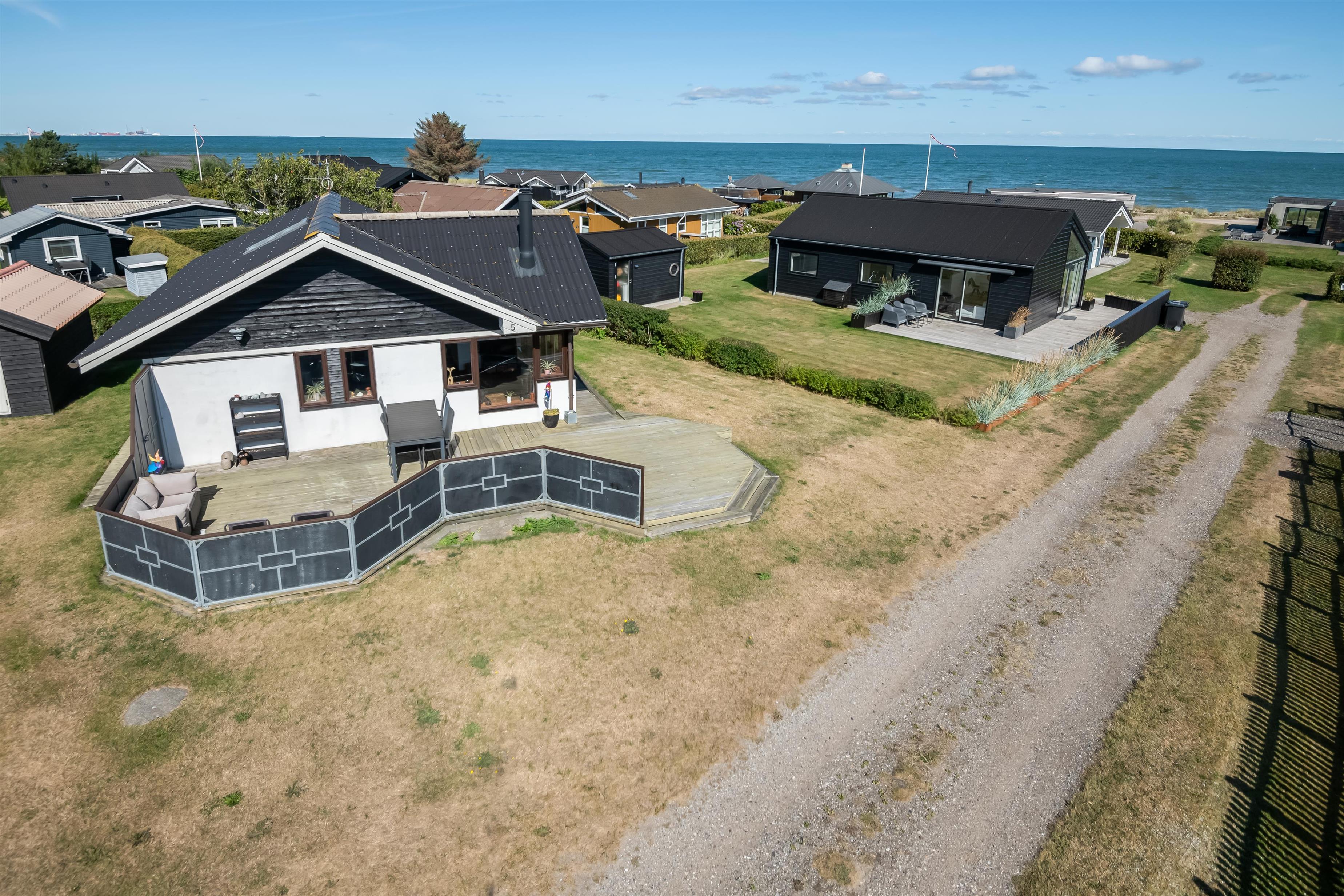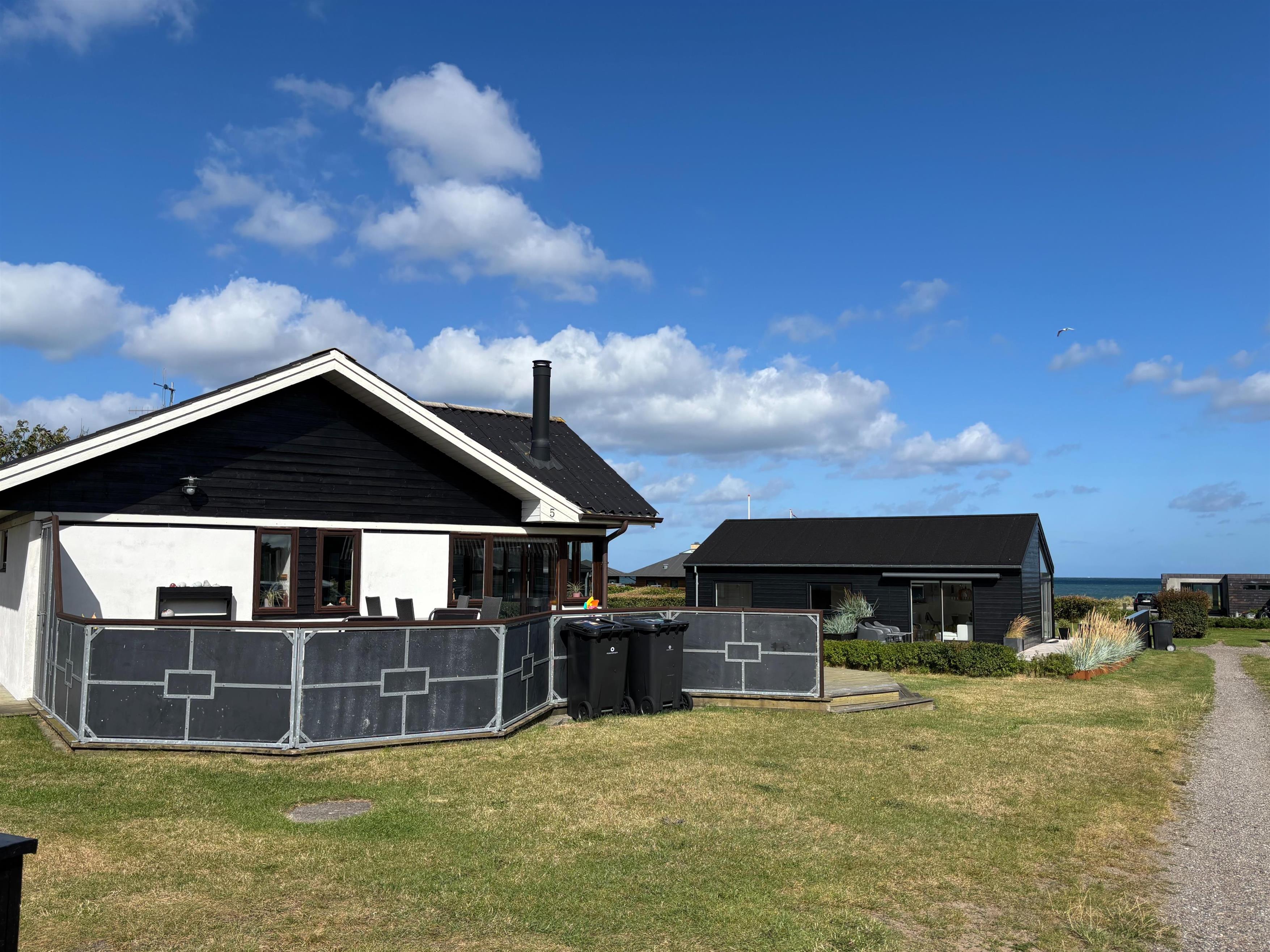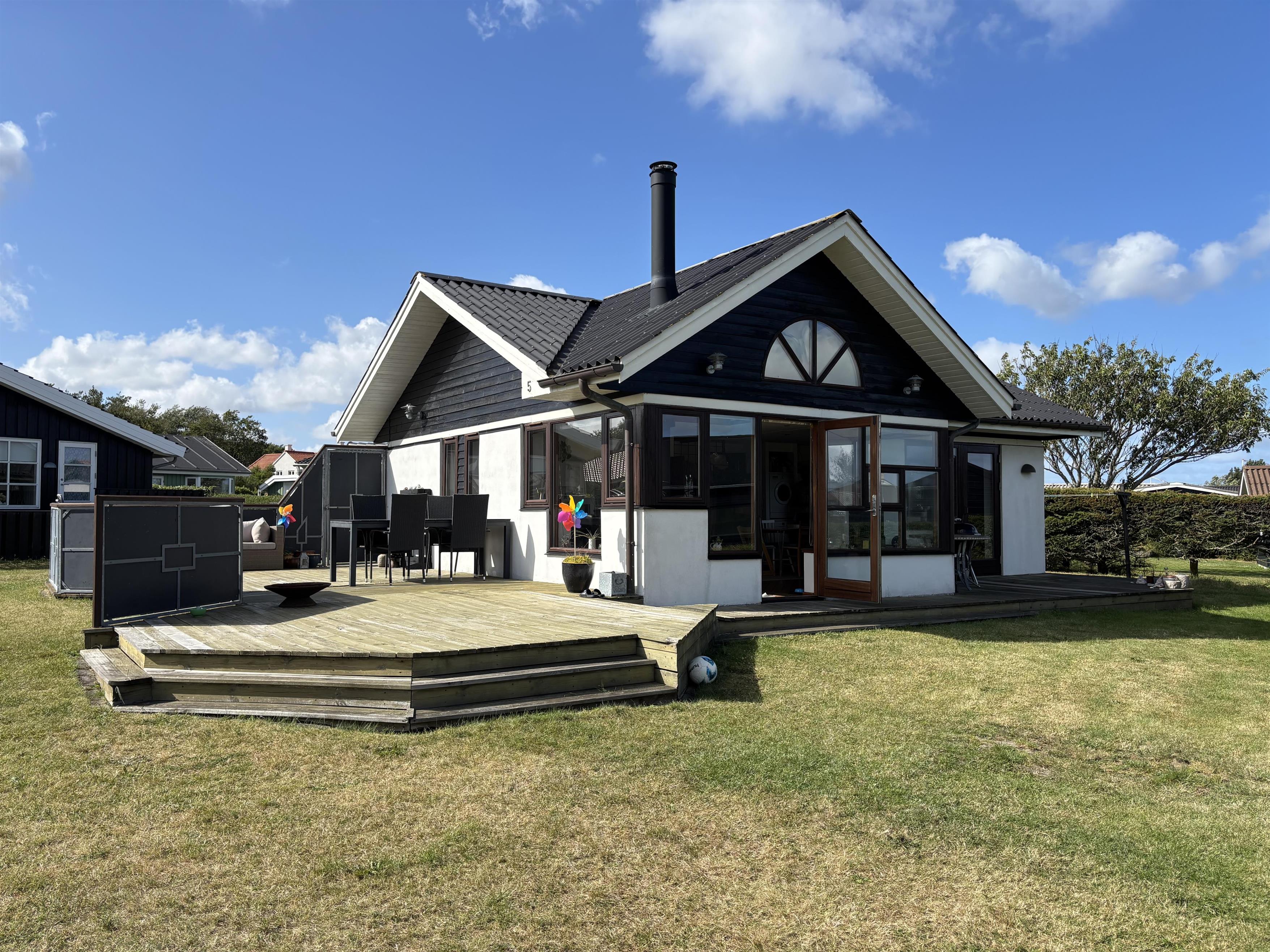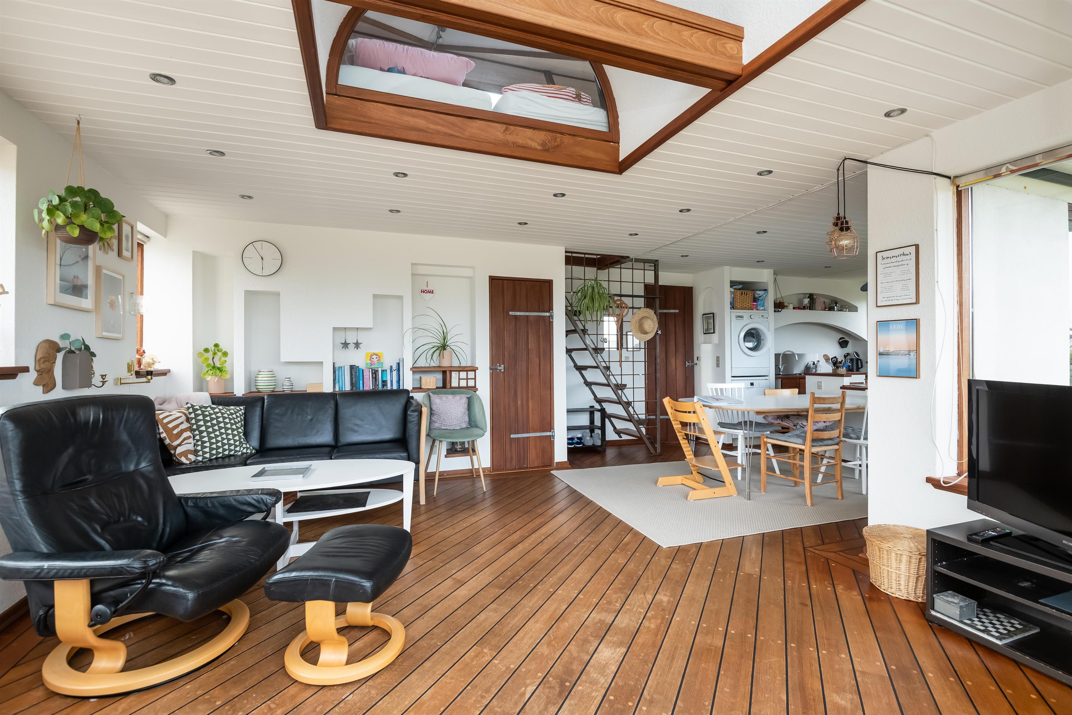 Küche und Wohnzimmer sind offen gestaltet und verleihen dem Haus mit Schiffsboden, Holzküche, Holztüren, Holz-/Metalltreppe und der gesamten Einrichtung einen schönen maritimen Look. Rund um das Haus erstreckt sich eine große Holzterrasse mit mehreren gemütlichen Ecken und Zugängen sowohl vom Wohnzimmer als auch von der Küche. Die Terrasse ist so angelegt, dass sie vom Parkplatz aus mit einem Rollstuhl befahrbar ist – allerdings gibt es kleine Türschwellen am Ein- und Ausgang des Hauses. Auf der Rückseite befindet sich eine Außendusche, ideal zum Abspülen des Sands nach einem Besuch des nahegelegenen Strandes mit der Blauen Flagge.