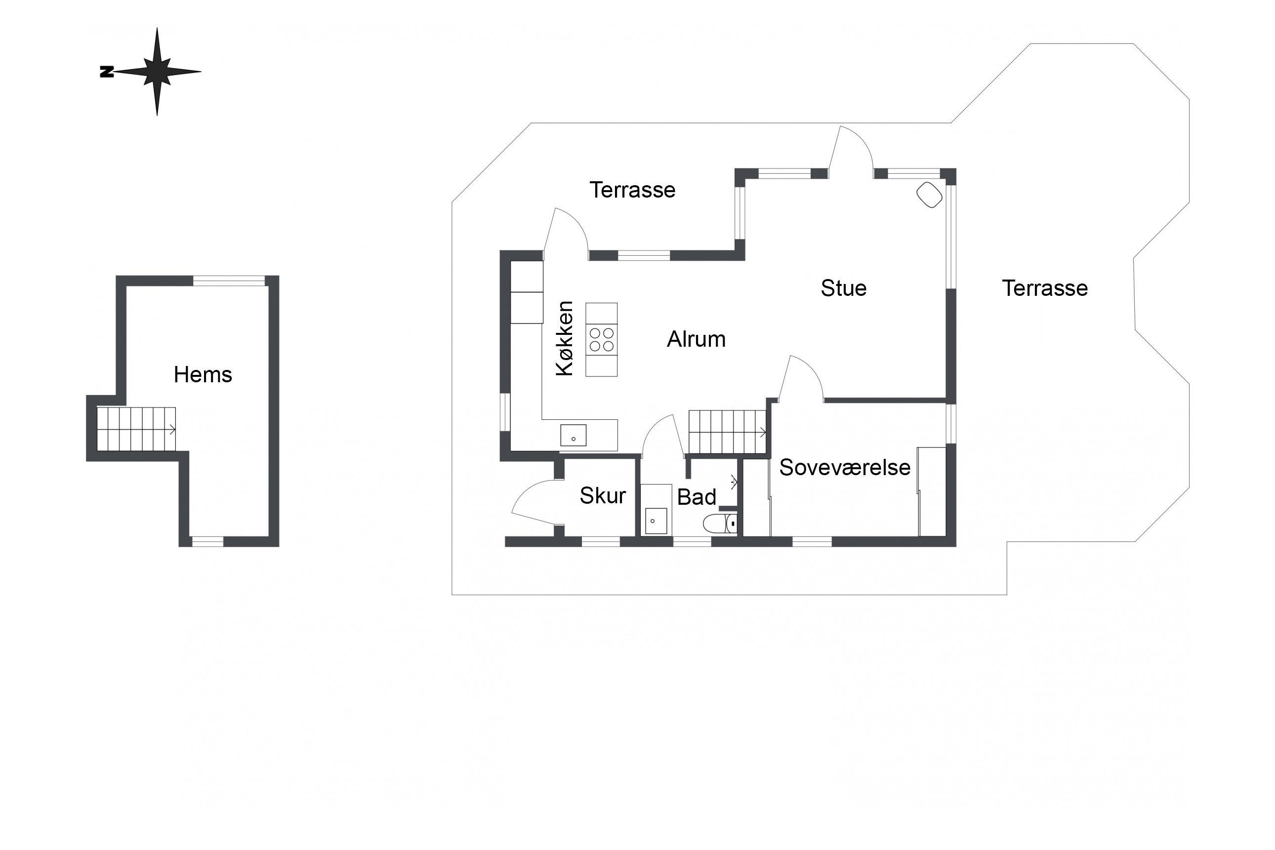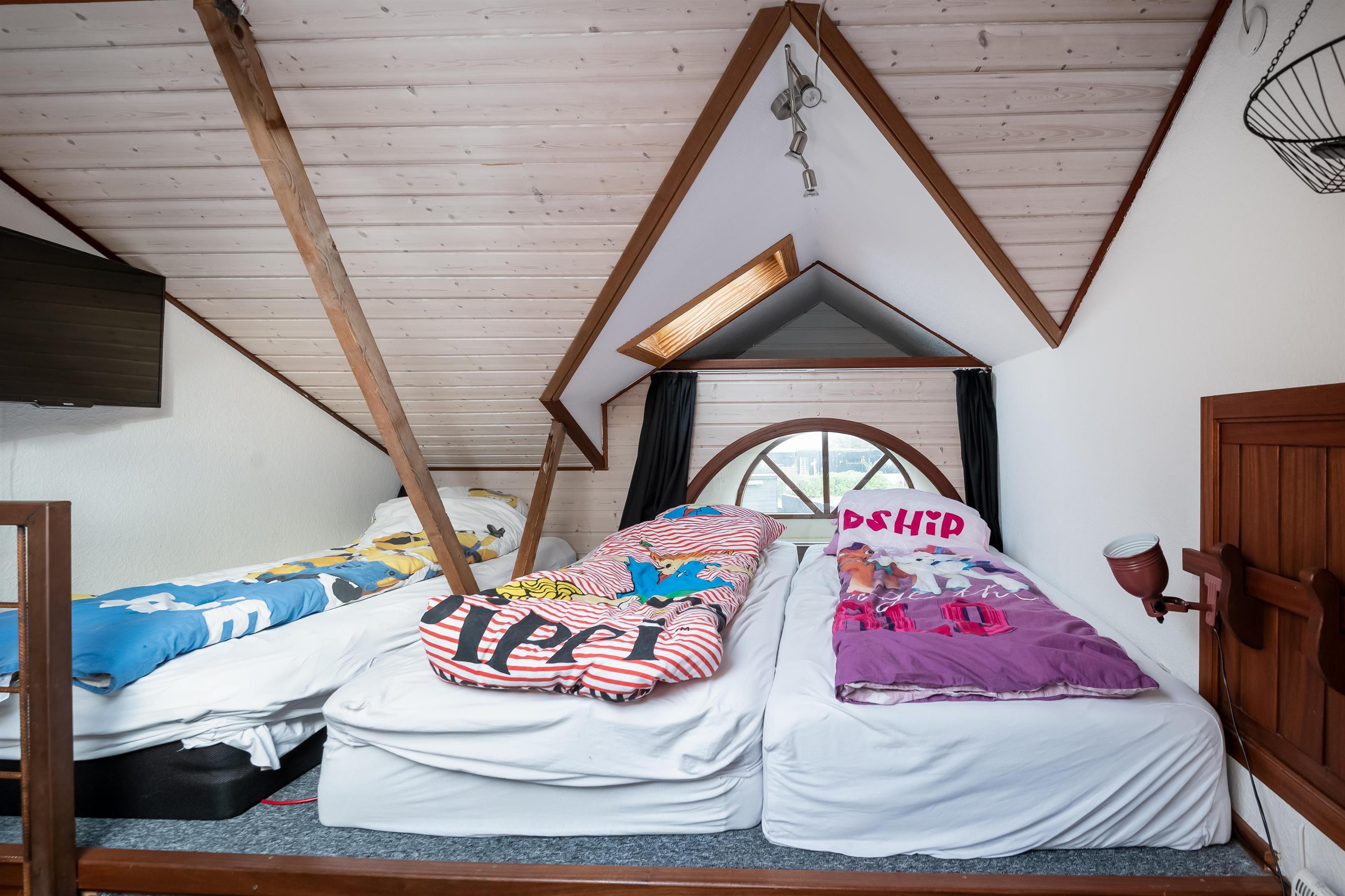 Dieses charmante und intime Haus ist im Erdgeschoss mit einem Wohnzimmer, einer Küche, einem Badezimmer sowie einem Schlafzimmer mit Doppelbett ausgestattet. Vom Wohnzimmer führt eine steile Treppe in das zweite Schlafzimmer/den Schlafboden, wo sich drei Schlafplätze auf drei Matratzen direkt auf dem Boden befinden.