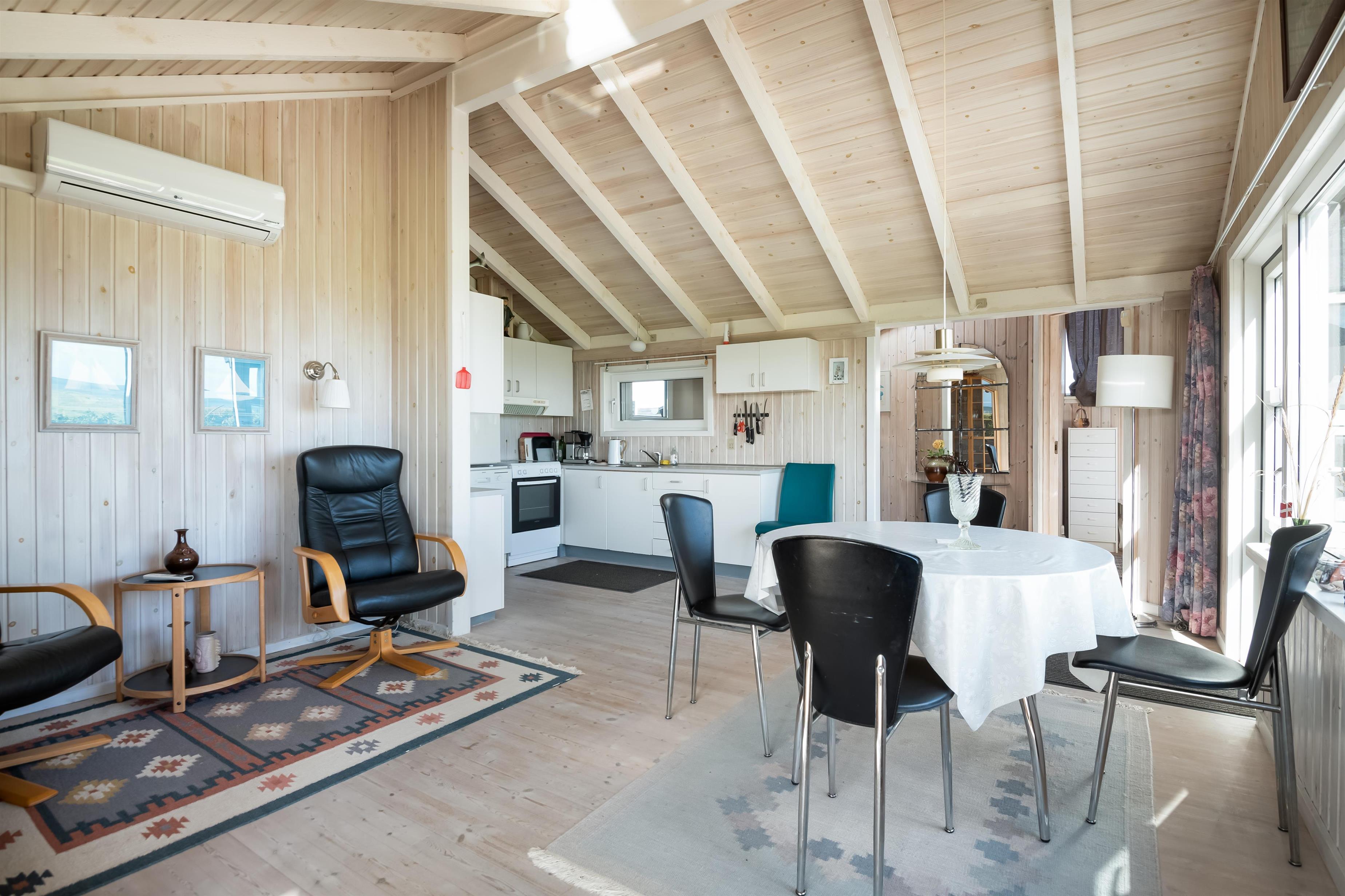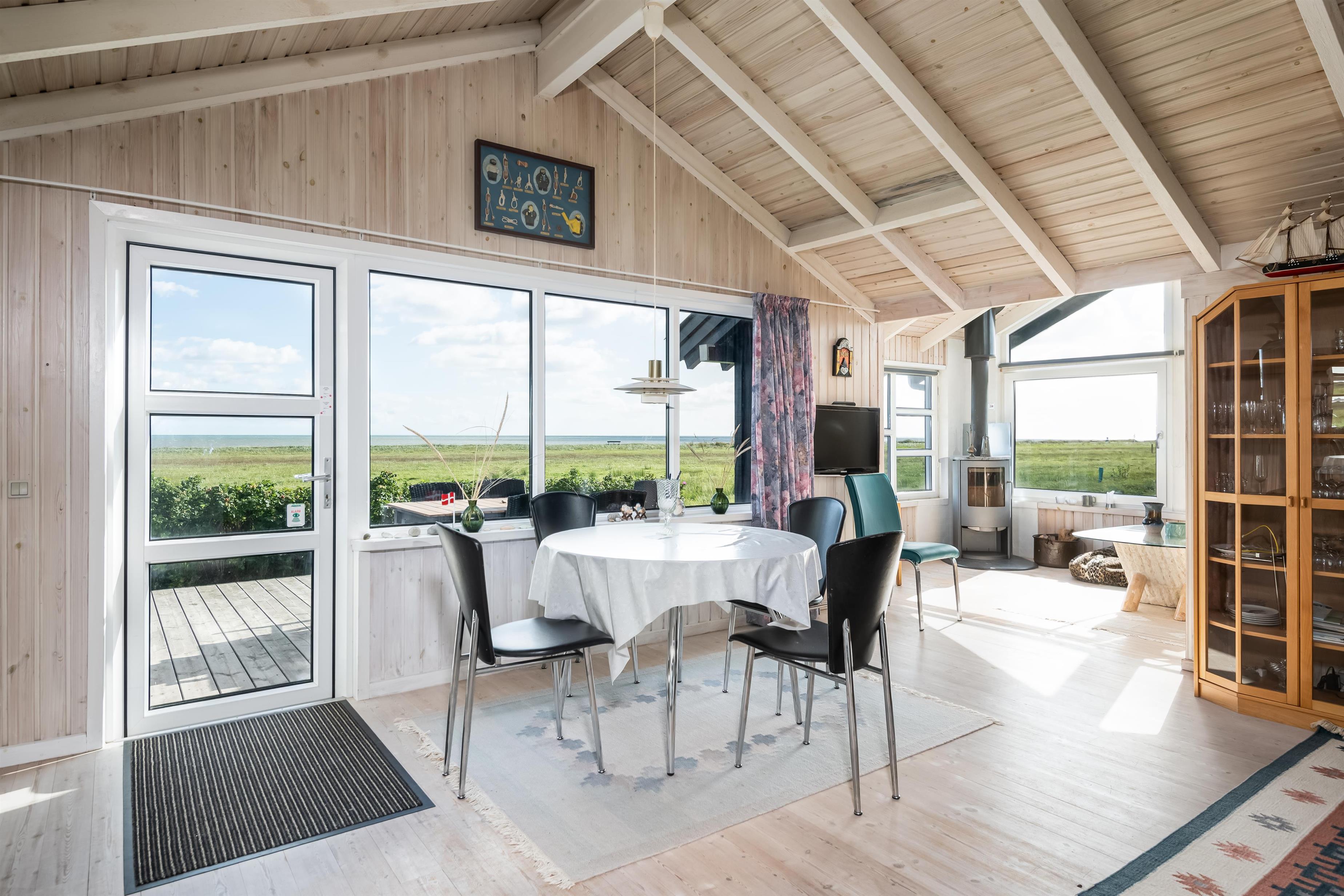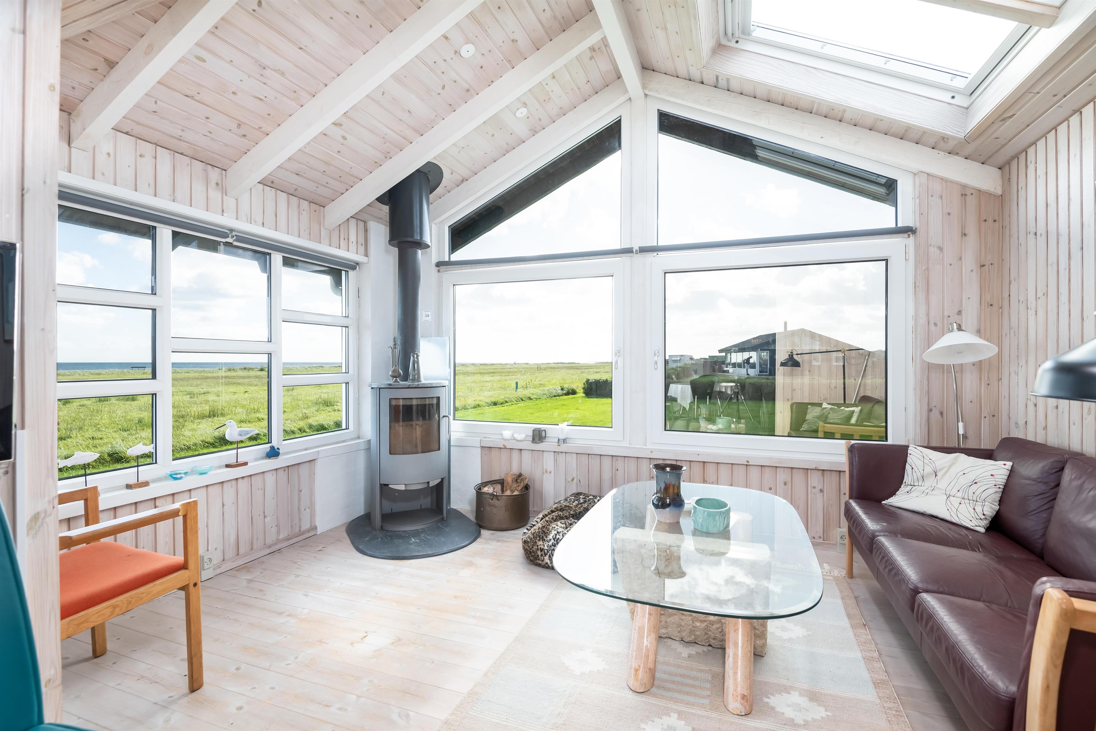 Die Küche ist offen mit dem Essbereich verbunden, und das Wohnzimmer befindet sich in einem kleinen separaten Wintergarten. Hier können Sie die Wärme des Kaminofens genießen und den fantastischen Meerblick über das Kattegat bewundern – das Meer liegt nur 80 Meter vom Haus entfernt.