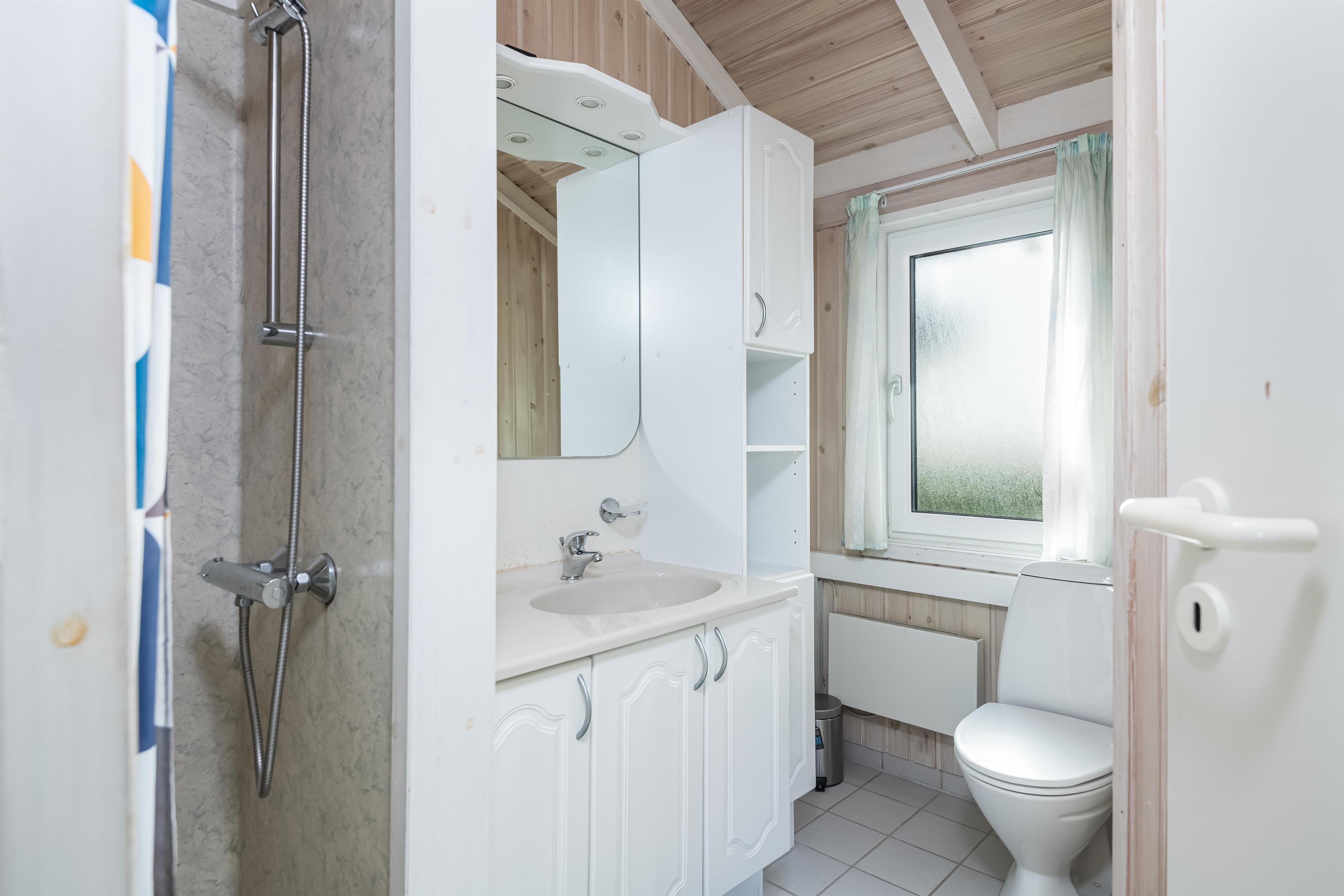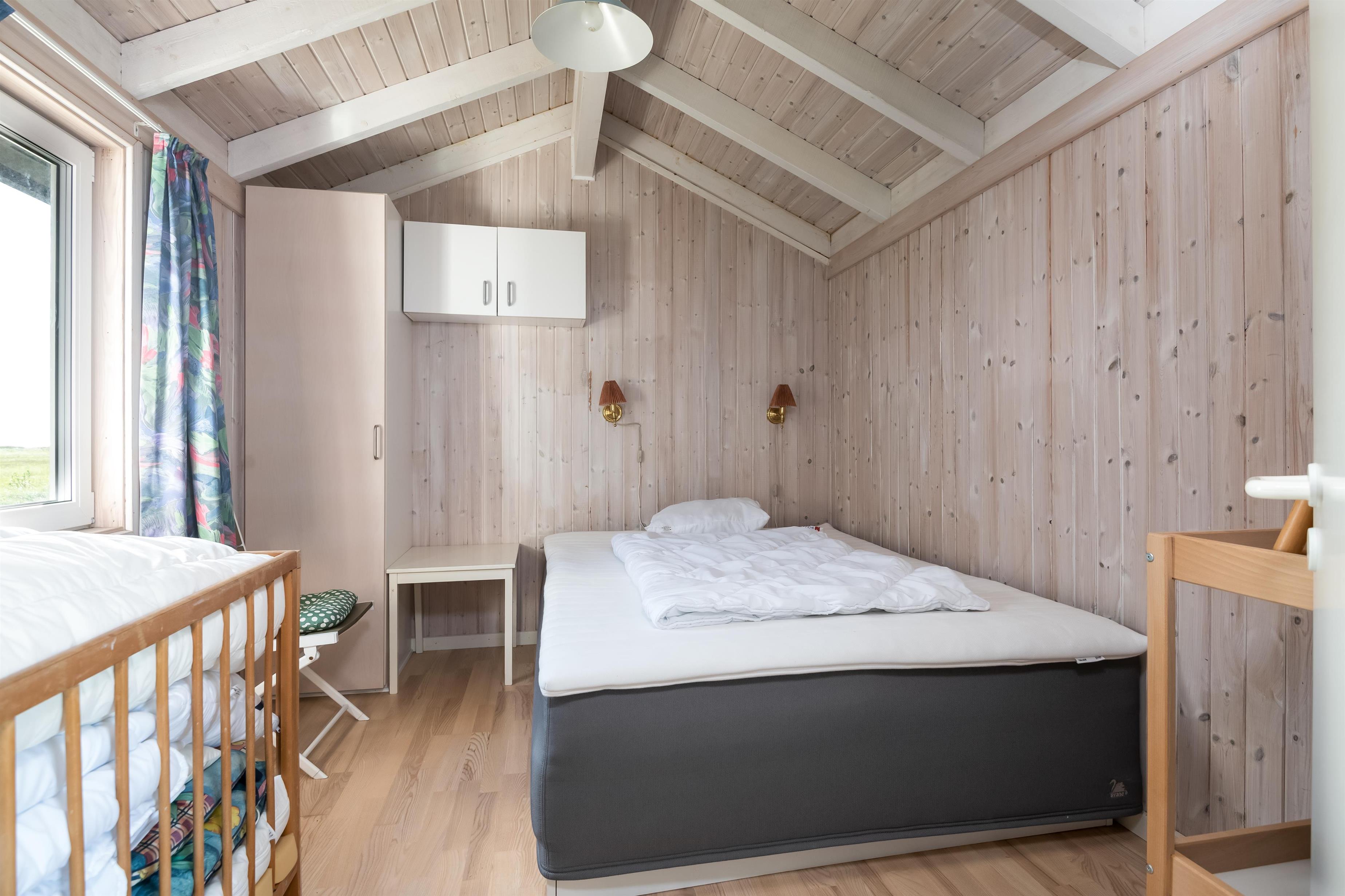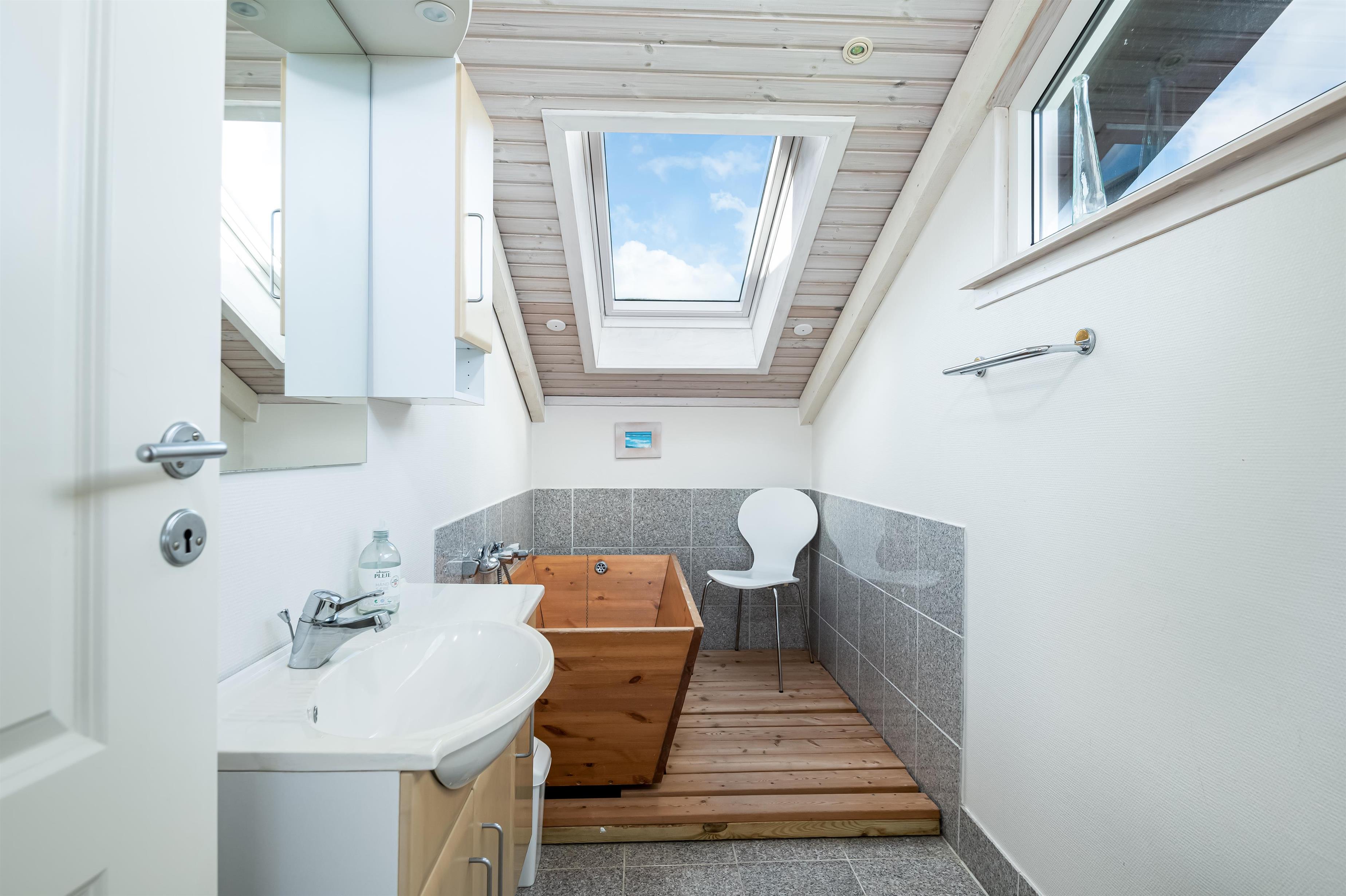 Das Haus hat eine offene Dachkonstruktion mit sichtbaren weißen Balken und eine helle, schlichte Einrichtung. Es gibt zwei Badezimmer – eines davon mit Badewanne und direktem Zugang vom Schlafzimmer, das andere mit Dusche.