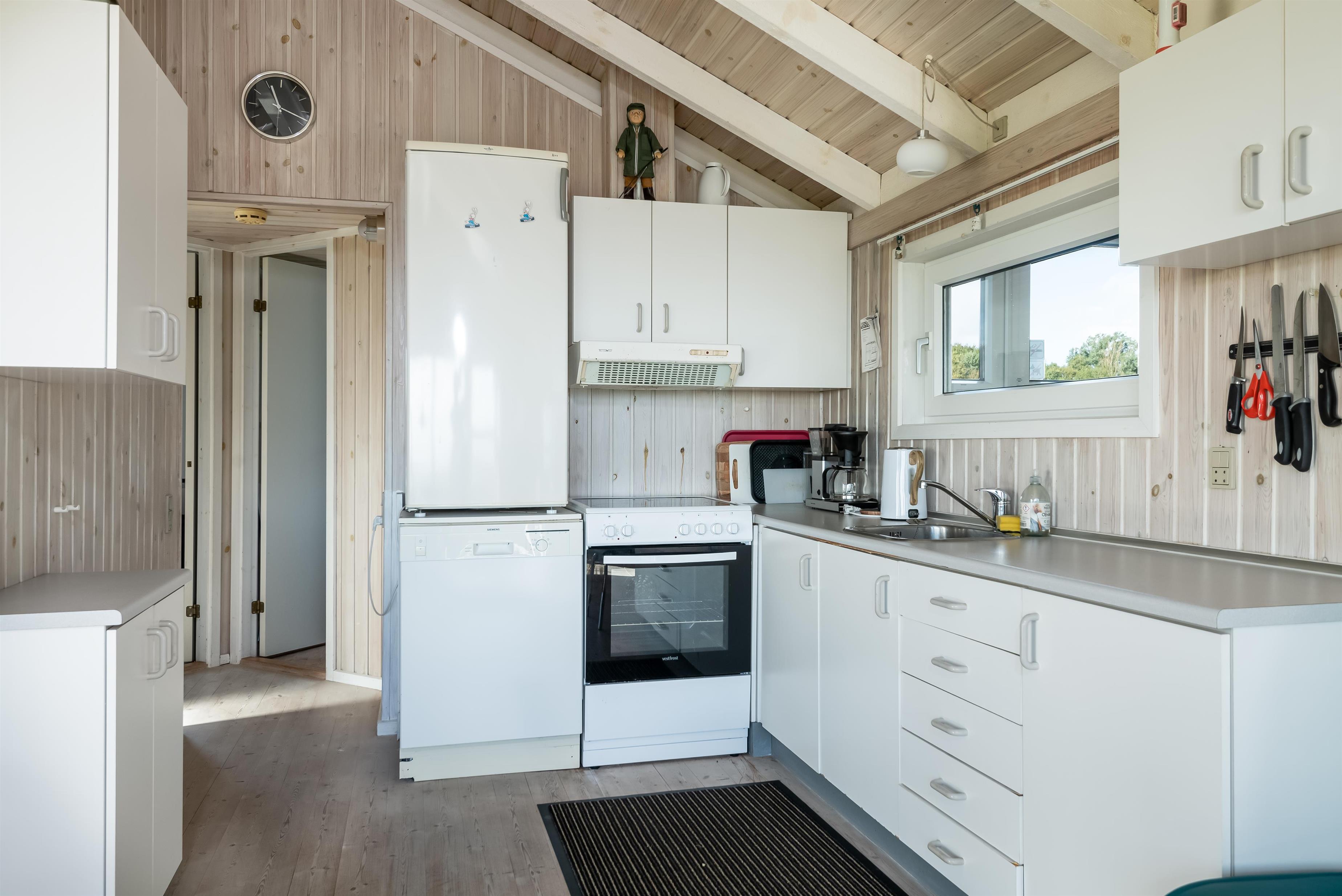 Die Küche ist einfach, aber gut ausgestattet und bietet alles, was Sie zur Zubereitung Ihrer leckeren Ferienmahlzeiten benötigen – Herd, Kühlschrank mit Gefrierfach und Geschirrspüler. Eine Waschmaschine und ein Gefrierschrank stehen ebenfalls zur Verfügung, falls Sie diese benötigen.