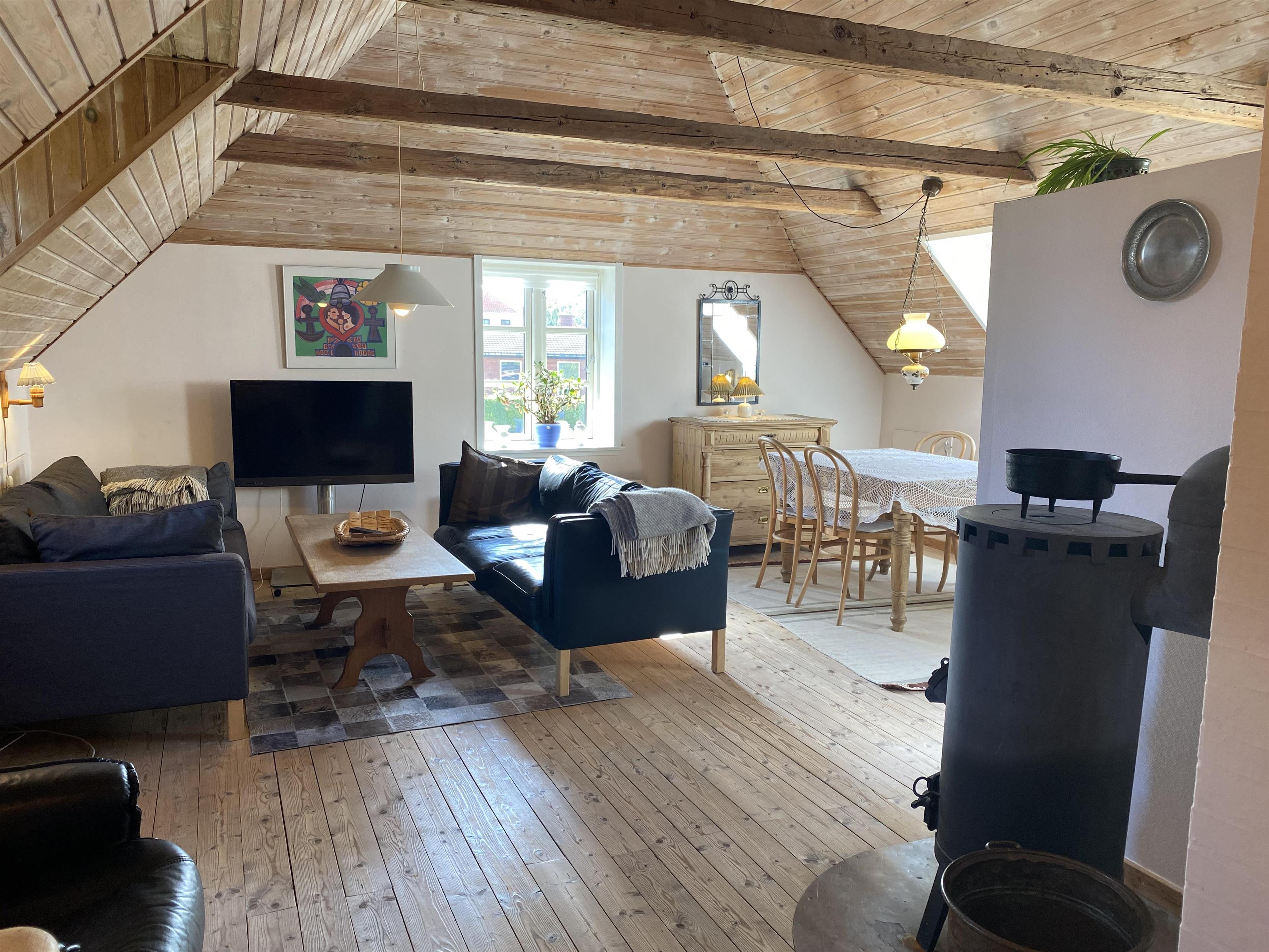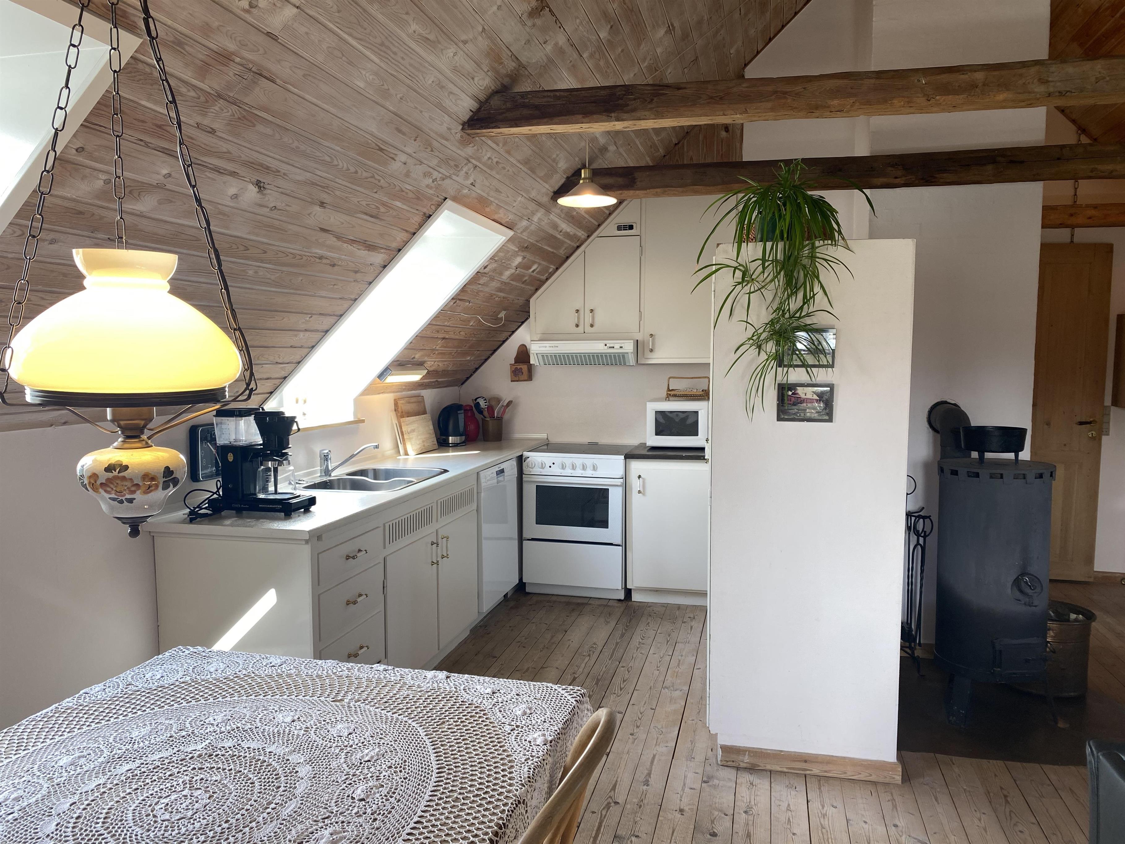 Die Wohnung ist in einem persönlichen und gemütlichen Stil eingerichtet, mit guter Nutzung der Räume und im Einklang mit dem schönen alten Anwesen und dem Garten mit alten, knorrigen Bäumen. Eine kleine, funktionale Küche in einem offenen Raum mit Esstisch und einer Sofaecke mit Fernseher lädt zu Gemütlichkeit und Beisammensein ein. Im Raum gibt es auch einen Holzofen, der an kühleren Abenden oder Tagen für Gemütlichkeit sorgt. Das Badezimmer verfügt über eine Badewanne, wenn man sich im Urlaub extra entspannen möchte. Es gibt zwei Schlafzimmer, beide mit Doppelbetten, und zusätzlich besteht die Möglichkeit, eine Person auf dem Schlafsofa im Wohnzimmer unterzubringen.