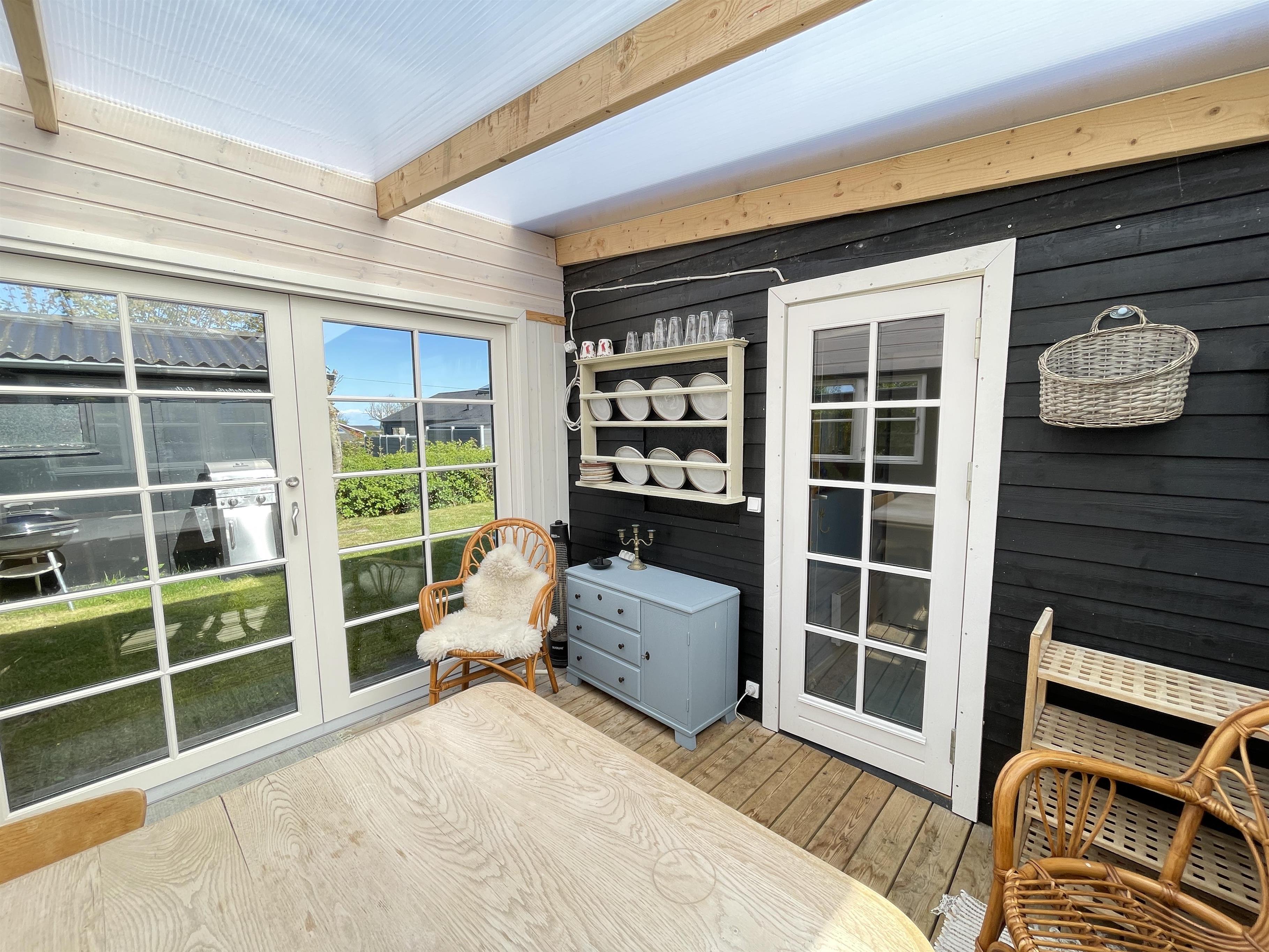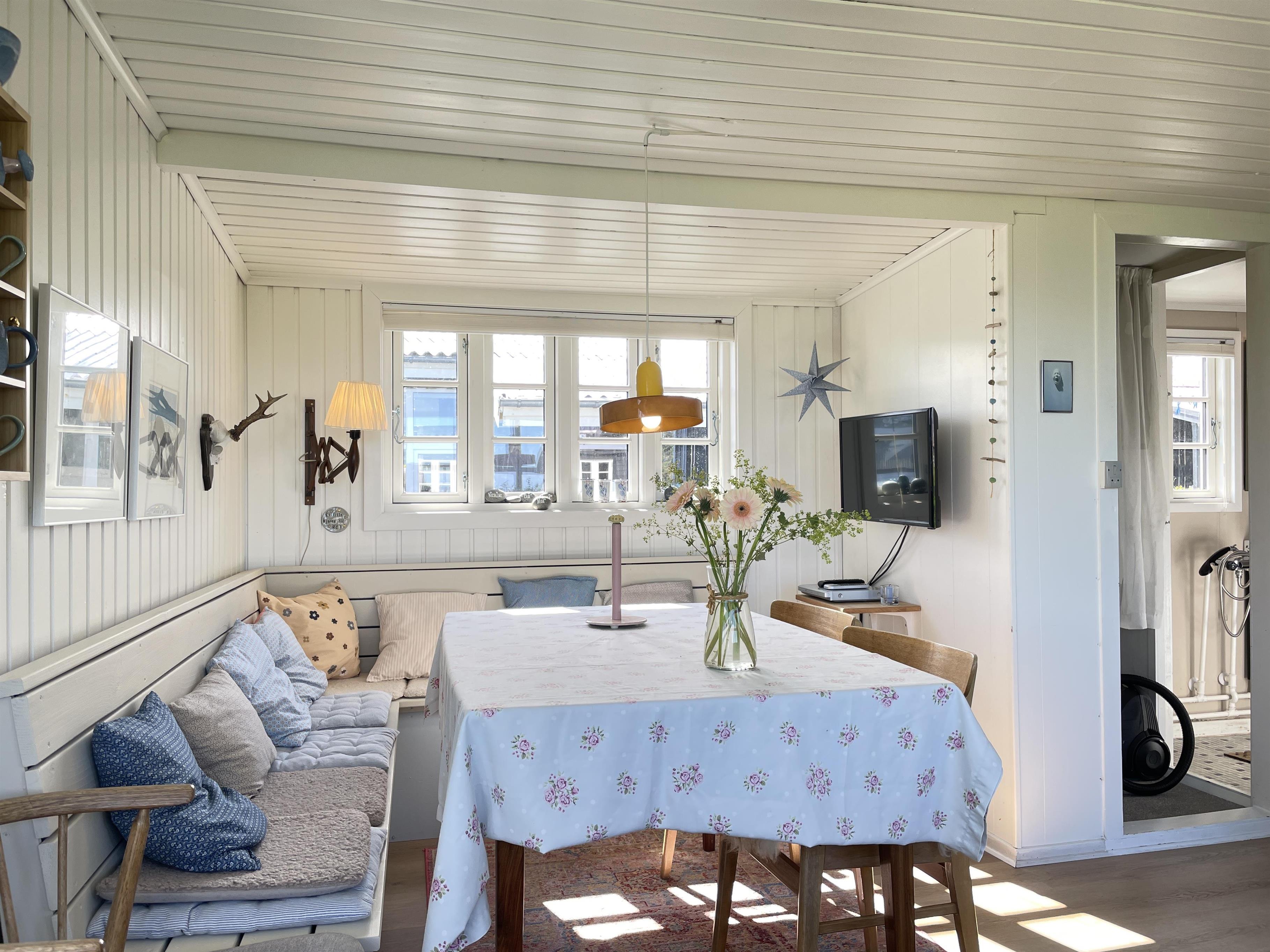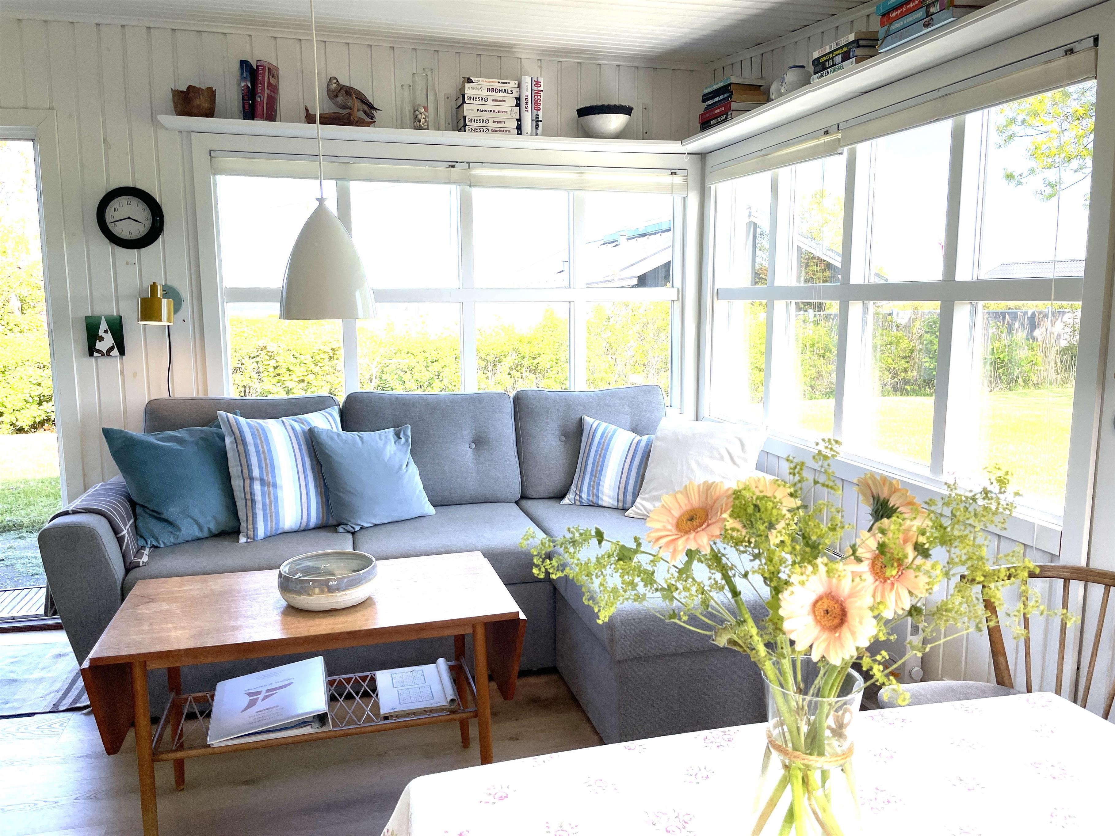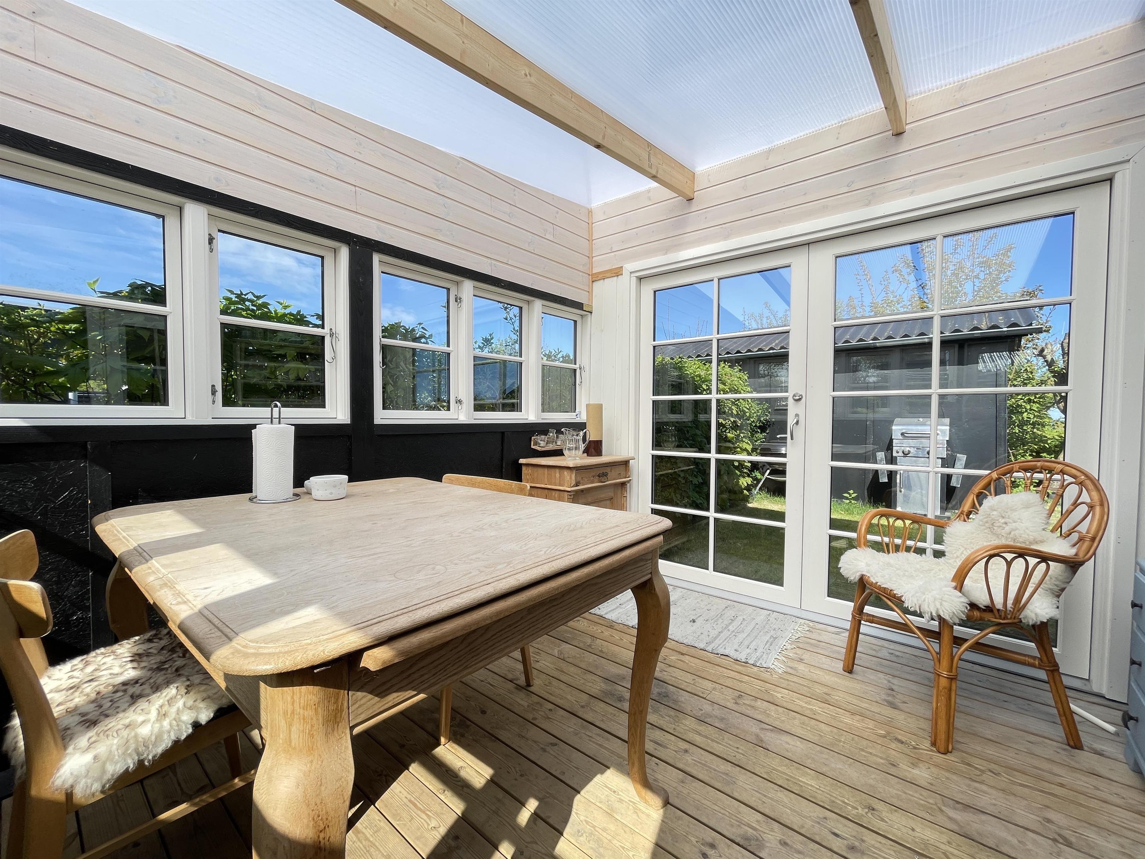Das Wohnzimmer des Hauses wurde stilvoll renoviert – mit neuem Boden und neuen Möbeln. Es strahlt eine wunderbare Gemütlichkeit und einen besonderen Charme aus. Eine Essecke und ein gemütliches Sofa im Erker laden zum Verweilen ein – mit Blick auf das Kattegat, das nur 200 Meter entfernt liegt. Die Natur rund ums Haus sorgt für erholsame Ruhe. Direkt am Haus befindet sich ein herrlicher kleiner Wintergarten.