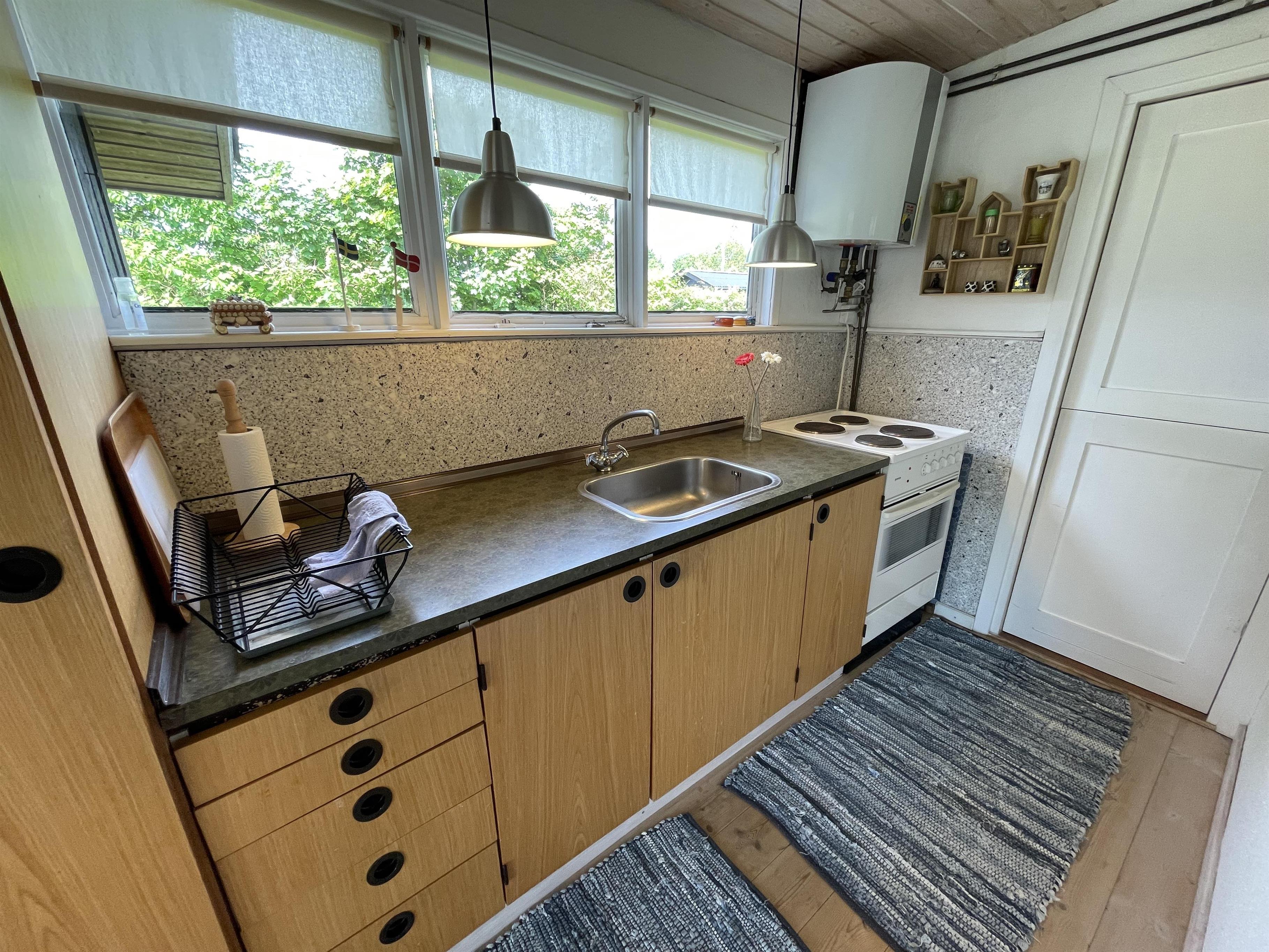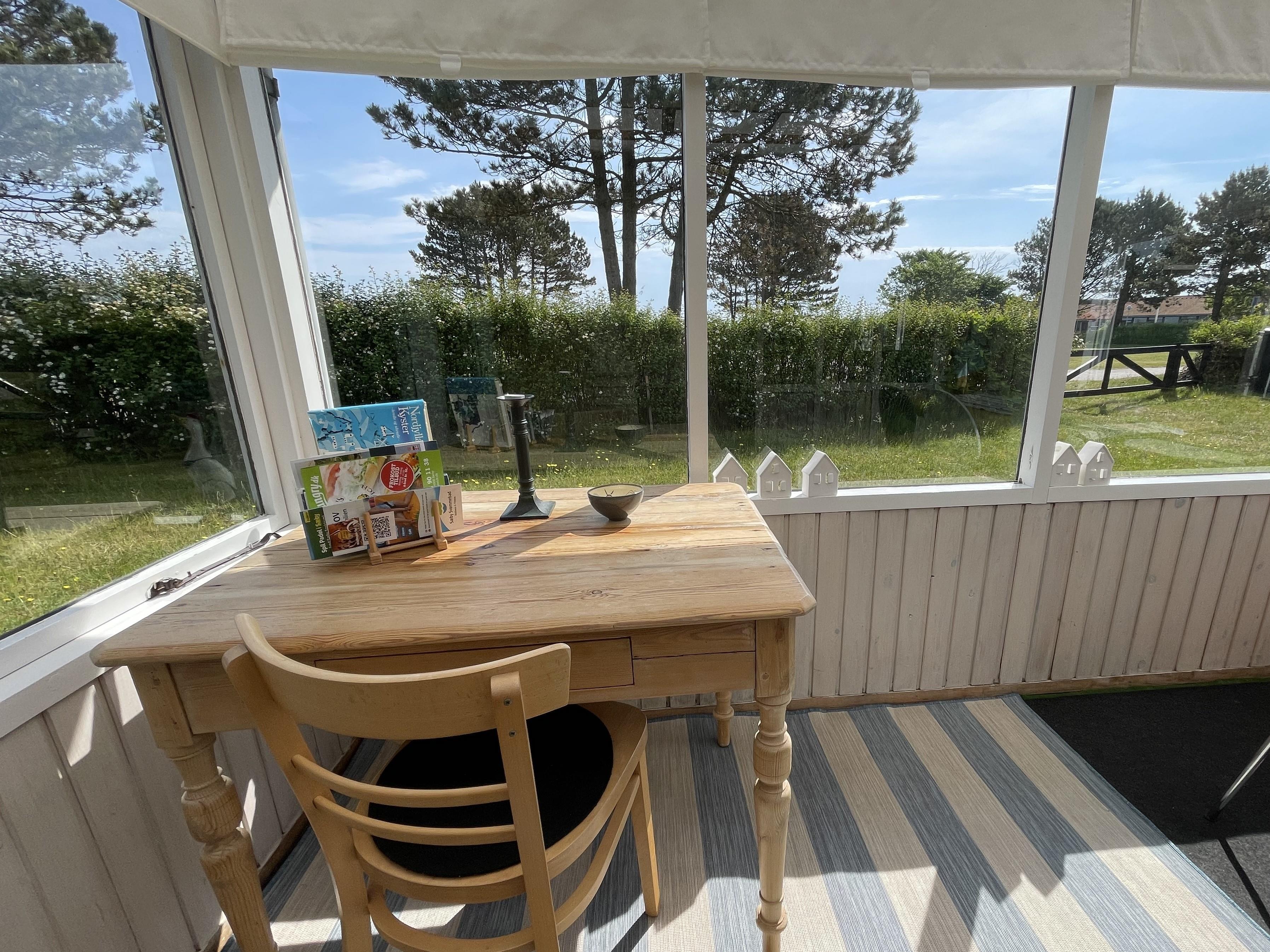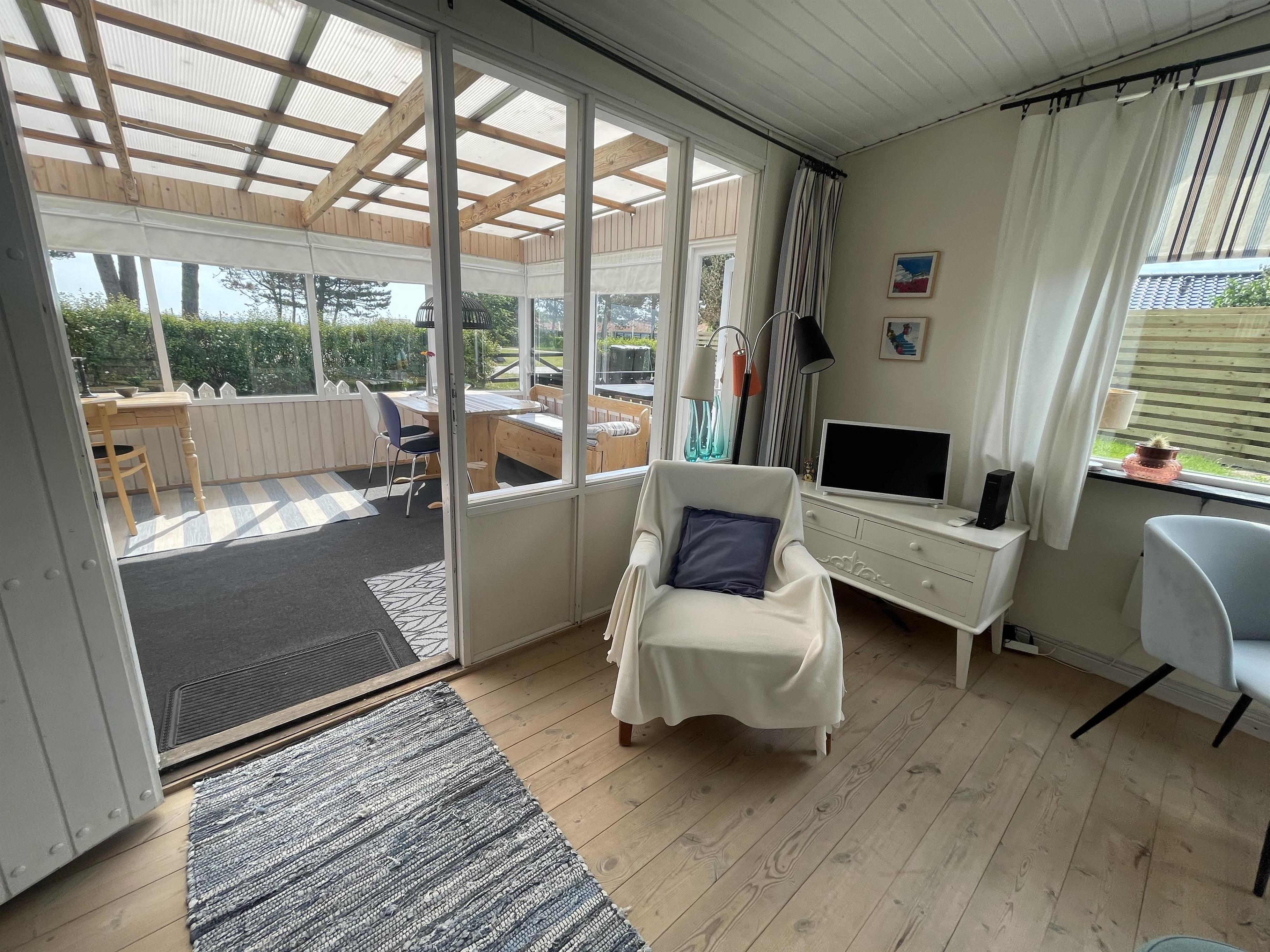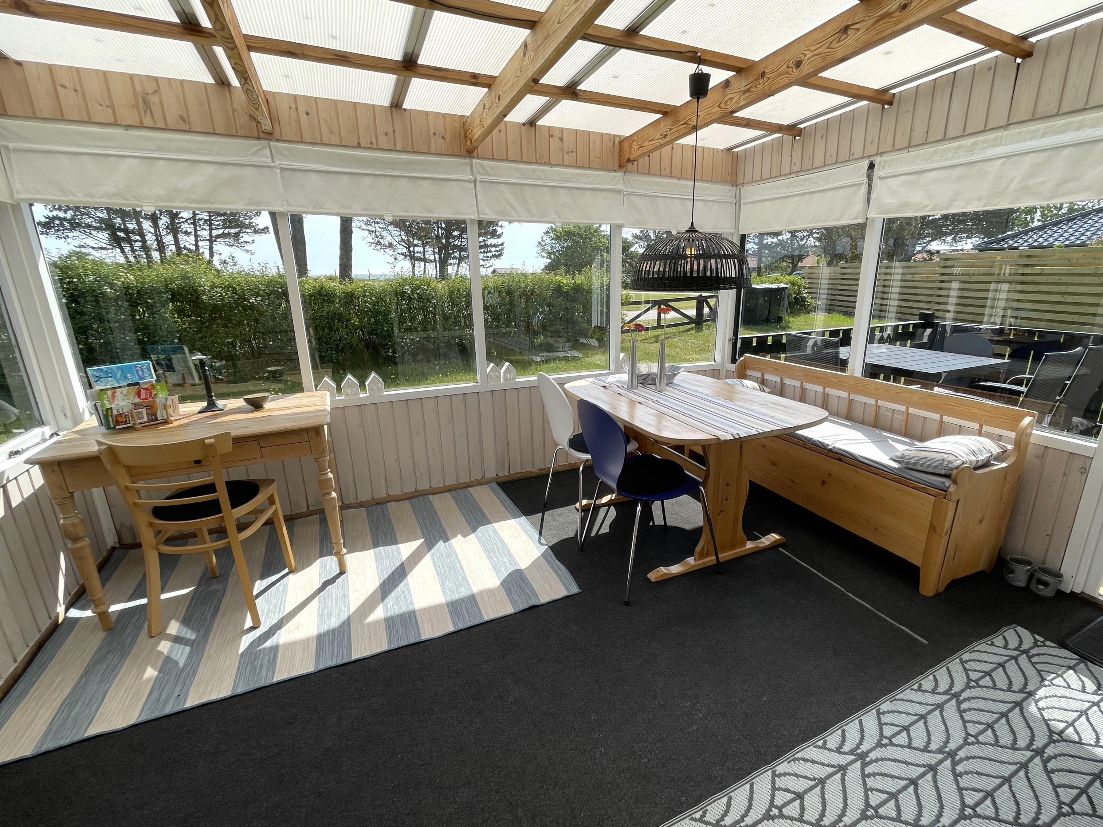 Die Einrichtung ist einfach und funktional – mit einer kleinen, gut ausgestatteten Küche und einem gemütlichen Wohnzimmer, in dem man das Licht durch die großen Fenster genießen kann. Vom Wohnzimmer aus gelangt man in einen kleinen Wintergarten mit klassischer Eckbank und Essbereich – ein perfekter Ort für den Morgenkaffee oder entspannte Abende mit Blick aufs Meer.