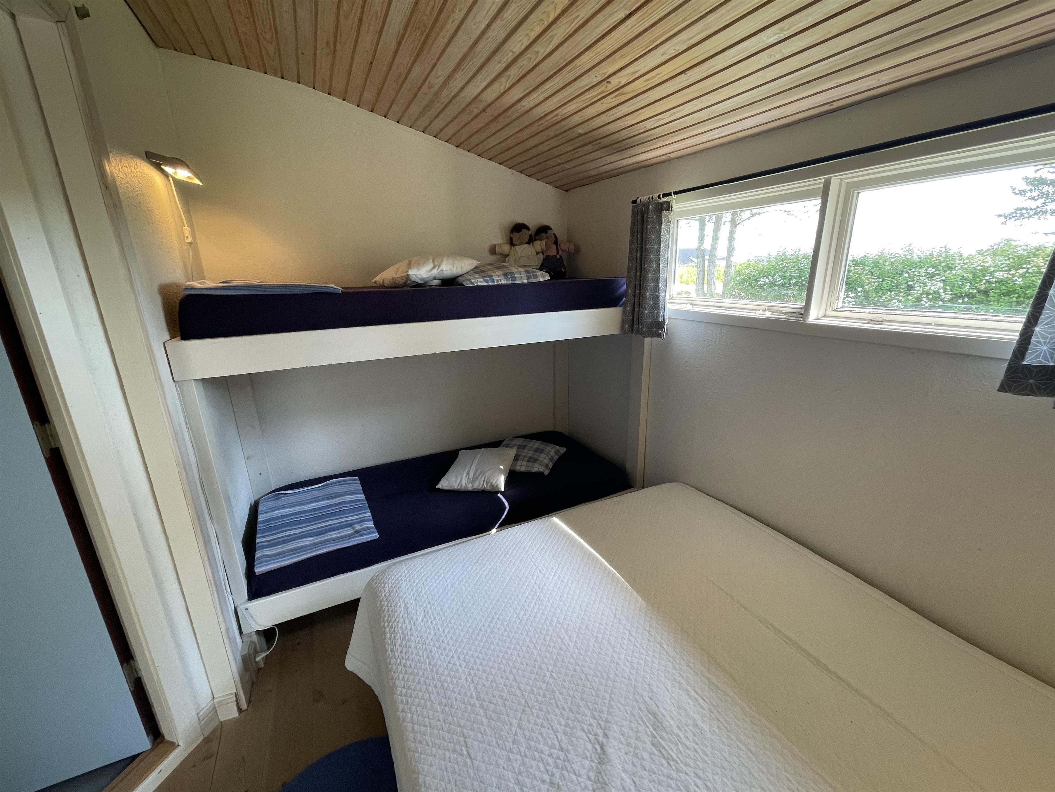 Das Ferienhaus verfügt über zwei Schlafzimmer: Eines mit einem ¾-Bett und einem Etagenbett – ideal für Kinder. Das zweite Schlafzimmer mit Doppelbett erreicht man über die Küche und die Terrasse, was eine angenehme, private Atmosphäre schafft.