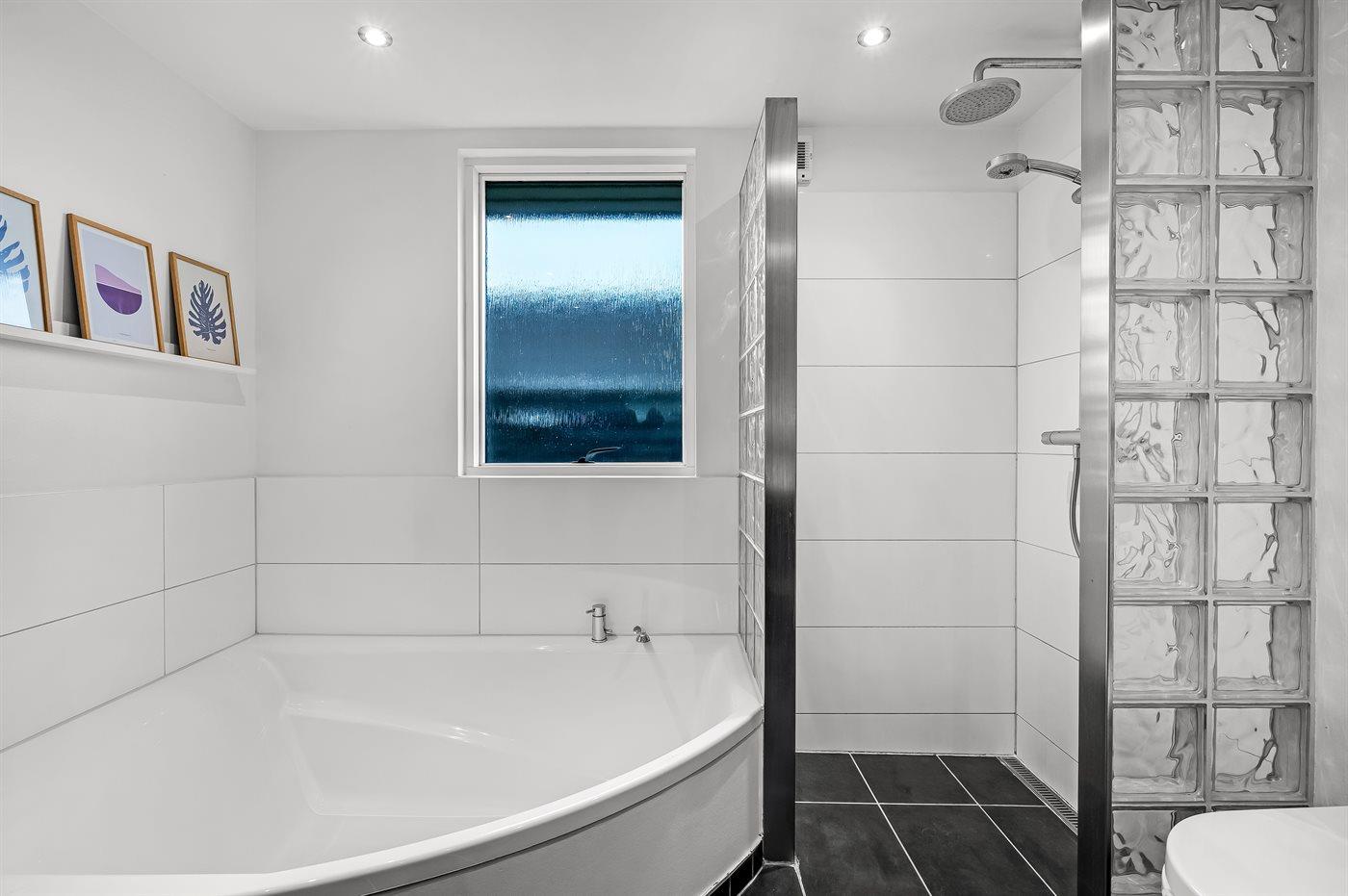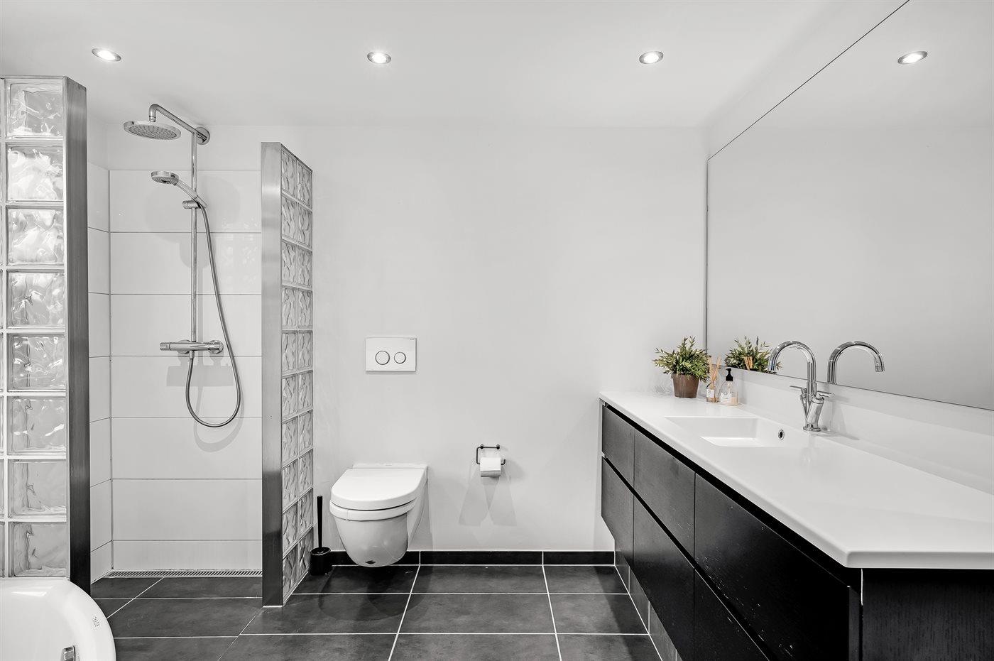 Es gibt 1 Badezimmer mit Fußbodenheizung, Badewanne sowie Duschnische und 1 Badezimmer mit Fußbodenheizung und Duschnische.
