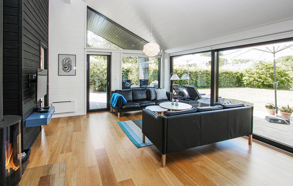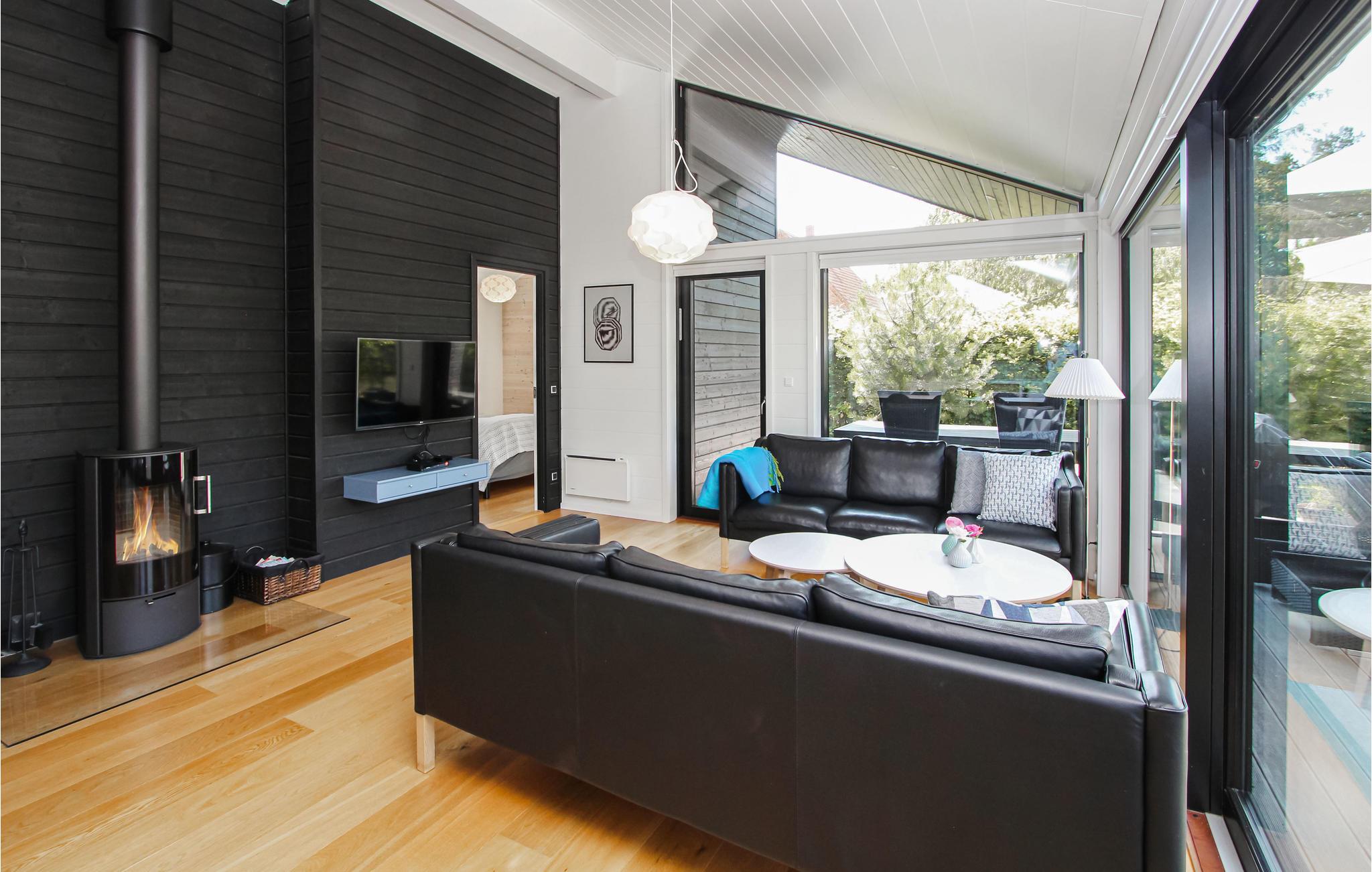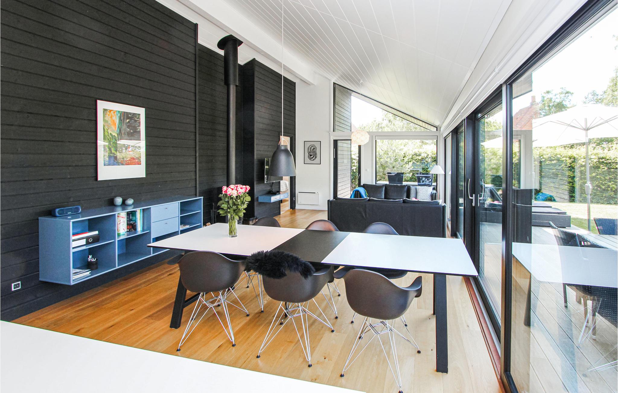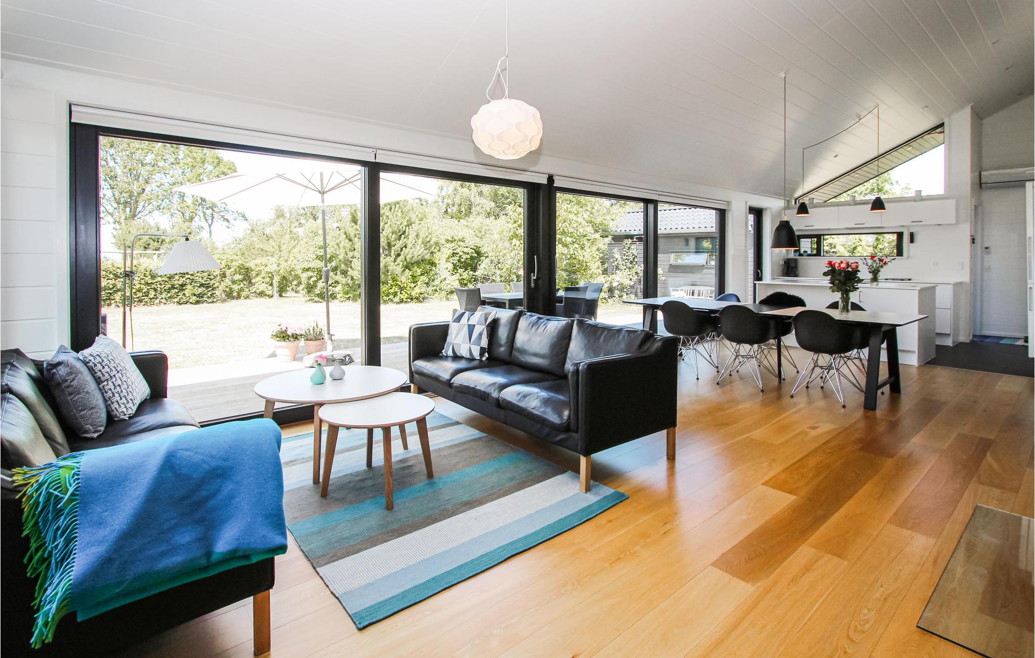 Modernes Ferienhaus auf Samsø mit Meerblick und gemütlichem Kamin für entspannte Urlaubstage.