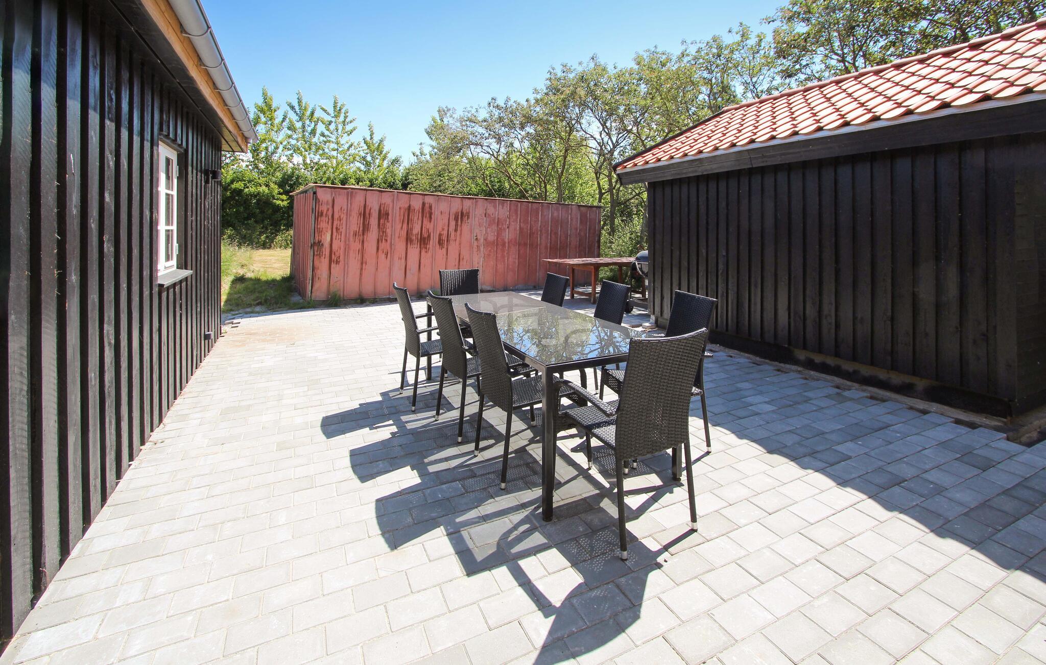 Draußen erwartet Sie eine große Terrasse mit Sitzmöglichkeiten, ideal für gesellige Grillabende an der frischen Luft. Nutzen Sie den windgeschützten Innenhof für ein Sonnenbad oder erfrischen Sie sich an der praktischen Außendusche nach einem Strandtag.