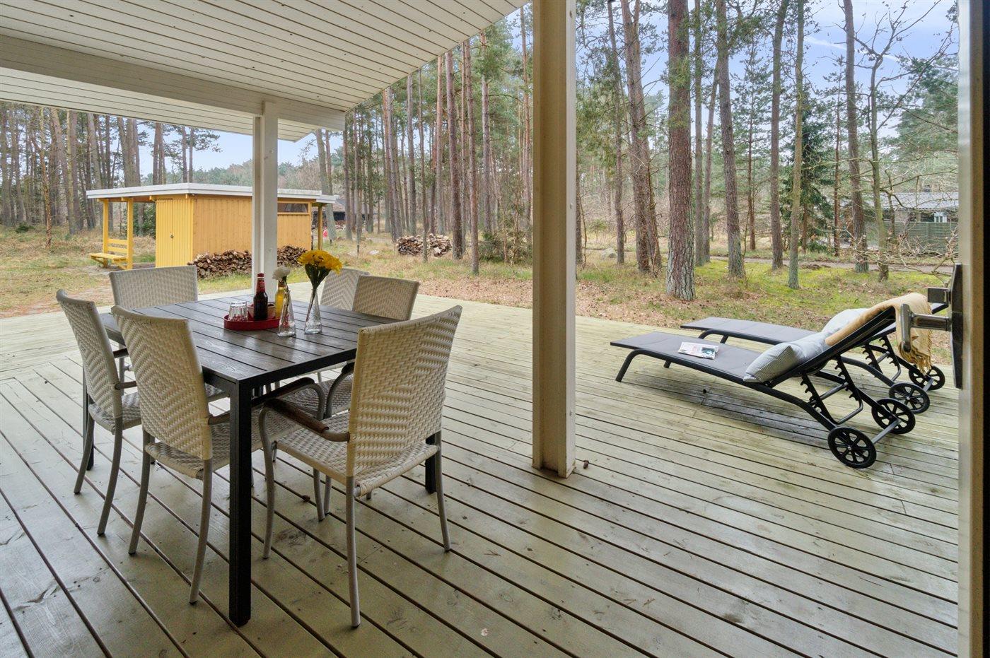 Zum Haus gehört eine nach Osten ausgerichtete Terrasse, auf der du deinen Kaffee unter den ersten Strahlen der Morgensonne genießen kannst. Auf der anderen Seite des Hauses gibt es eine große, teilweise abgeschirmte und überdachte Terrasse – der perfekte Aufenthaltsort für gemütliche Beisammensein.