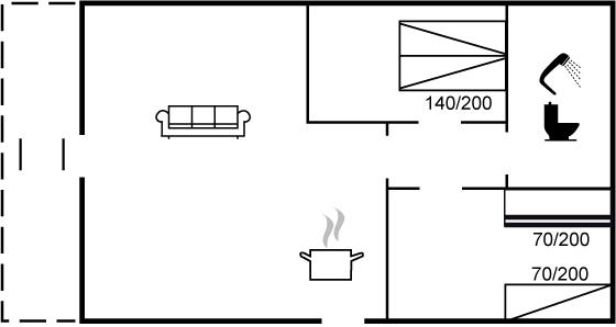 Die Schlafplätze verteilen sich auf 2 Schlafräume. 2 Schlafplätze in einem Doppelbett.1 Schlafplatz in einem Einzelbett. 2 Schlafplätze in einem Etagenbett.