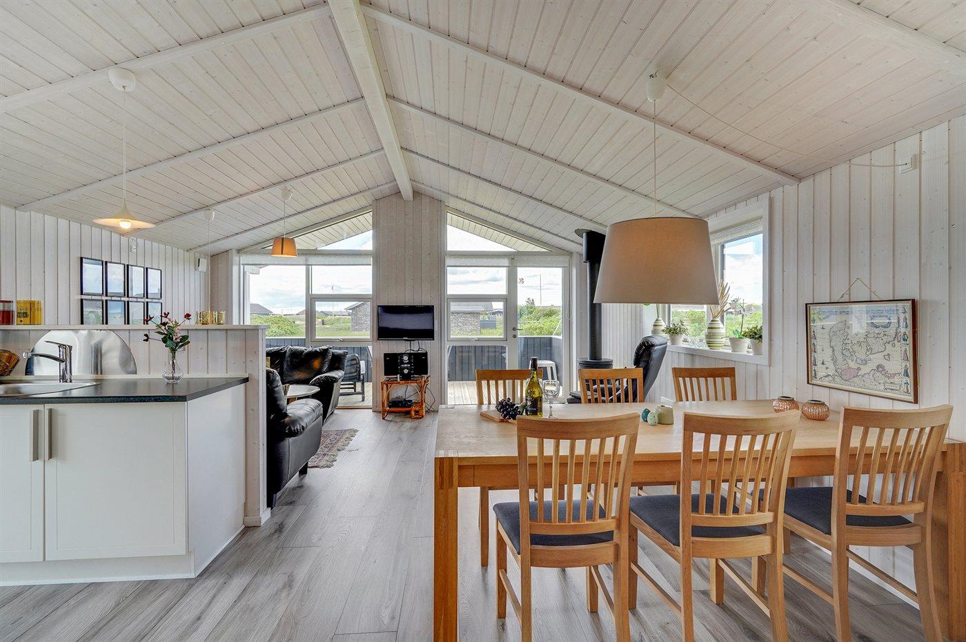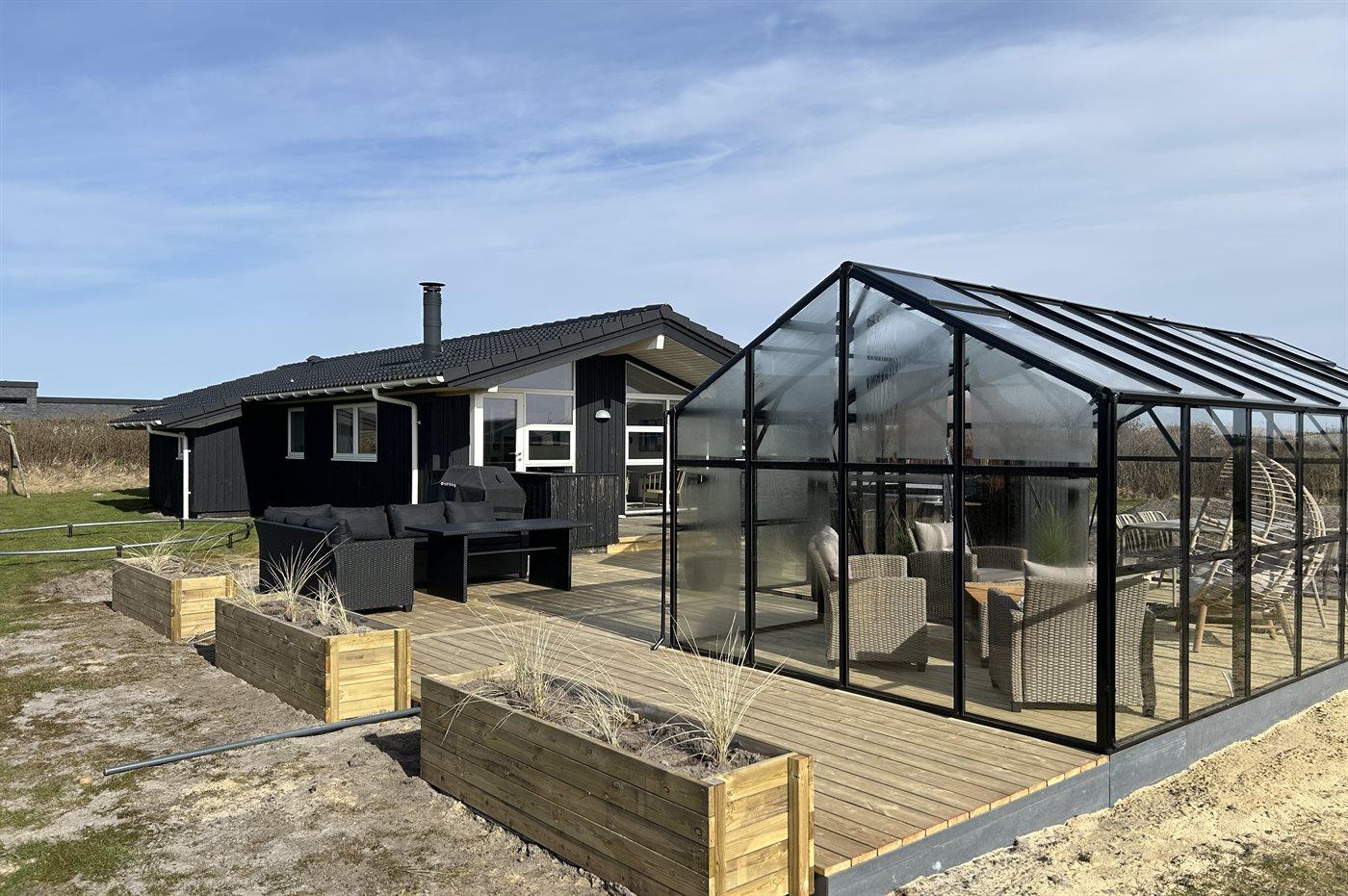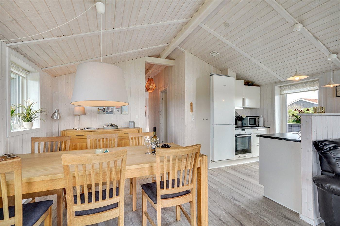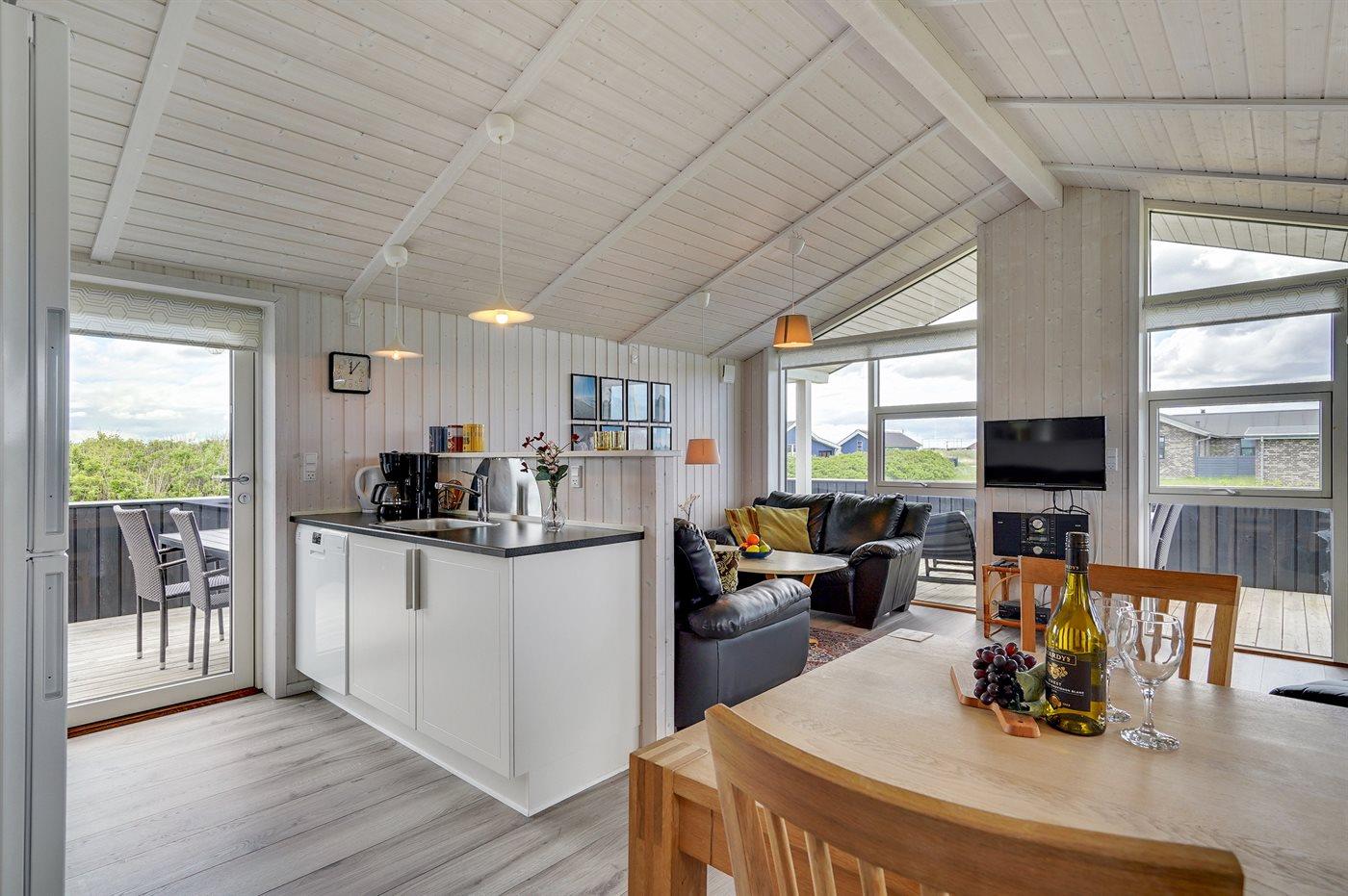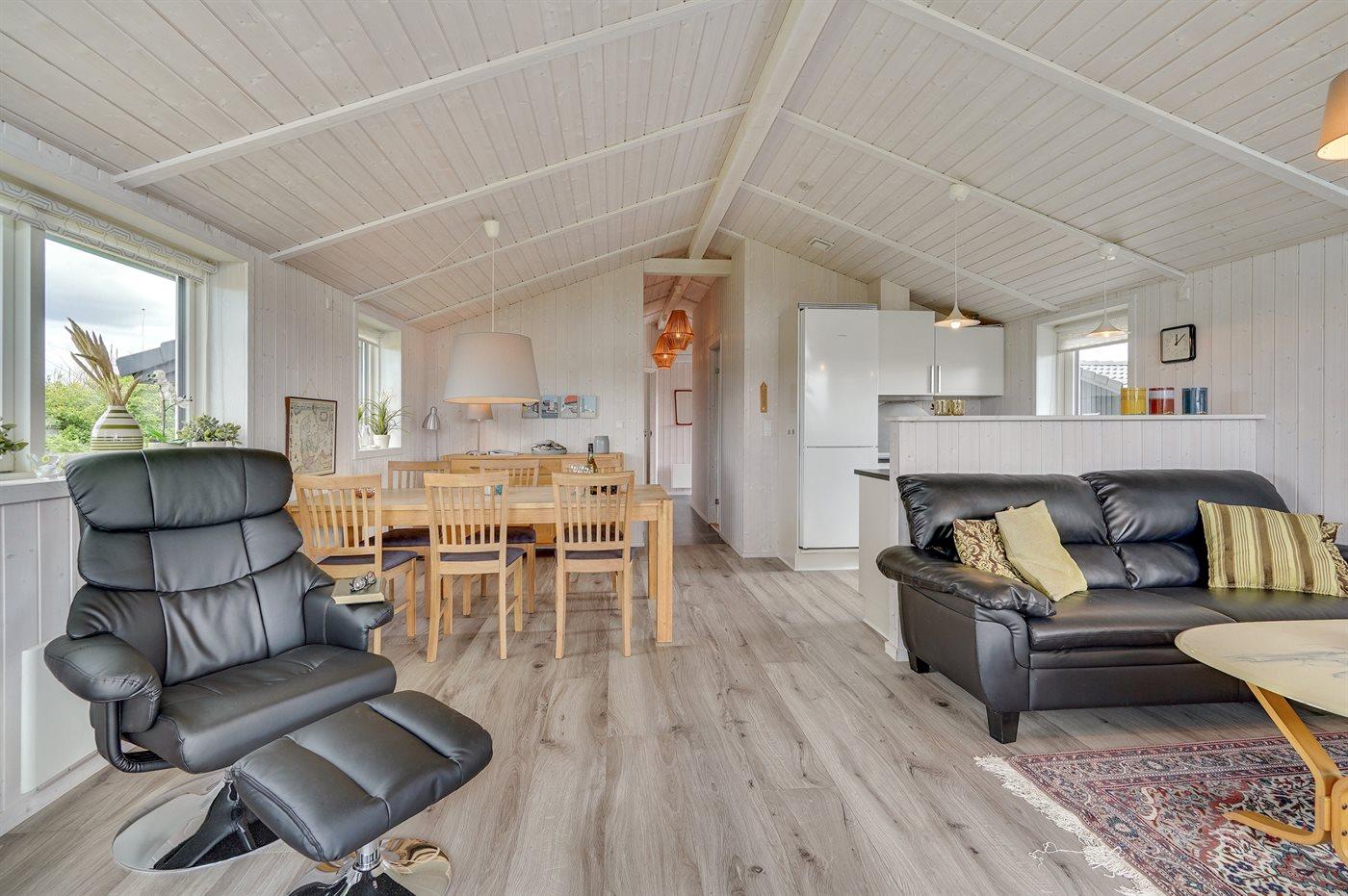 Dieses besonders schöne Ferienhaus, 2017 gebaut, liegt auf einem großen Grundstück mit Platz für Ballspiele und andere Aktivitäten im Freien. Das Haus ist hell und geschmackvoll eingerichtet und im gemütlichen Wohn-/Esszimmer sorgt die große Fensterfront für einen guten Lichteinfall. Zum Haus gehört eine schöne und geschlossene, zum Teil überdachte Terrasse mit Gartenmöbeln – vor dem Wind geschützt.