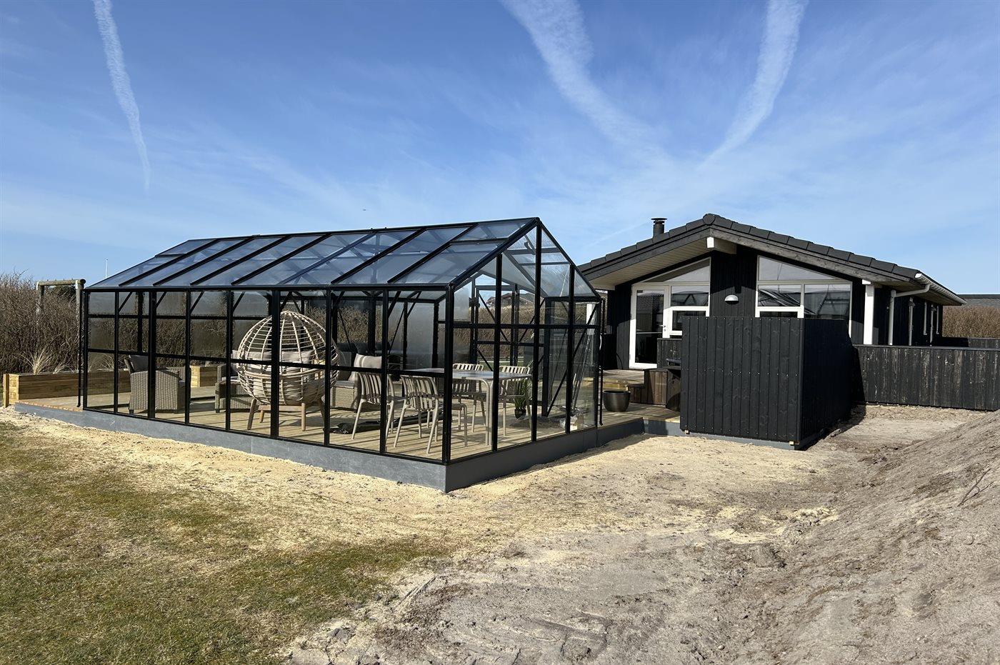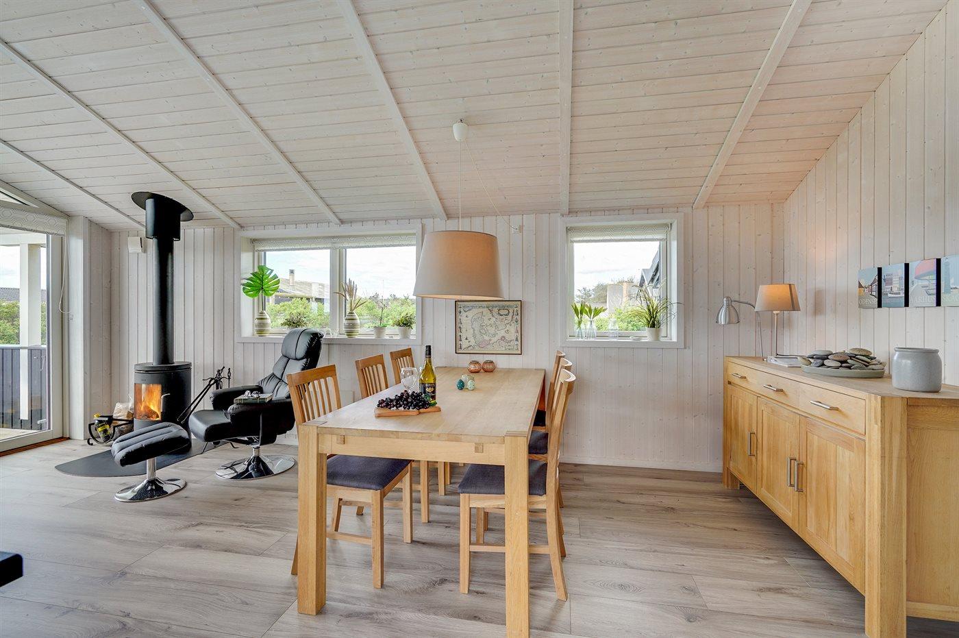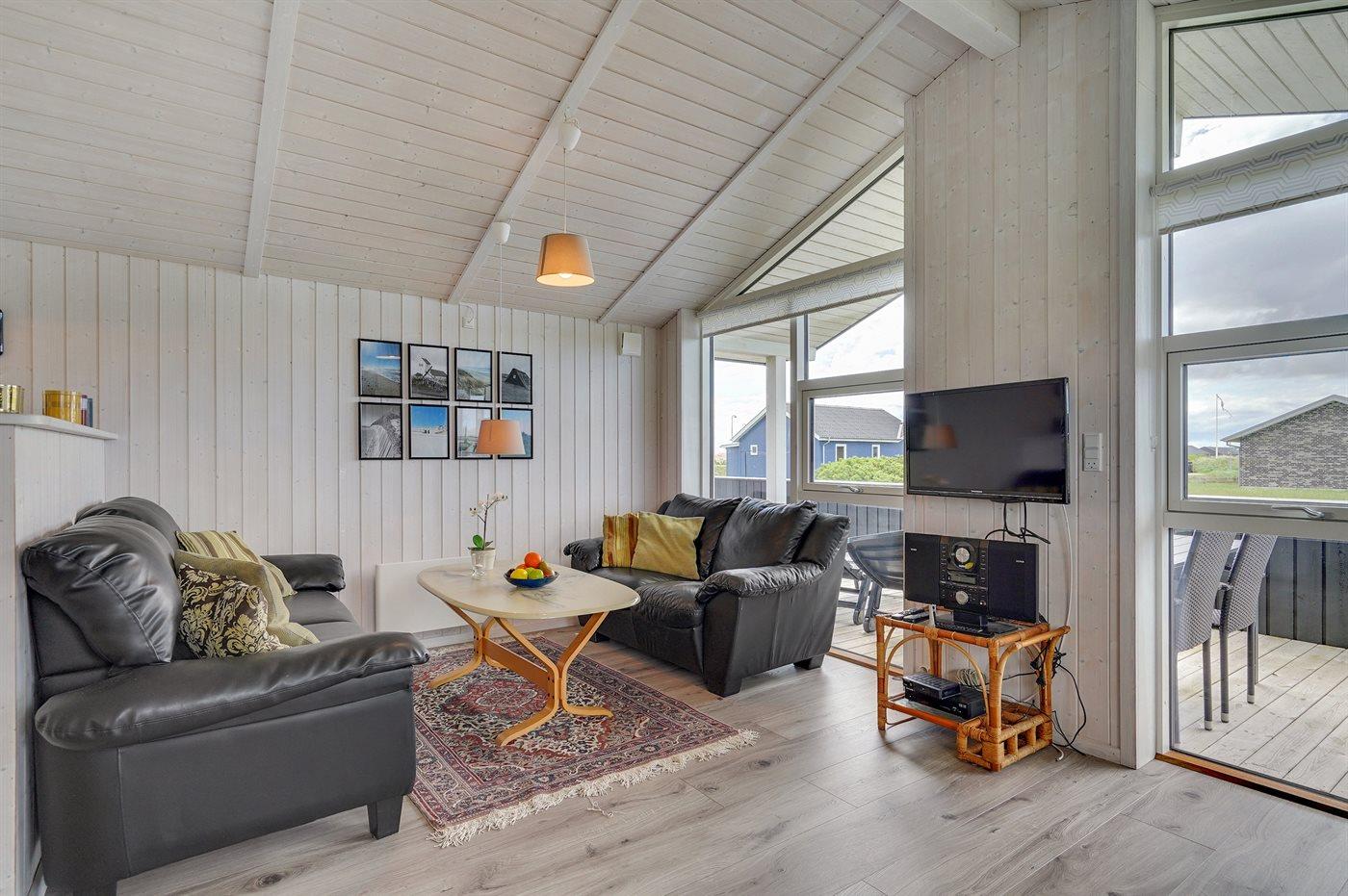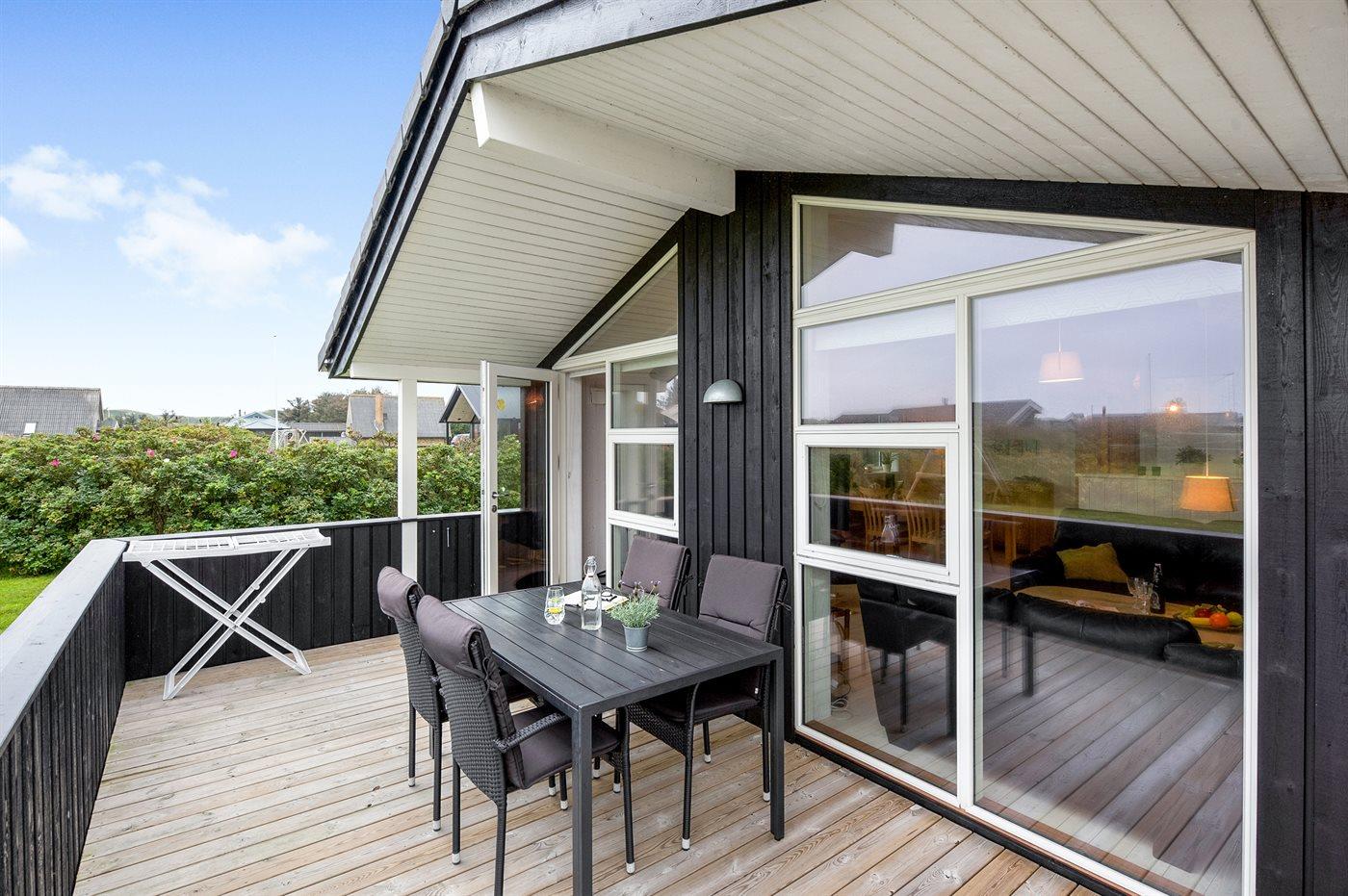 Dieses besonders schöne Ferienhaus, 2017 gebaut, liegt auf einem großen Grundstück mit Platz für Ballspiele und andere Aktivitäten im Freien. Das Haus ist hell und geschmackvoll eingerichtet und im gemütlichen Wohn-/Esszimmer sorgt die große Fensterfront für einen guten Lichteinfall. Zum Haus gehört eine schöne und geschlossene, zum Teil überdachte Terrasse mit Gartenmöbeln – vor dem Wind geschützt.