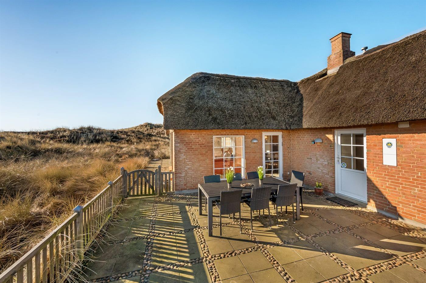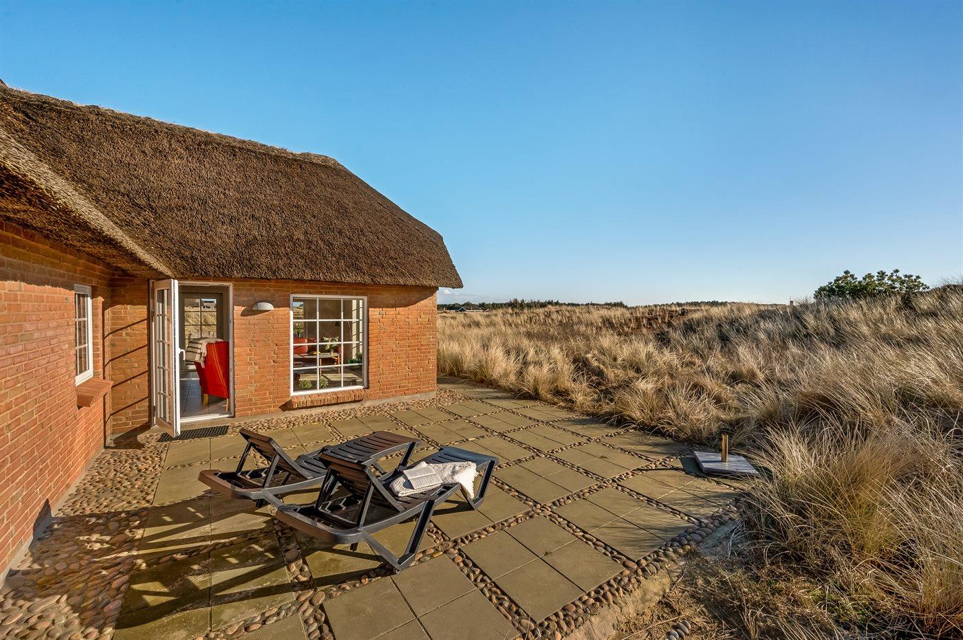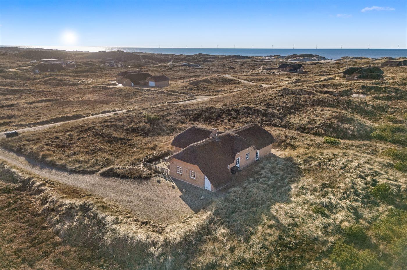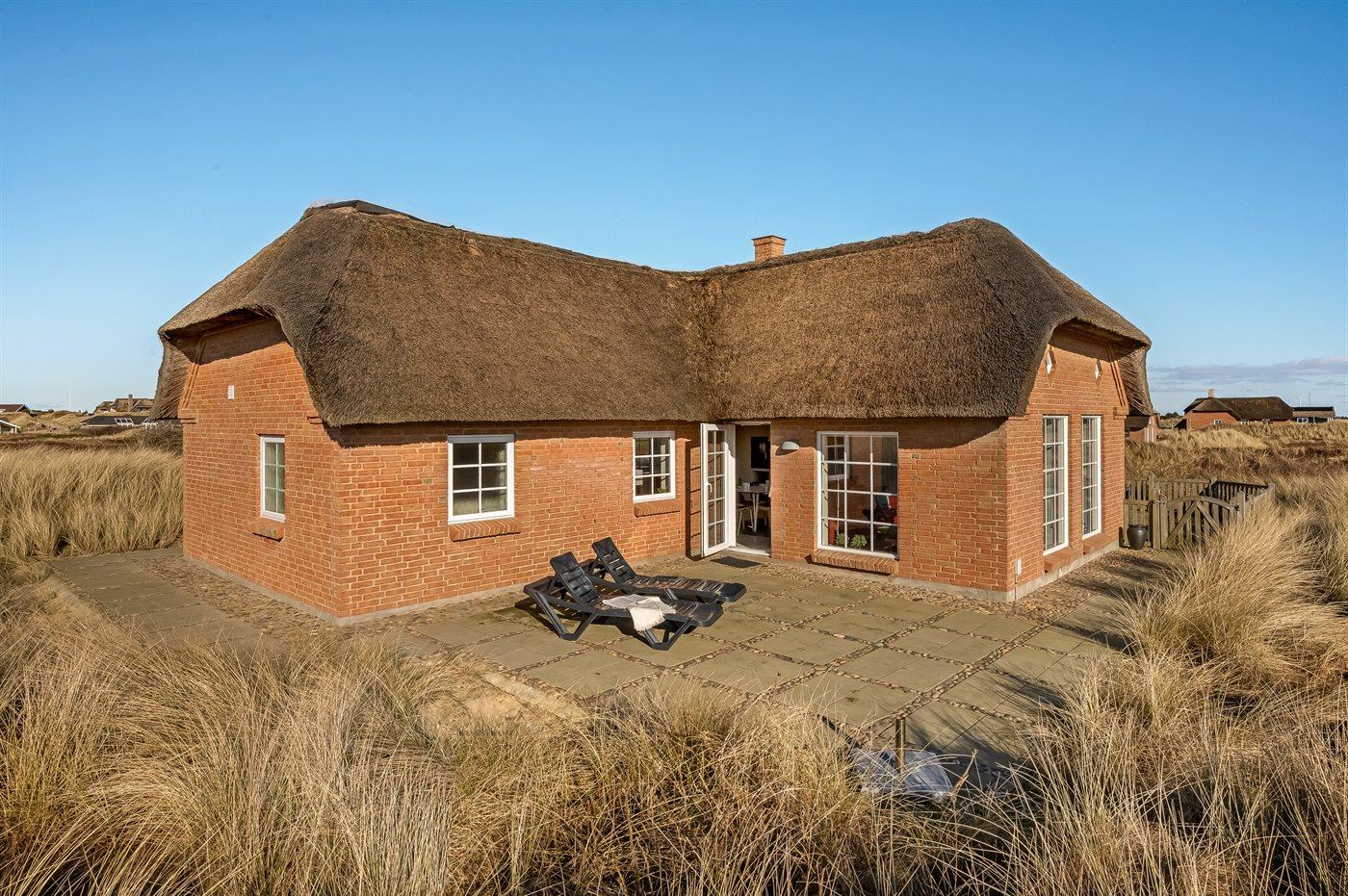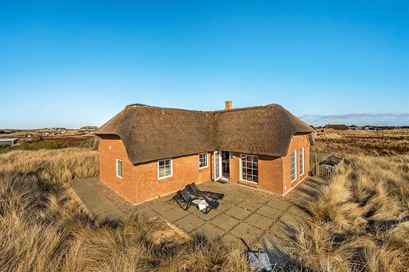 Gemütliches Ferienhaus mit Reetdach nahe Meer und Fjord in Søndervig, ideal zum Entspannen in malerischer Natur.