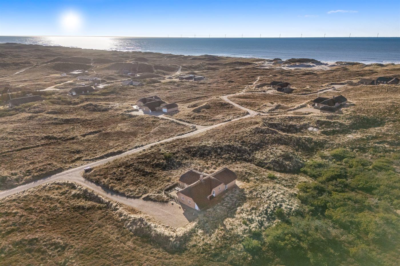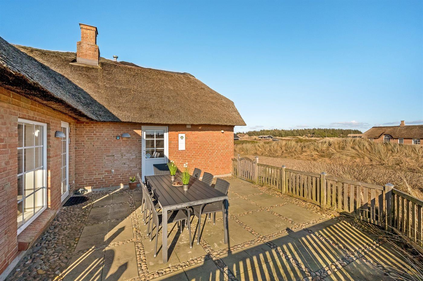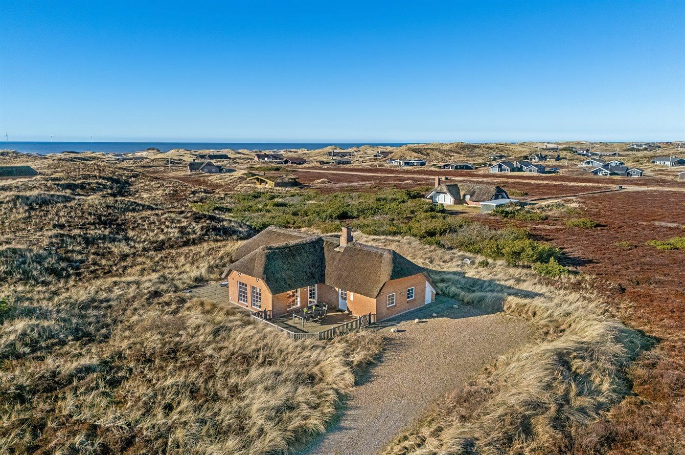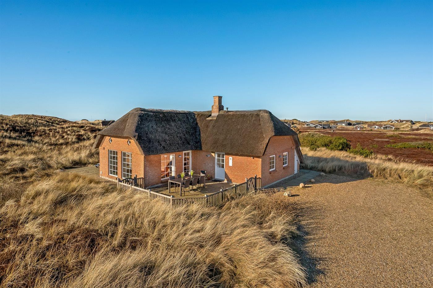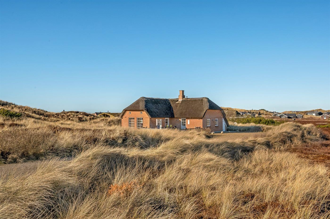 Fantastisches Ferienhaus mit Reetdach in wunderschöner Lage auf einem sehr großen Grundstück inmitten malerischer Natur. Das Haus liegt in einer Sackgasse zwischen Meer und Fjord – ganz in der Nähe von einem schönen Badestrand sowie dem Ortskern von Søndervig. Das Haus ist geschmackvoll eingerichtet und verfügt über viel Platz zum Entspannen und Beisammensein.