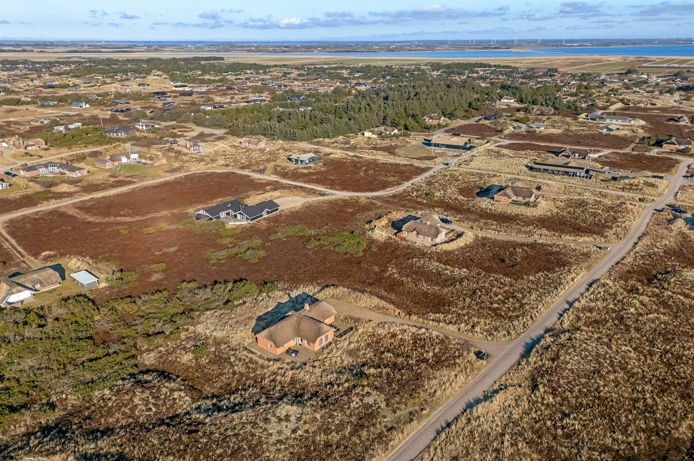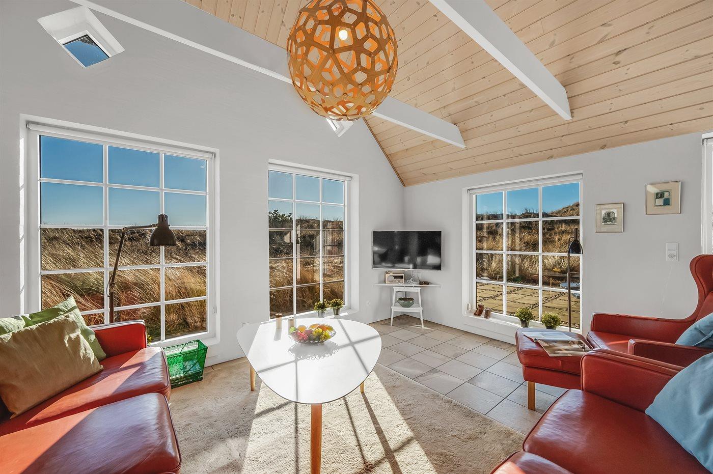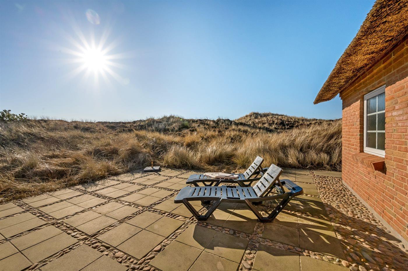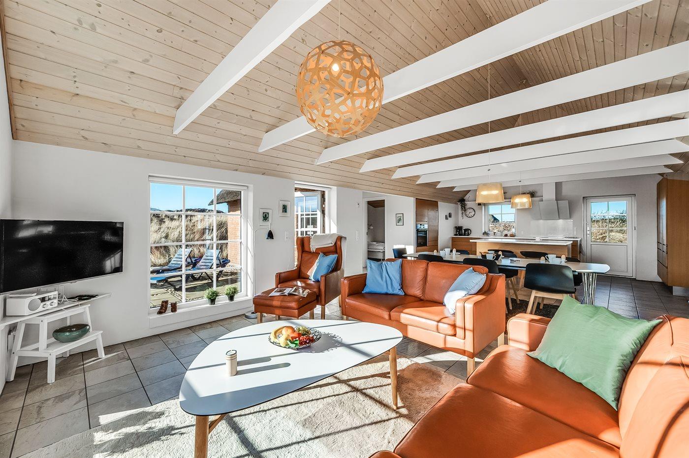 Fantastisches Ferienhaus mit Reetdach in wunderschöner Lage auf einem sehr großen Grundstück inmitten malerischer Natur. Das Haus liegt in einer Sackgasse zwischen Meer und Fjord – ganz in der Nähe von einem schönen Badestrand sowie dem Ortskern von Søndervig. Das Haus ist geschmackvoll eingerichtet und verfügt über viel Platz zum Entspannen und Beisammensein.