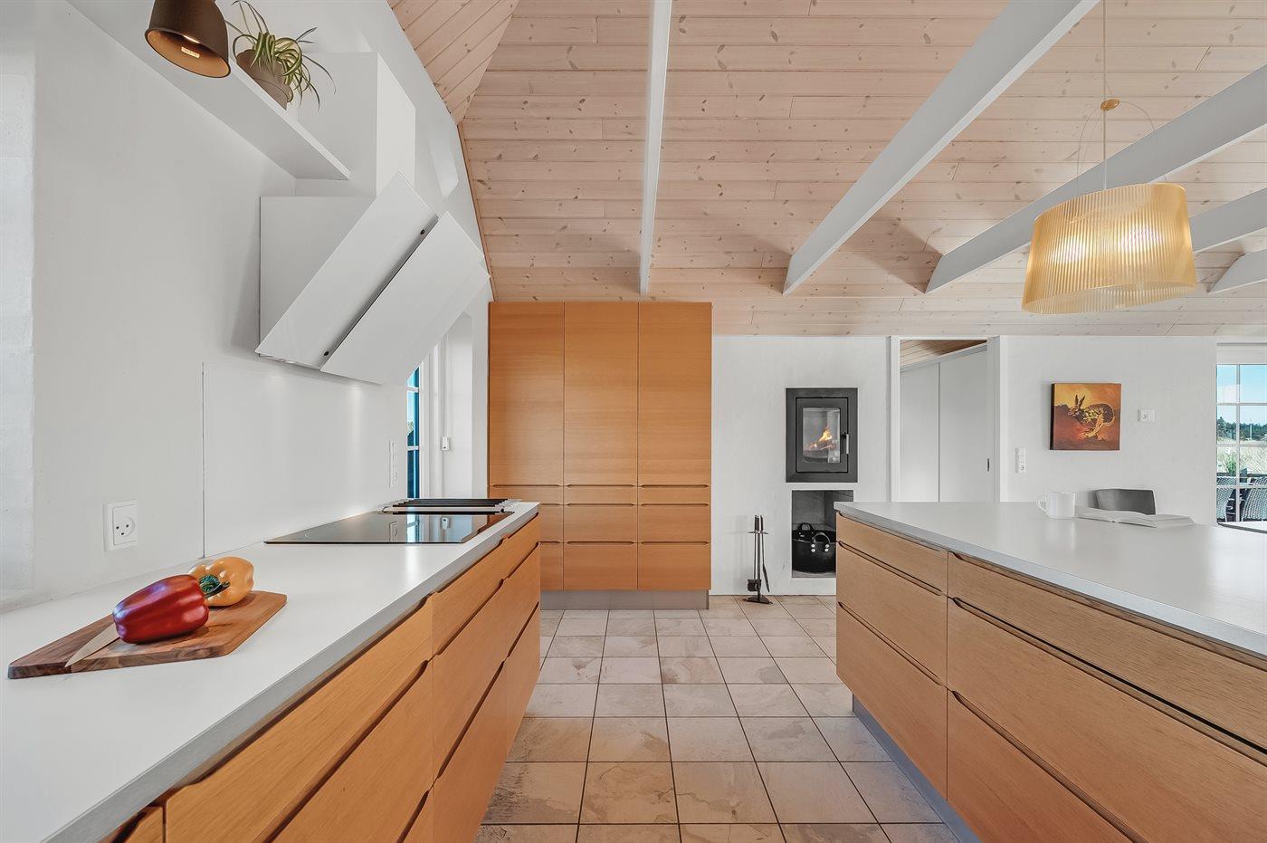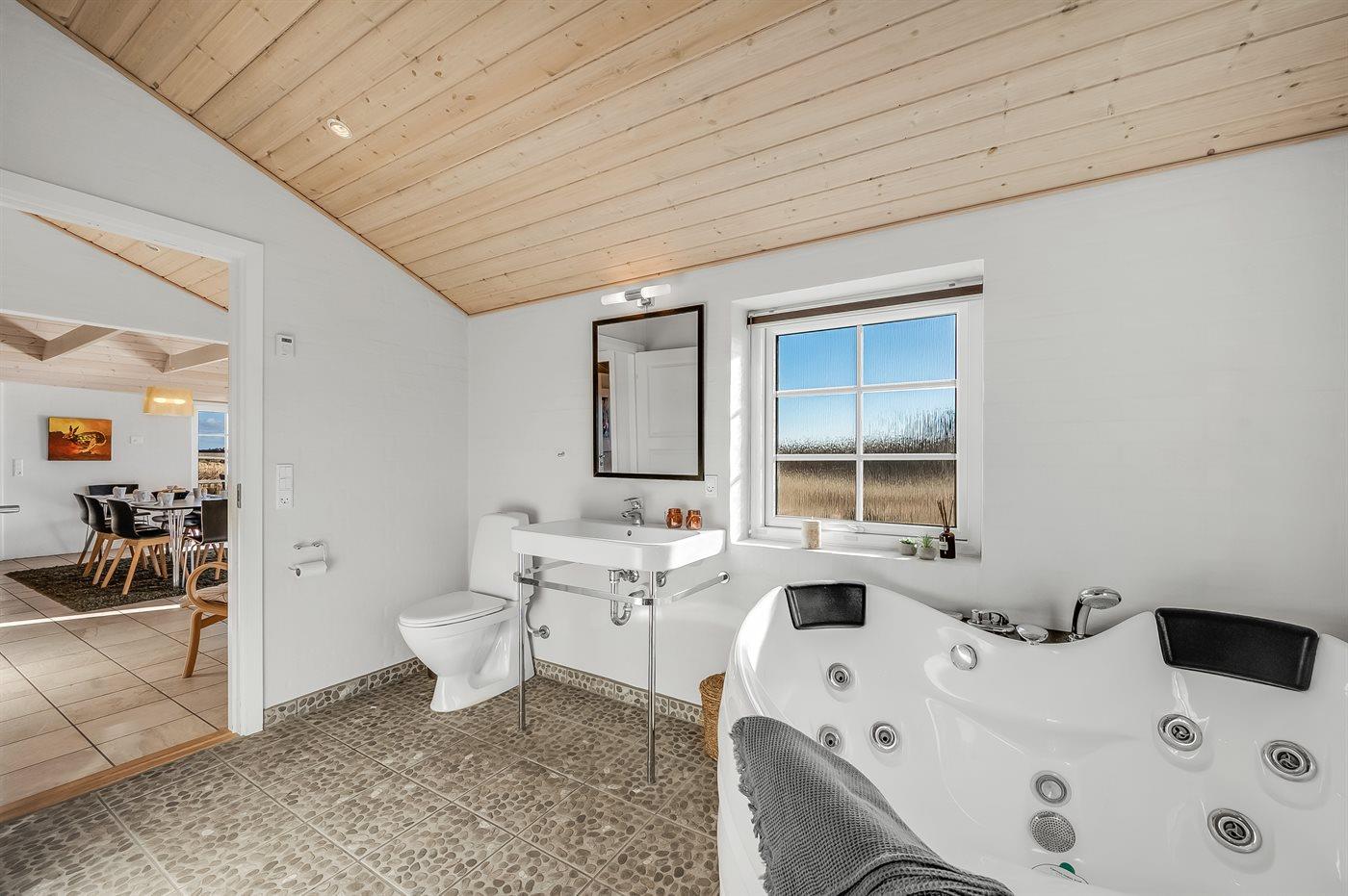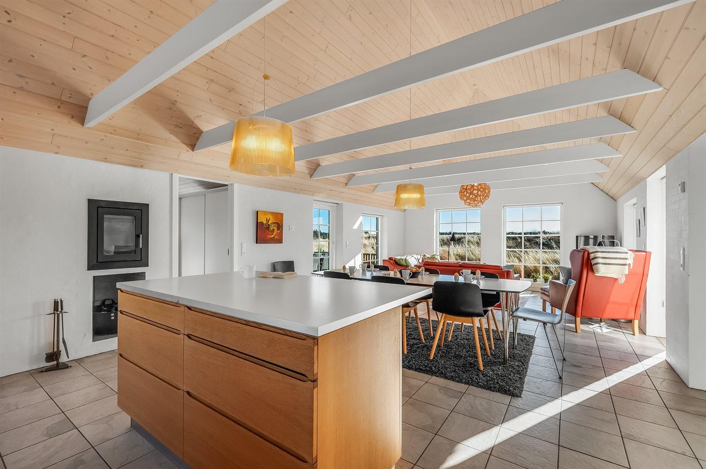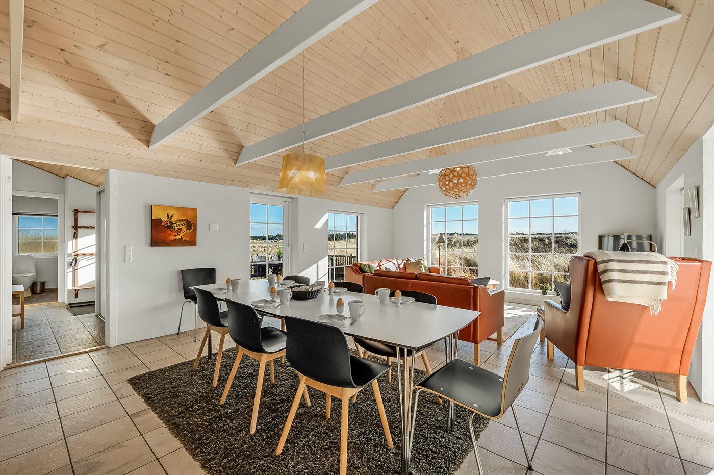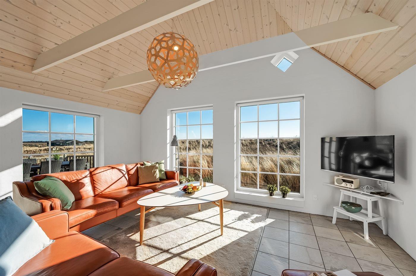 Fantastisches Ferienhaus mit Reetdach in wunderschöner Lage auf einem sehr großen Grundstück inmitten malerischer Natur. Das Haus liegt in einer Sackgasse zwischen Meer und Fjord – ganz in der Nähe von einem schönen Badestrand sowie dem Ortskern von Søndervig. Das Haus ist geschmackvoll eingerichtet und verfügt über viel Platz zum Entspannen und Beisammensein.