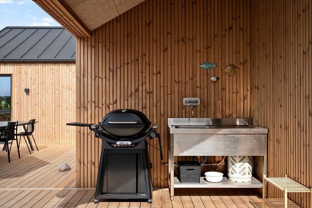Die gemütliche und luxuriöse Atmosphäre spürt man auch in Freien auf dem 1200 m2 großen Grundstück. Denn hier draußen wirst du von einer Holzterrasse begrüßt, die sich rund um das Haus erstreckt. Du findest immer ein geschütztes Eckchen zum Relaxen und es steht vieles an Gartenmöbeln und Liegestühlen zur Verfügung. Die Terrasse verfügt über mehrere überdachten Plätze, sodass du bei jedem Wetter die beeindruckende Natur genießen kannst und eine Umzäunung sorgt dafür, dass Kinder und Hunde unbesorgt im Außenbereich herumtollen können. Über den Outdoor-Whirlpool mit dazugehöriger Freiluftdusche, der besonders an dunklen Abenden für herrliche Erlebnisse unter dem Sternenhimmel sorgt, steht dir auch eine superpraktische Außenküche zu Verfügung. An schönen Sommertagen könnt ihr hier köstliche Abendessen zubereiten. In diesem Haus sind die Außenbereiche genauso ausgewählt wie die Innenbereiche- das absolute Total-Toll-Erlebnis für einen unvergesslichen Urlaub.