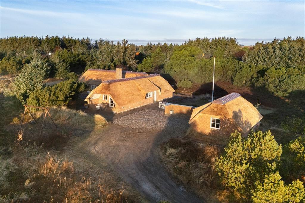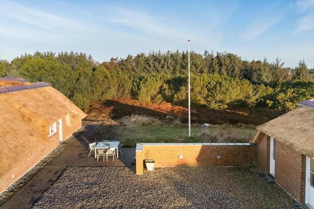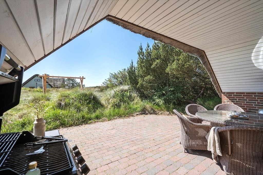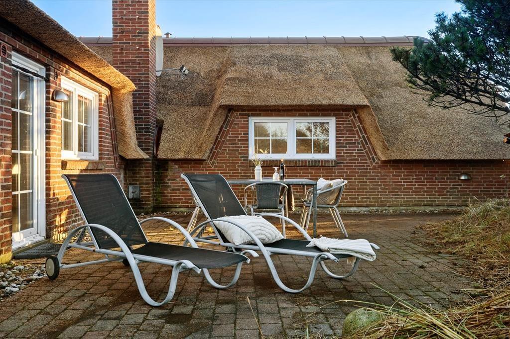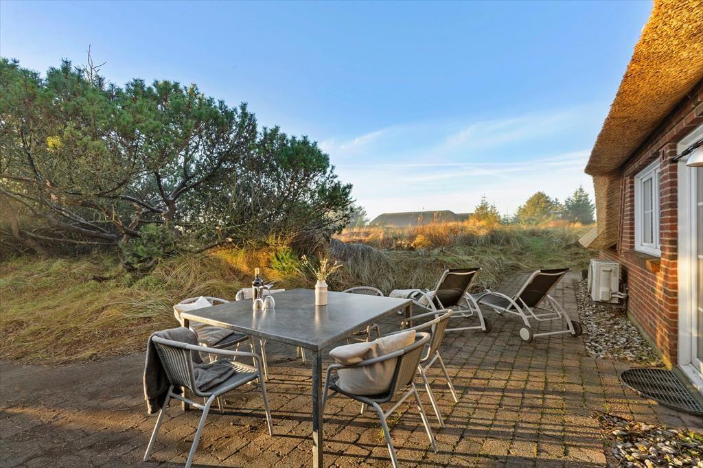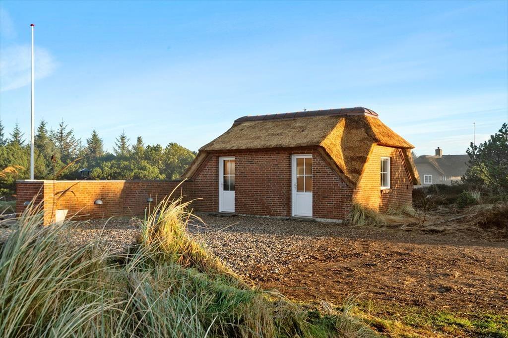 Sowohl das Sommerhaus als auch das dazugehörige Nebengebäude sind mit Strohdächern ausgestattet, sodass sich die Gebäude wunderbar in die wilde Vegetation des Naturgrundstücks und der Dünenlandschaft einfügen. Rund um das Haus stehen Ihnen mehrere schöne Terrassen und Sonnenplätze zur Auswahl, und da es sowohl im Wohnzimmer als auch im Esszimmer eine Gartentür gibt, können Sie bei Sonnenschein problemlos hinausschlüpfen. Wenn Sie Schatten benötigen oder bis in die späten Abendstunden im Freien sitzen möchten, kann das Abendleben in den überdachten Bereich der Terrassenumgebung verlagert werden. Neben Gartenmöbeln und Liegestühlen ist die Terrassenumgebung mit einem Grill ausgestattet, und auf der Kiesfläche haben Sie ausreichend Platz, Ihre Autos zu parken.