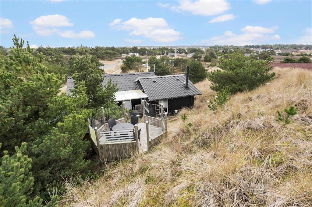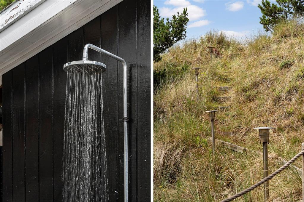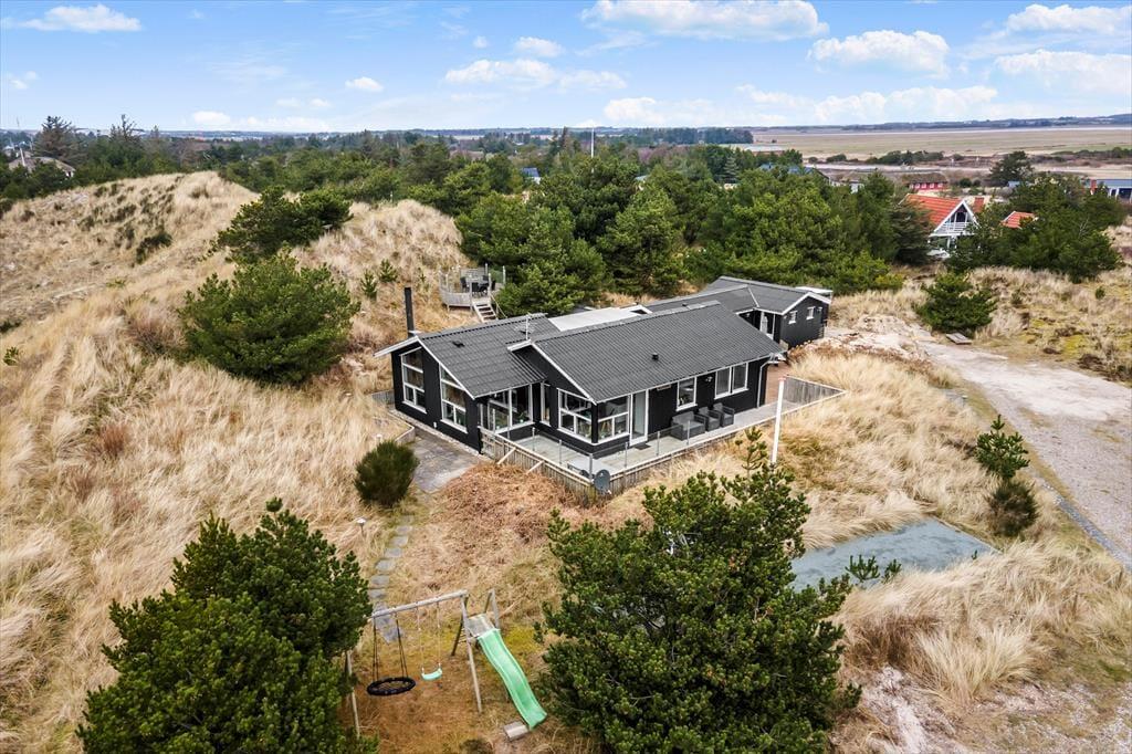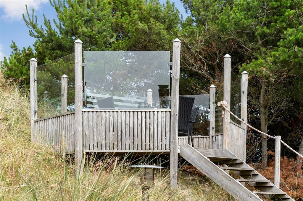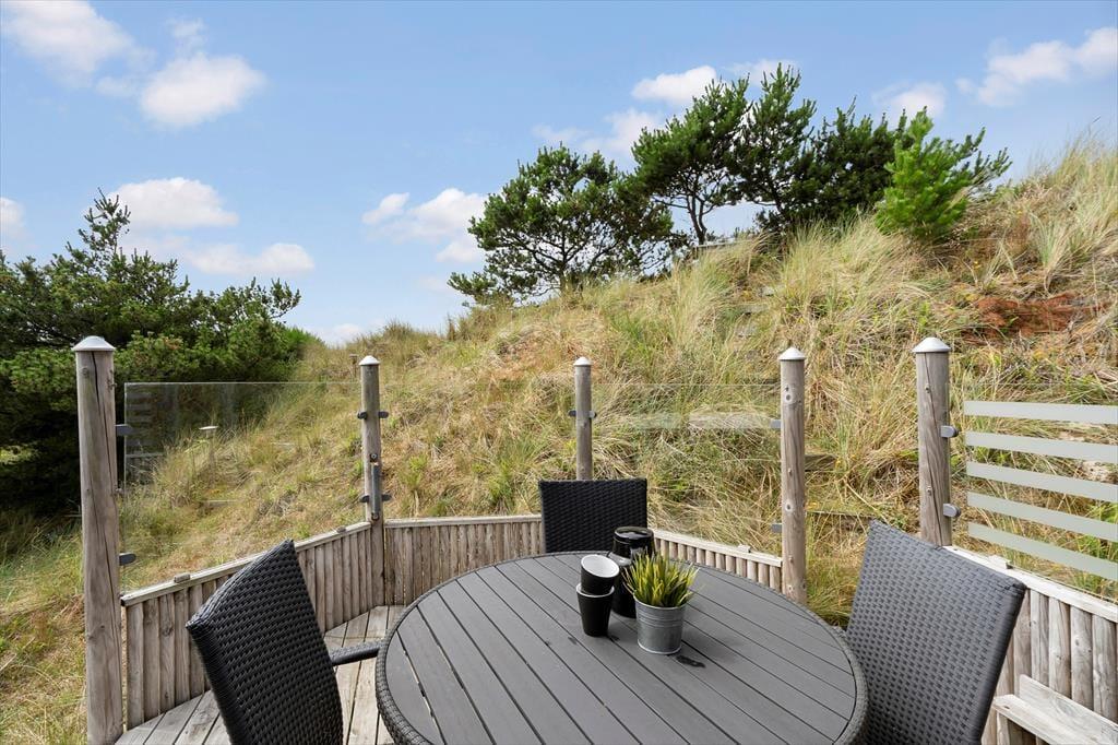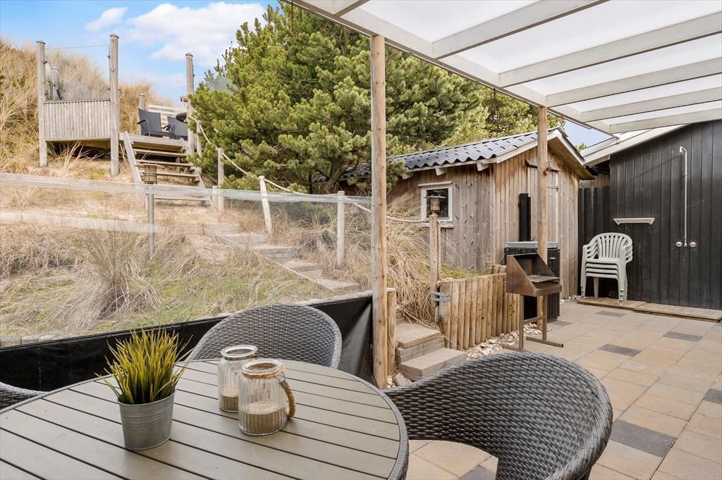 Das von Ihnen in der Küche zubereitete Essen genießen Sie bei schönem Wetter garantiert gern auf dem attraktiven Terrassenareal, das nahezu das gesamte Haus umgibt. Unter einer Überdachung steht ein Grill zur Verfügung. Ein Fischreinigungsplatz für Angler ist praktischerweise ebenfalls vorhanden. Dank der Bepflanzung und des hügeligen Naturgrundstücks sind die Außenbereiche am Haus wunderbar ungestört. Gleichzeitig genießen Sie einen reizvollen Blick - egal, ob Sie sich auf der schönen Aussichtsplattform niederlassen oder die weiter oben auf der Düne platzierte Bank nutzen. Gute Parkmöglichkeiten, eine Außendusche, eine Bocciabahn und ein Klettergerüst mit einer Nestschaukel rundet das attraktive Angebot unter freiem Himmel ab.
