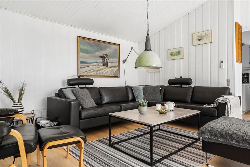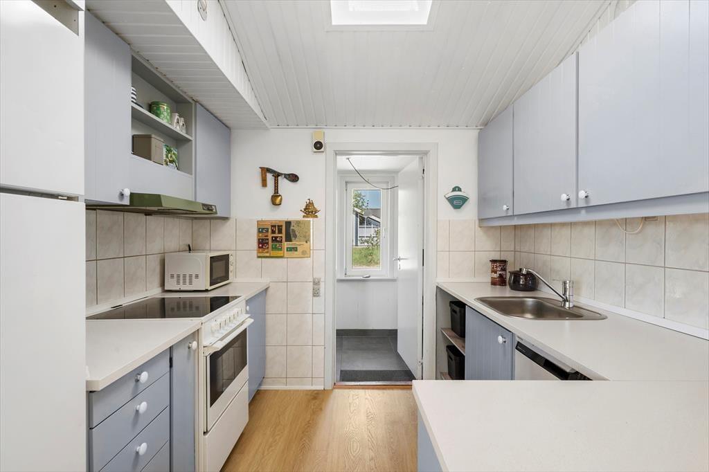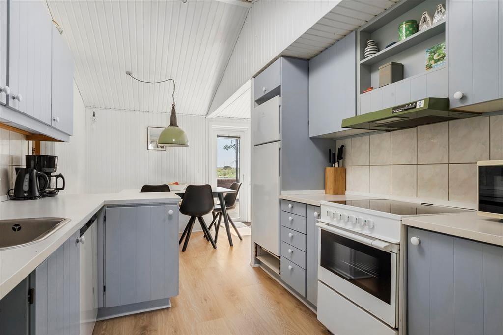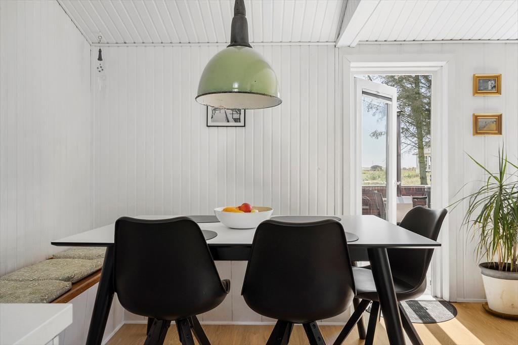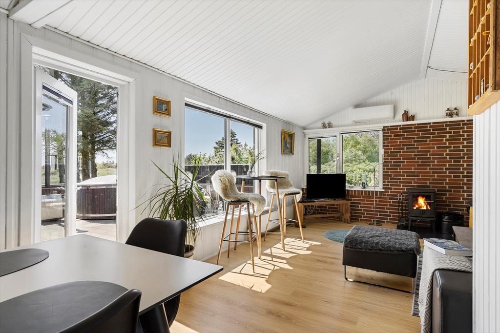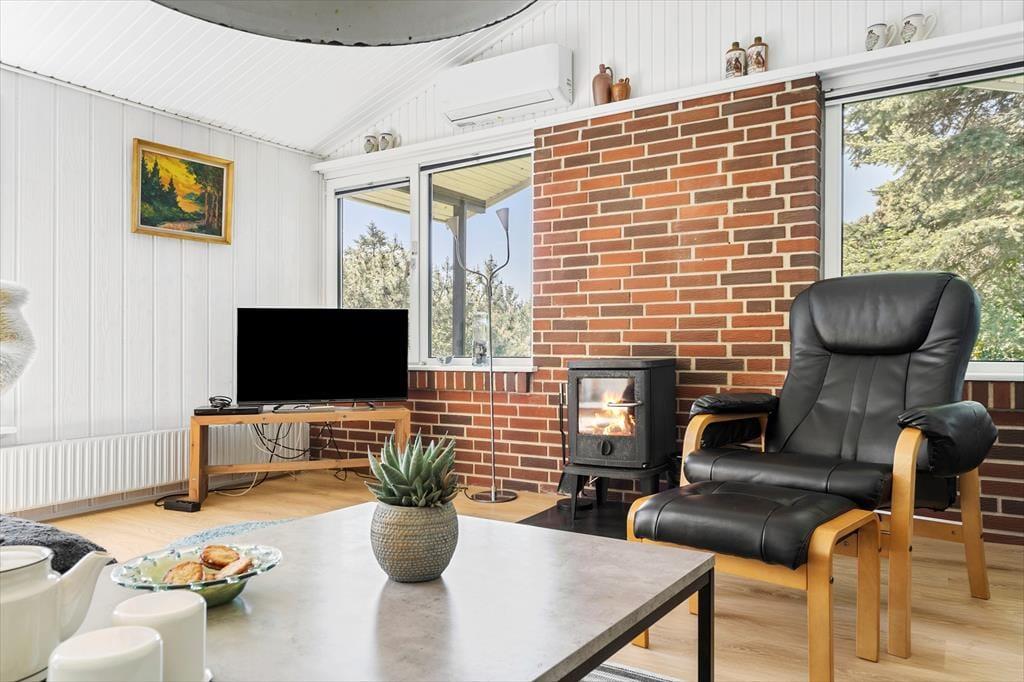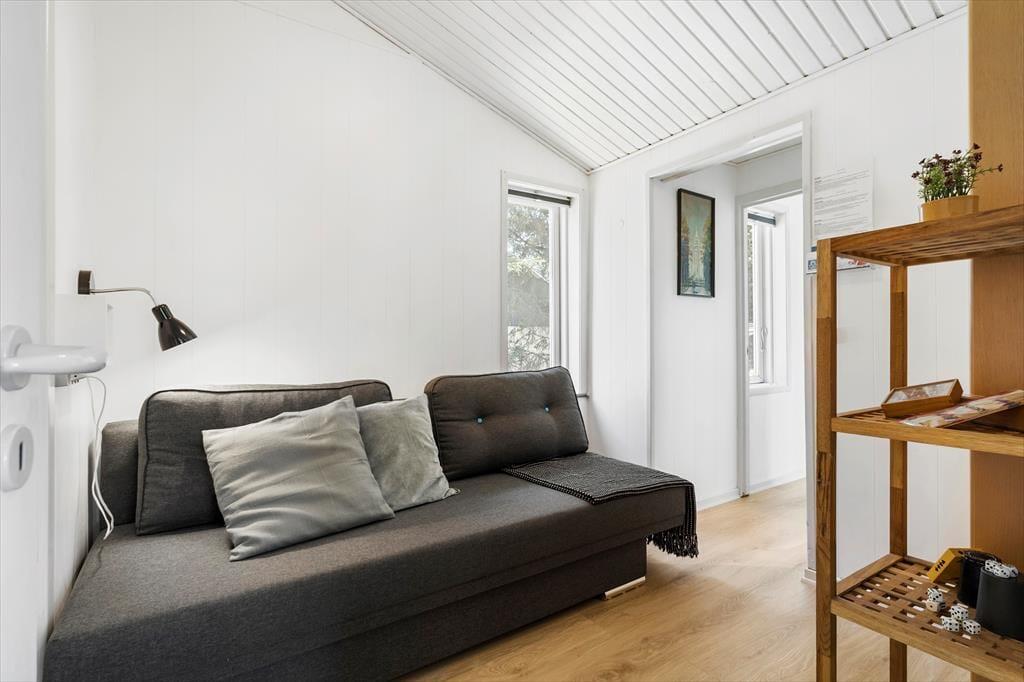 Das Sommerhaus liegt in ruhiger Umgebung an einer geschlossenen Straße und durch die Wohnzimmerfenster können Sie nicht nur auf das Naturgrundstück, sondern auch über die offene Feldlandschaft hinaus blicken. Im Innenbereich ist die Einrichtung überwiegend in gedeckten und hellen Tönen gehalten. Die Möbel sind ansprechend und bequem, denn eine behagliche Atmosphäre gehört dazu, wenn man sich im Wohnzimmer mit einem spannenden Roman oder einem vergnüglichen Film auf dem Flachbildfernseher zurücklehnt. Die Essecke mit Bänken und Stühlen ist ein gemütlicher Treffpunkt für die ganze Familie – und diese ist sehr praktisch direkt neben der Küche platziert. Das Plaudern kann also problemlos fortsetzen, während Sie nochmal Kaffee aufsetzen oder ein weiteres Ei zum Brunch bereiten.