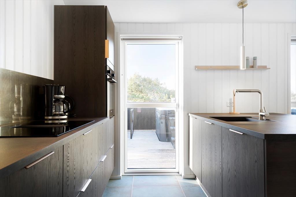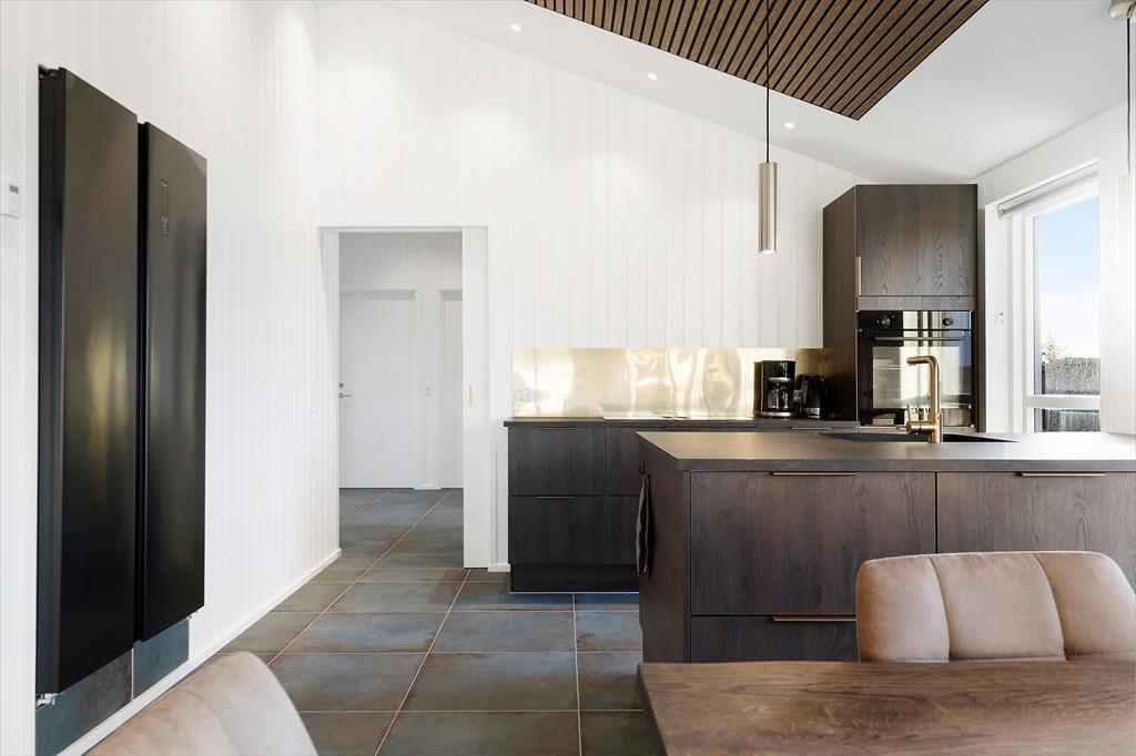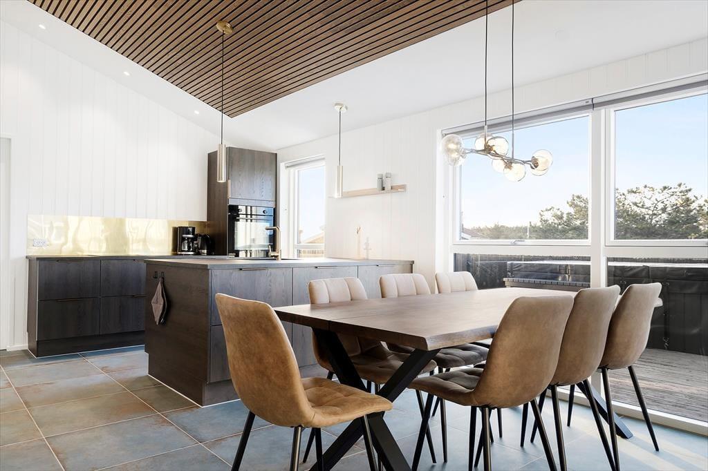 Als das 120 m2 große Ferienhaus im Jahre 2023 gebaut und eingerichtet wurde, wurden die besten Materialien und die schönste Innenausstattung verwendet. Sowohl von innen als auch von außen wirkt das Ferienhaus daher unglaublich stilvoll und es gibt viele schöne Details – schauen Sie sich nur die schönen, großen Bodenfliesen mit integrierter Heizung und die eleganten Schranklösungen an, die sich in der Küche wiederholen. in den beiden Badezimmern und in den Schlafzimmern. Es gibt drei Schlafzimmer, die zusammen Platz für acht Personen bieten, sodass Sie die Möglichkeit haben, Freunde oder Familie in den Urlaub einzuladen. Sowohl Kinder als auch kindliche Seelen können sich über einen Aktivitätsraum mit Airhockey freuen, und die Sauna wird sicher auch ein Hit sein. Auch das Wohnzimmer, in dem Wohnzimmer und Küche untergebracht sind, lädt zum Verweilen ein, nicht zuletzt wegen des schönen Lichts und der schönen Aussicht, die die Fenster freigeben.
