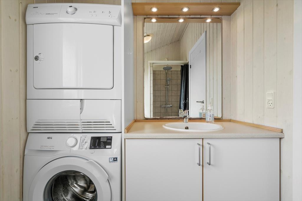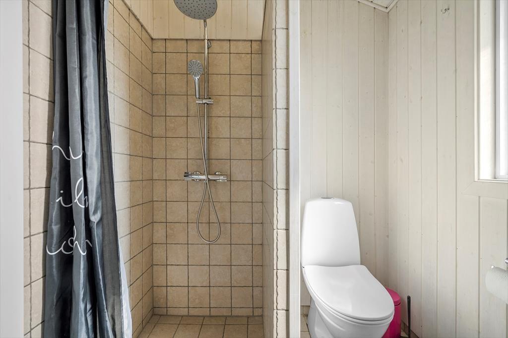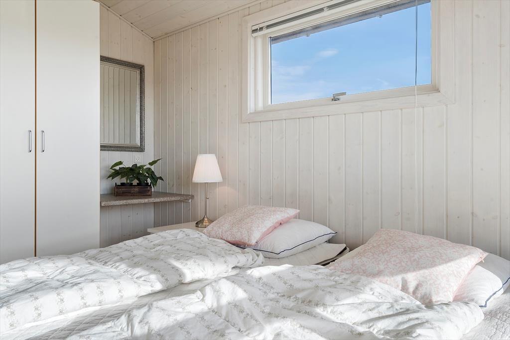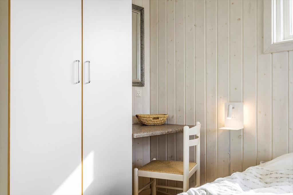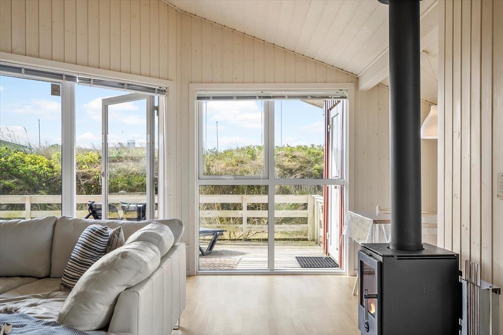 Sletten 15 bietet klassische Ferienhausatmosphäre für wenig Geld, mit hohen Decken und heller Holzvertäfelung an den Wänden. Und falls das Wetter sich mal von seiner launigen Seite zeigt, sorgt der Kaminofen im Wohnzimmer für Behaglichkeit und Wärme. Durch die große Fensterfront auf der Südseite blickt man direkt ins Grüne der Natur und kann an sonnigen Tagen vom Wohnzimmer aus die Terrasse betreten. Das Bad ist schön und praktisch mit Dusche und Waschbecken ausgestattet und wenn es Zeit ist, ins Bett zu gehen, kann man sich auf einen guten und langen Schlaf in den beiden komfortablen Schlafzimmern des Hauses freuen.