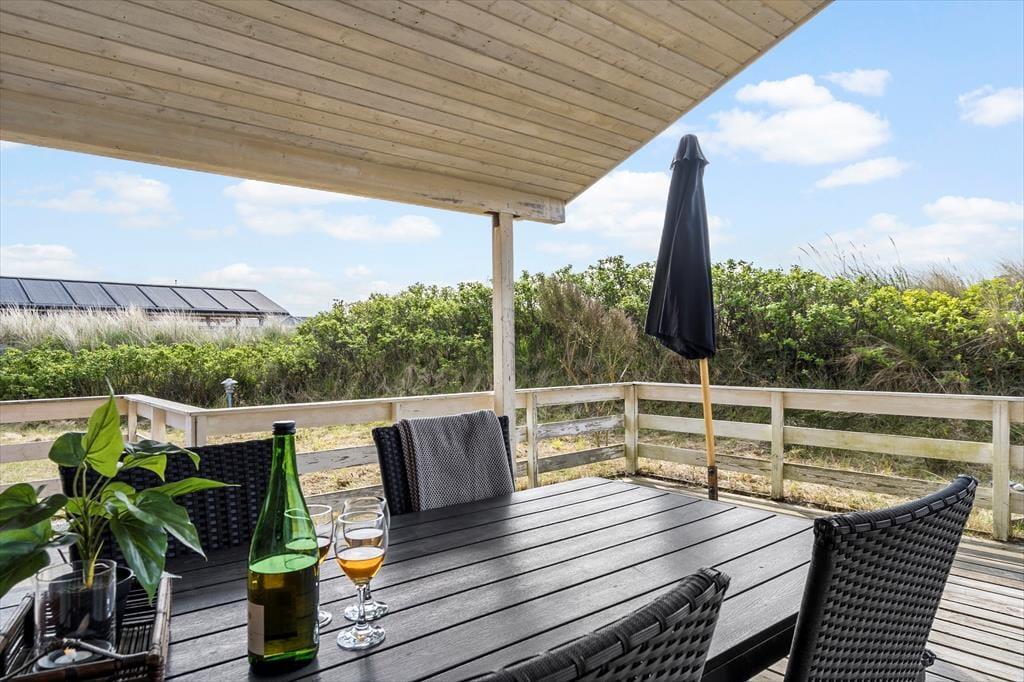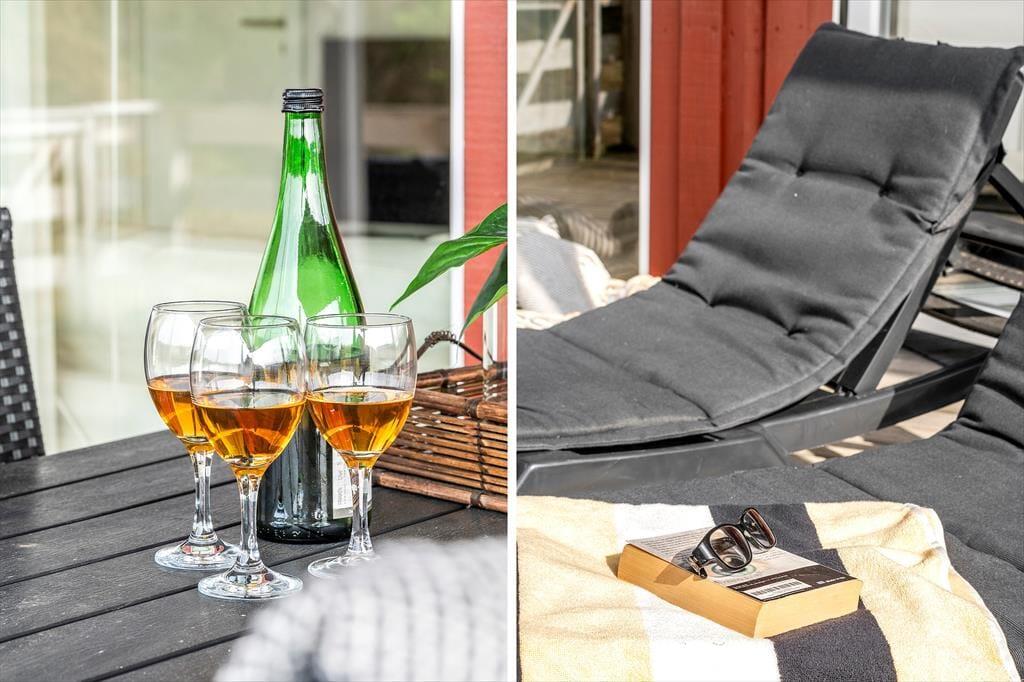 Wie bereits erwähnt, hat man vom Wohnzimmer aus direkten Zugang zu einer schönen Terrasse. Sie ist teilweise überdacht und erstreckt sich sowohl nach Süden als auch nach Osten. Mit Sonnenliegen, Gartenmöbeln und Grill ist sie für sommerliche Gemütlichkeit bestens ausgestattet. Die Terrasse ist komplett eingezäunt, was sowohl für Hundebesitzer als auch für Familien mit kleinen Kindern von Vorteil sein kann. Die Hagebuttensträucher und andere Pflanzen auf dem Naturgrundstück sorgen dafür, dass Sie sich in einer recht privaten Umgebung entspannen können.