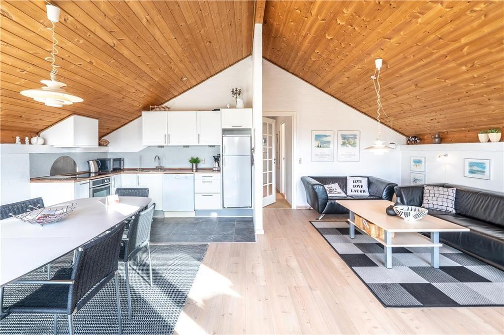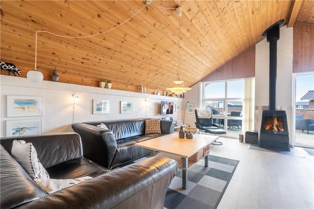 Das Herzstück des Hauses ist die große Wohnküche, die offen mit dem Wohnzimmer verbunden ist. Das Wohnzimmer ist geschmackvoll und einfach eingerichtet und lädt zum Entspannen ein: Hier steht ein schöner Holzofen mit großer Glasscheibe, damit Sie das Feuer bewundern können, während Sie an einem kalten Tag Wärme verbreiten. Vor den Fenstern steht ein guter Sessel, damit Sie es können Vertiefen Sie sich in ein gutes Buch oder lassen Sie einfach die Seele baumeln, während Sie auf das Dünennetz im Westen blicken. Wenn Sie unterhalten werden möchten, können Sie sowohl deutsche als auch dänische Kanäle auf dem Flachbildfernseher sehen oder das kostenlose WLAN nutzen. Das Ferienhaus hat auch eine neue und leckere Sauna und das Badezimmer ist gut ausgestattet mit Dusche und Waschmaschine. Es gibt 3 gute Zimmer - eines mit Doppelbett, das andere mit 2 Einzelbetten - die zu einem Doppelbett zusammengestellt werden können und das dritte Zimmer hat zwei Einzelbetten.