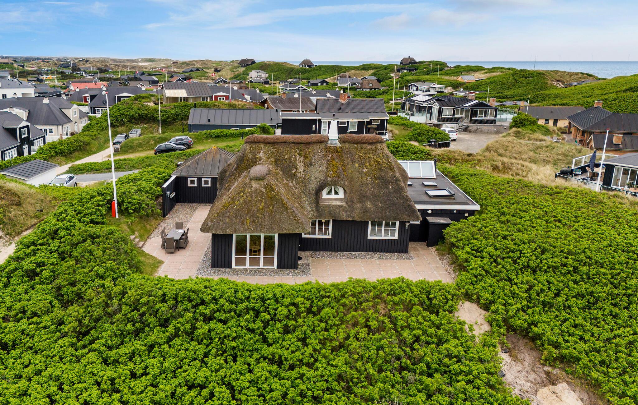 Stilvolles Reetdachhaus in Søndervig mit gemütlichem Kamin und Nähe zum Meer für entspannte Urlaubstage.