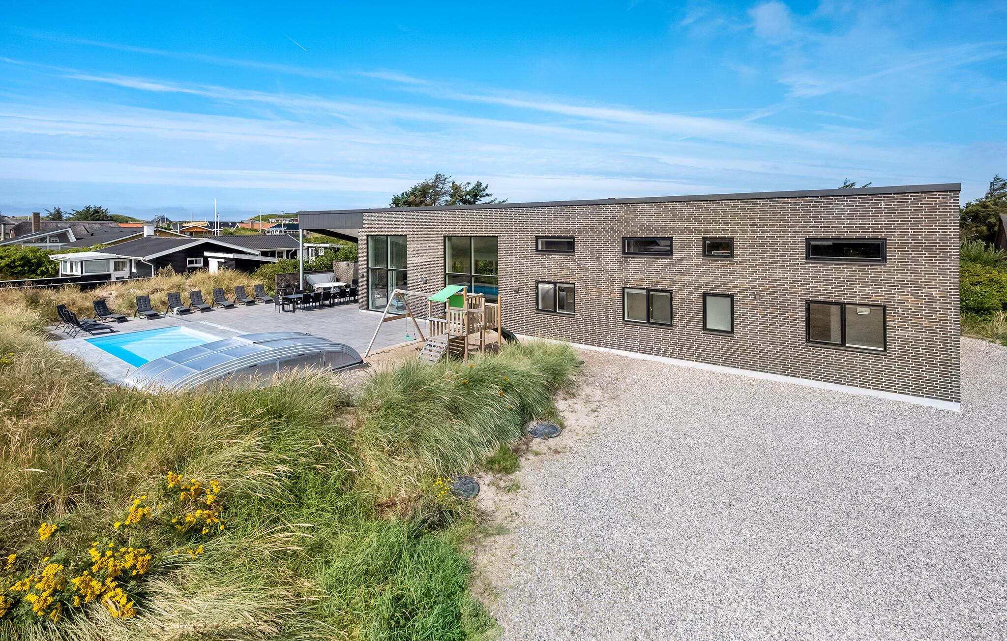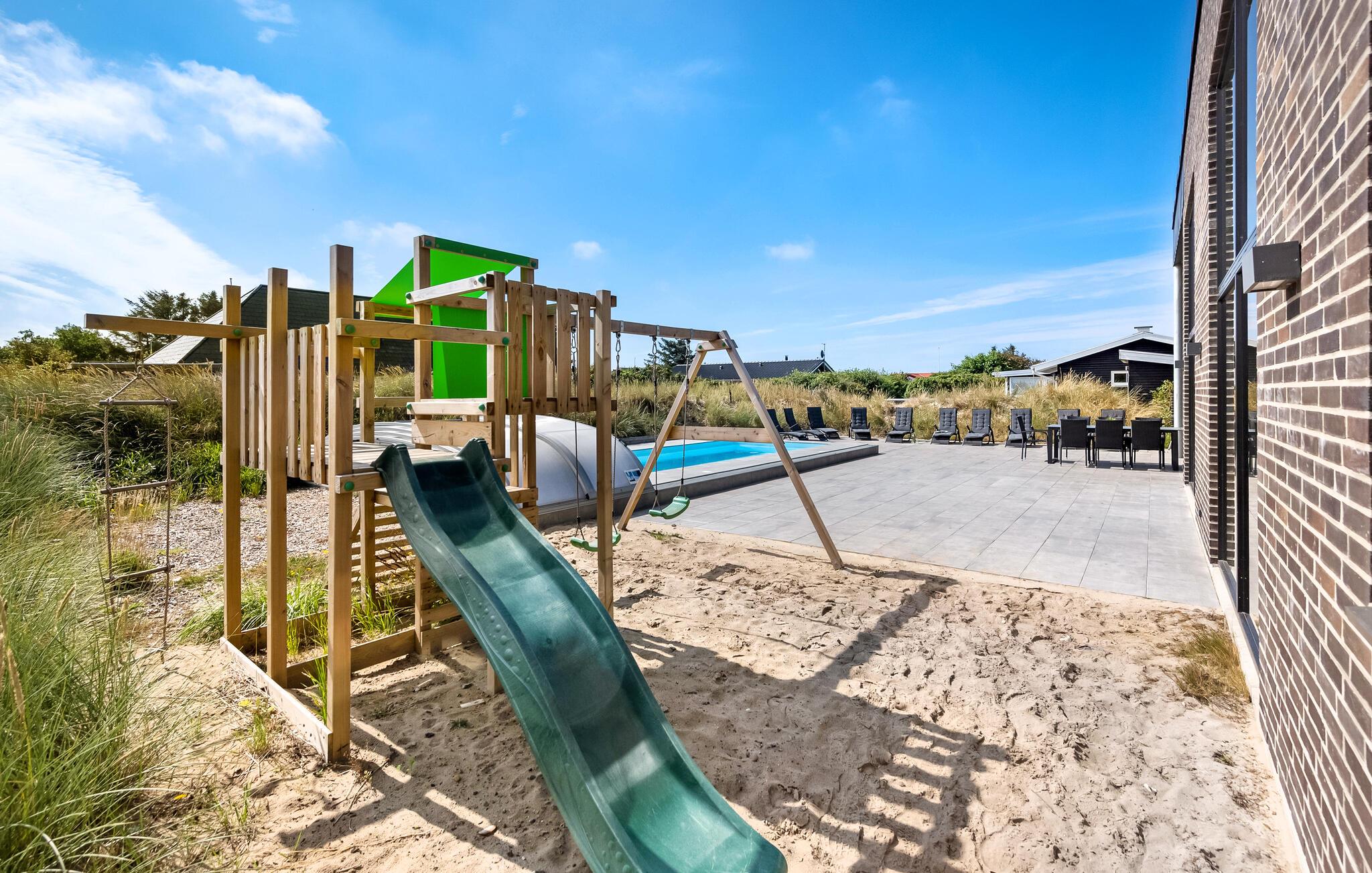 Im von sanften Dünen umgebenen Außenbereich erwarten Sie stimmungsvolle Grillabende, wohlige Momente im Whirlpool und erfrischende Erlebnisse im Pool. Lassen Sie die Kinder auf dem Spielplatz toben und plaudern Sie bei einem Glas Wein über vergangene Zeiten.