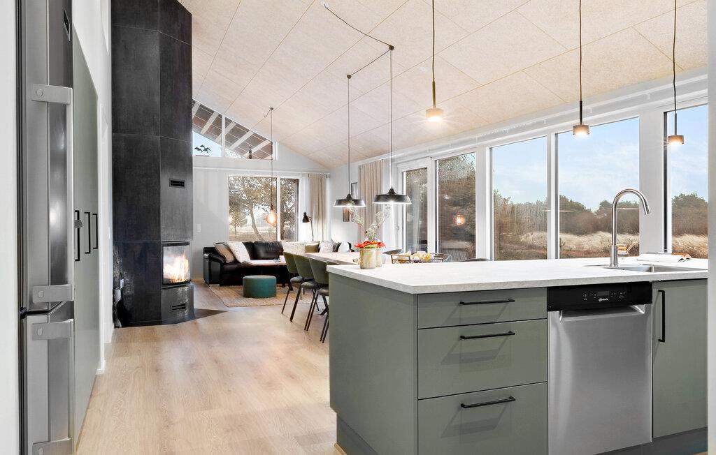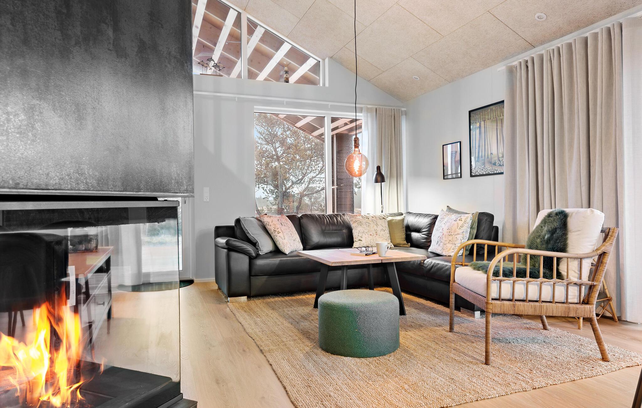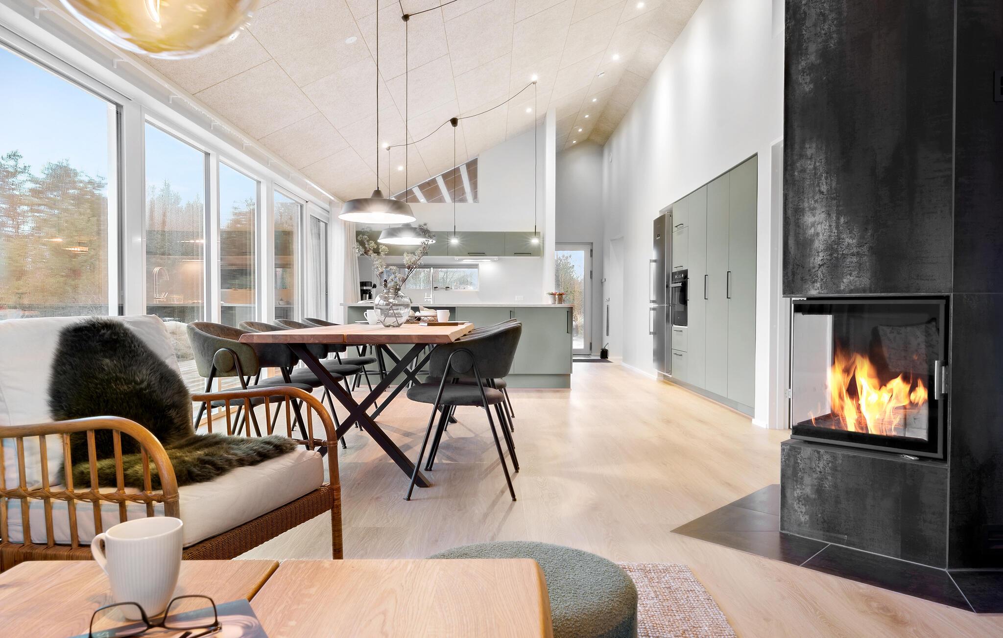 Ihr Ferienhaus in Søndervig erwartet Sie zu einem wundervollen Urlaub mit einem Hauch von Luxus. Genießen Sie hier die Ruhe und den Komfort, während Sie sich von der beeindruckenden Schönheit und Vielfalt der dänischen Westküste verzaubern lassen. Der lichtdurchflutete Wohnbereich mit den großen Fensterfronten bietet mit seinem großzügigen Esstisch und einer gemütlichen Sofaecke den idealen Rahmen für entspannte Stunden und gesellige Zusammenkünfte. Machen Sie es sich vor dem knisternden Kaminofen bequem und lassen Sie den Tag gemütlich ausklingen.